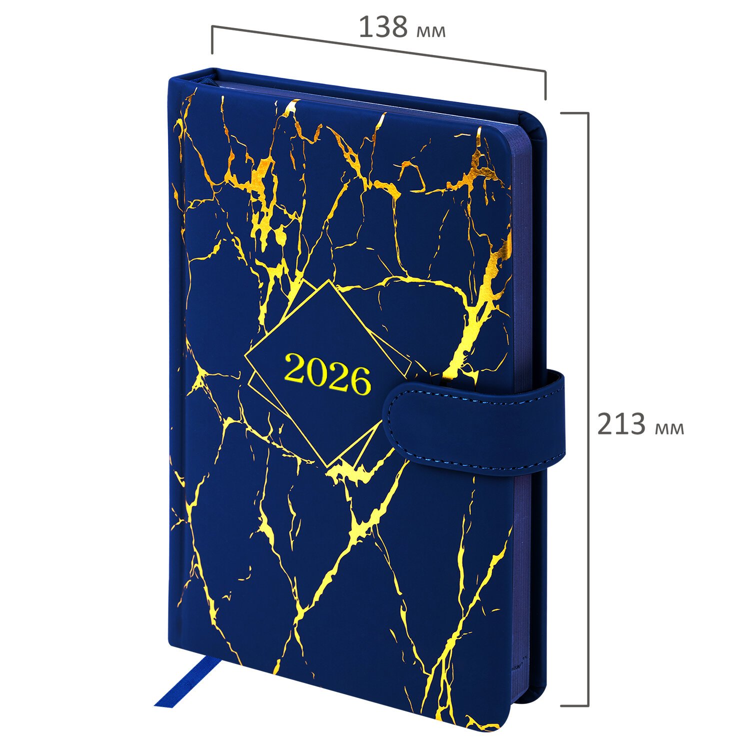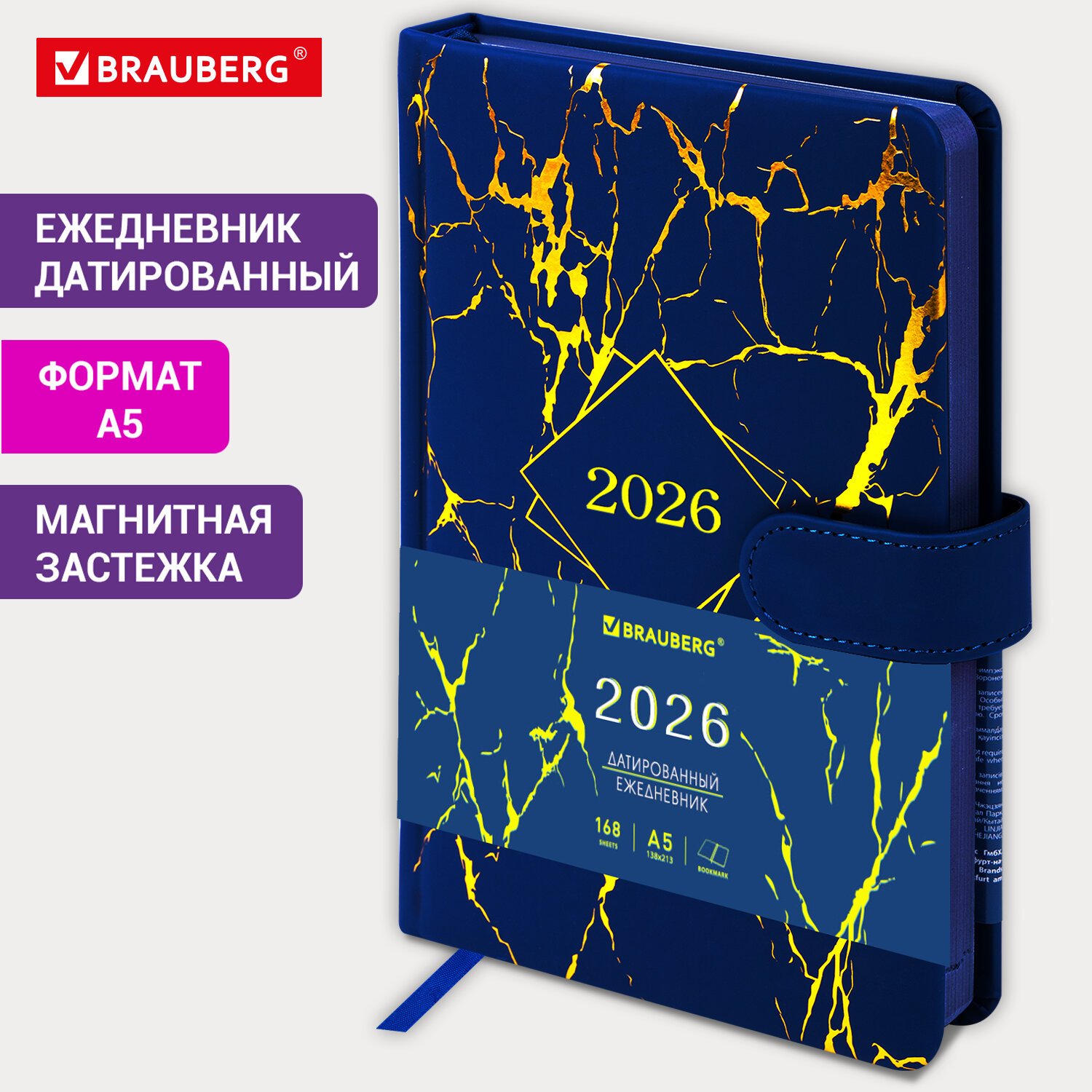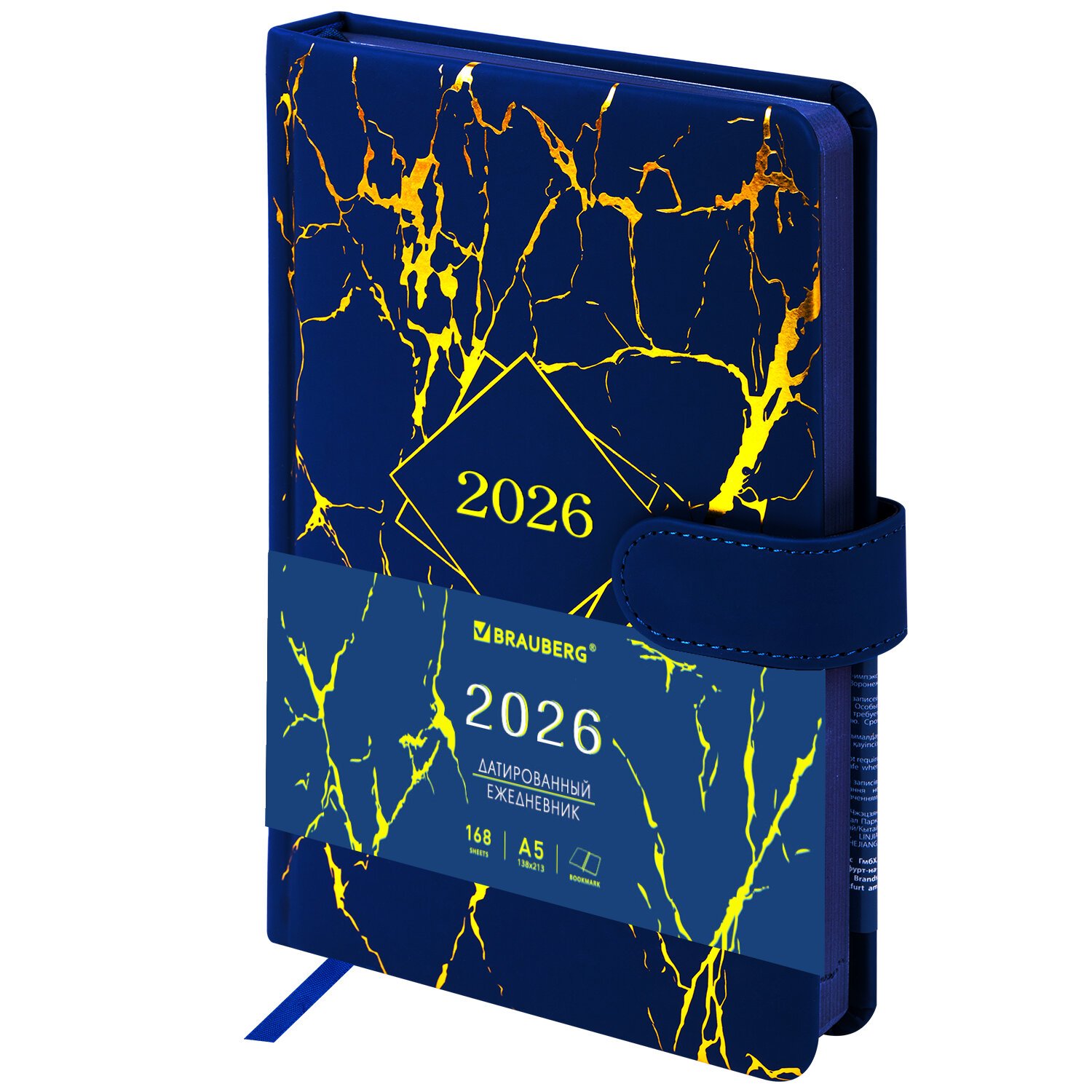 Ежедневник датированный 2026 А5 138x213мм BRAUBERG Goldy, под кожу, цветной срез, синий, 117472