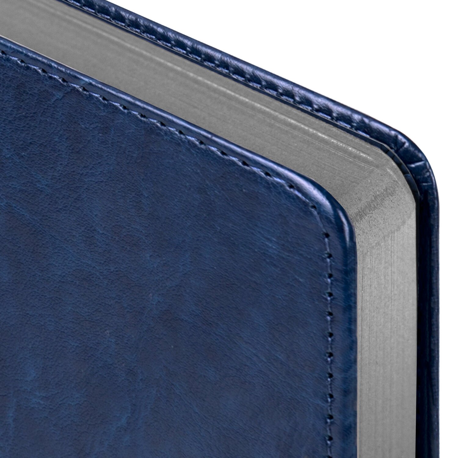 Твердая обложка стилизована под гладкую кожу синего цвета. Материал обложки подходит для горячего тиснения. Для удобства пользования ежедневник снабжен держателем для ручки. Цветной срез в контраст обложки придает ежедневнику особый шарм. Дополнением является закладка-ляссе, с помощью которой при необходимости можно быстро открыть ежедневник на нужной странице. Ежедневник снабжен обширным справочным материалом. В конце имеются 4 страницы для записей и заметок.