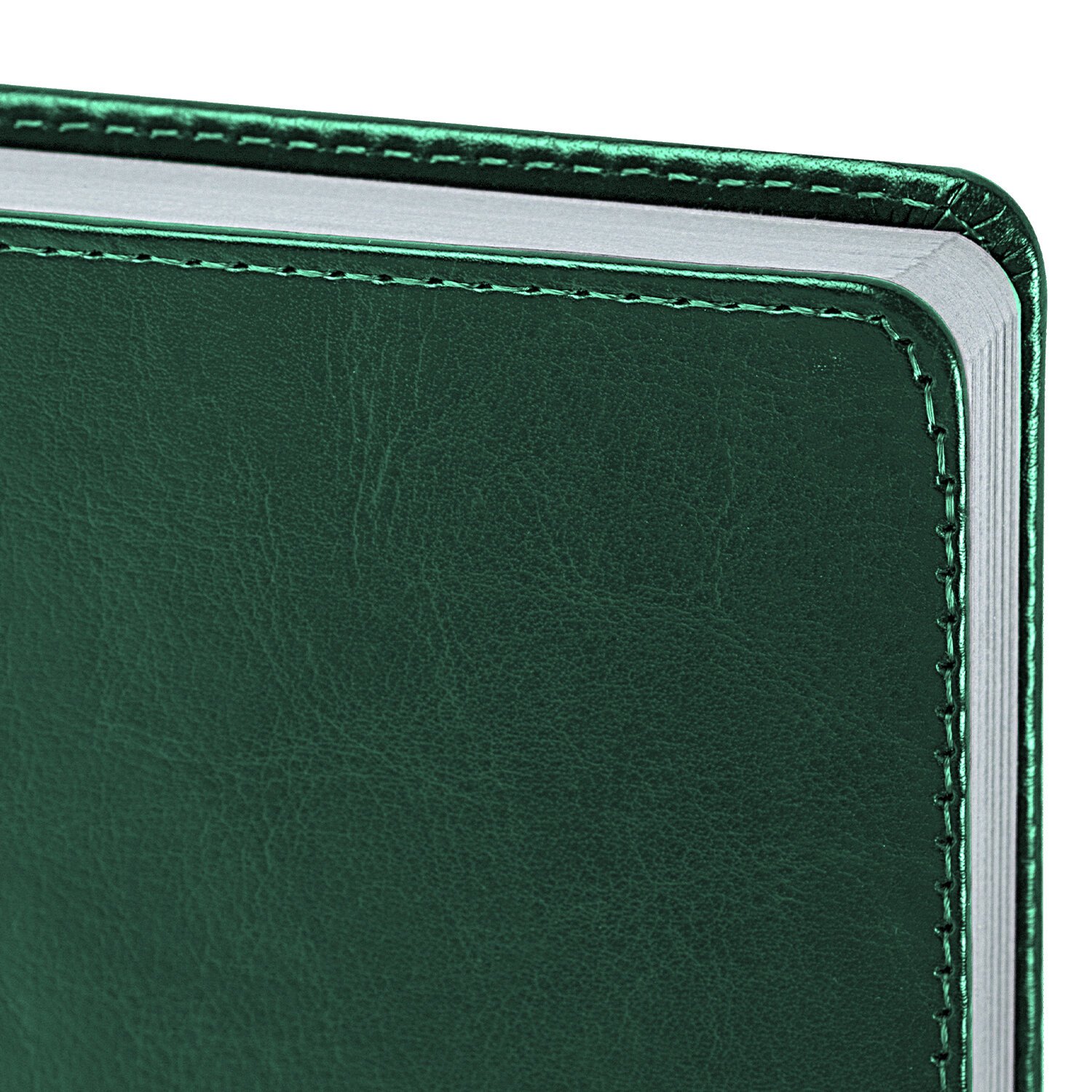 Твердая обложка стилизована под гладкую кожу темно-зеленого цвета. Материал обложки подходит для горячего тиснения. Для удобства пользования ежедневник снабжен держателем для ручки. Цветной срез в контраст обложки придает ежедневнику особый шарм. Дополнением является закладка-ляссе, с помощью которой при необходимости можно быстро открыть ежедневник на нужной странице. Ежедневник снабжен обширным справочным материалом. В конце имеются 4 страницы для записей и заметок.