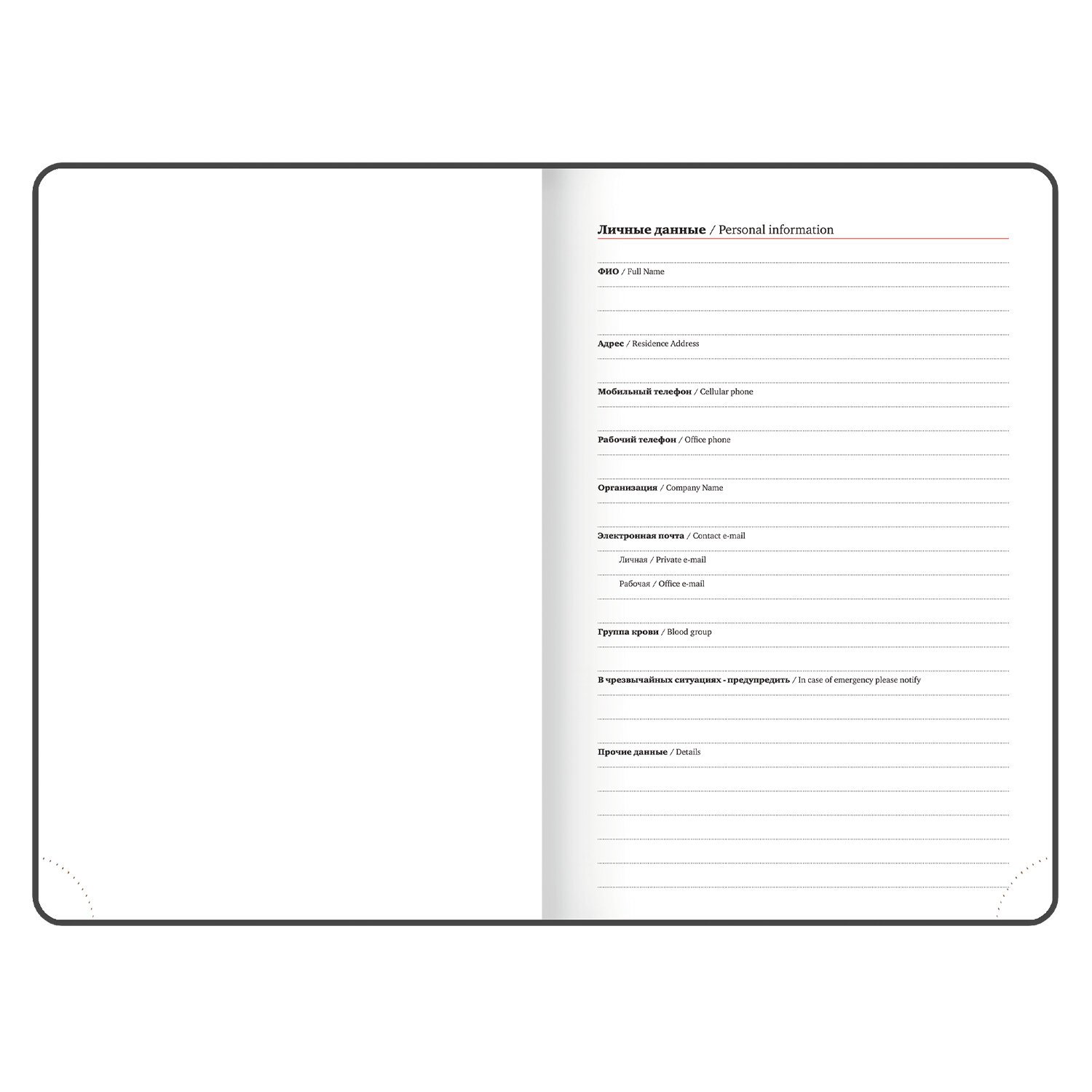 Внутренний блок включает 168 листов белой бумаги плотностью 70 г/м2. Каждая страничка имеет перфорированный угол. Благодаря стандартному формату А5 (138х213 мм) ежедневник удобно использовать как в офисе, так и на выездных деловых встречах.