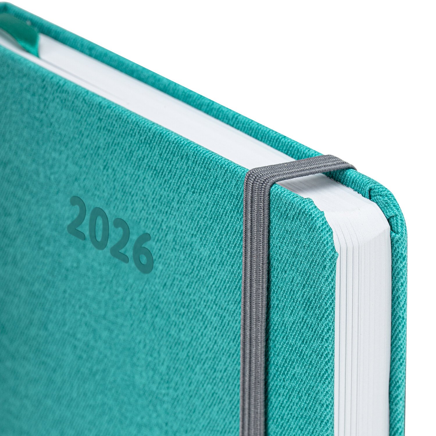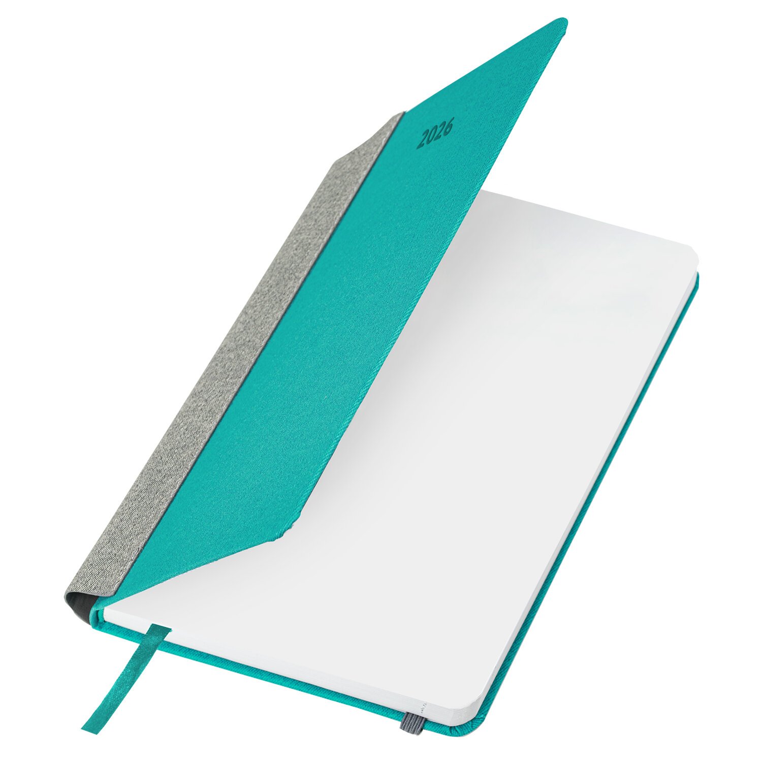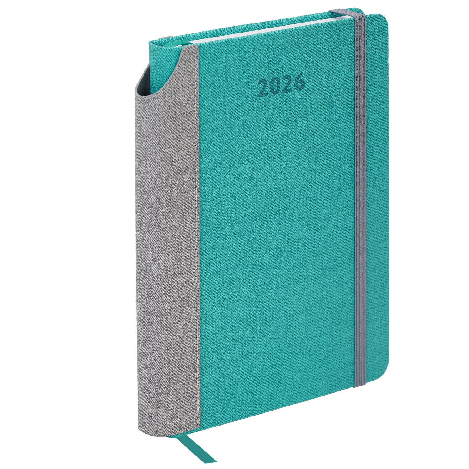 Выполнен в стильном сочетании бирюзового и серого цветов. Жесткая книжная обложка стилизована под искусственную кожу с текстурой льна, фиксируется резинкой, поэтому ежедневник не откроется в сумке или портфеле и страницы не помнутся. Материал обложки подходит для горячего тиснения. Для удобства пользования ежедневник снабжен карманом для фиксации ручки. Дополнением является закладка-ляссе, с помощью которой при необходимости можно быстро открыть ежедневник на нужной странице.