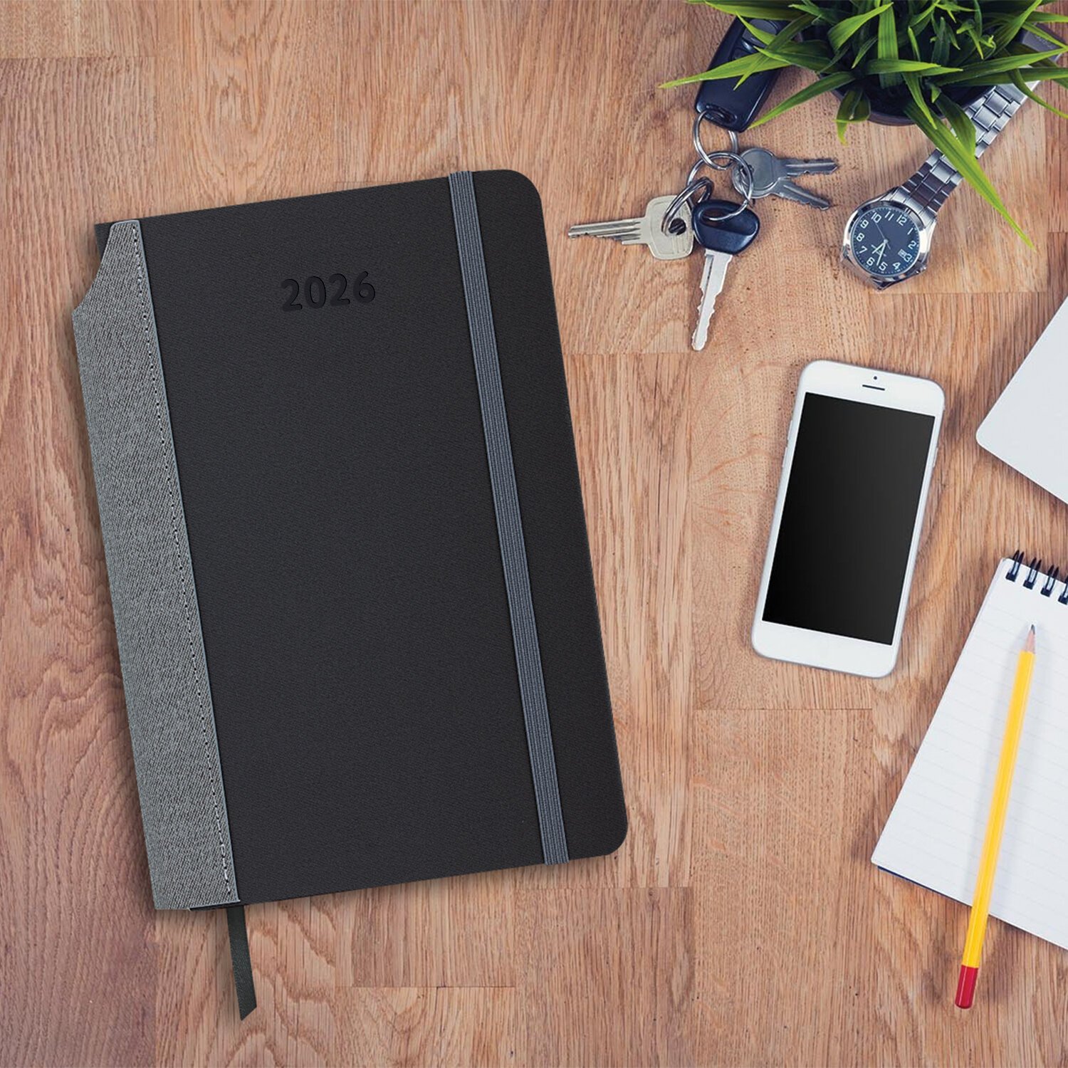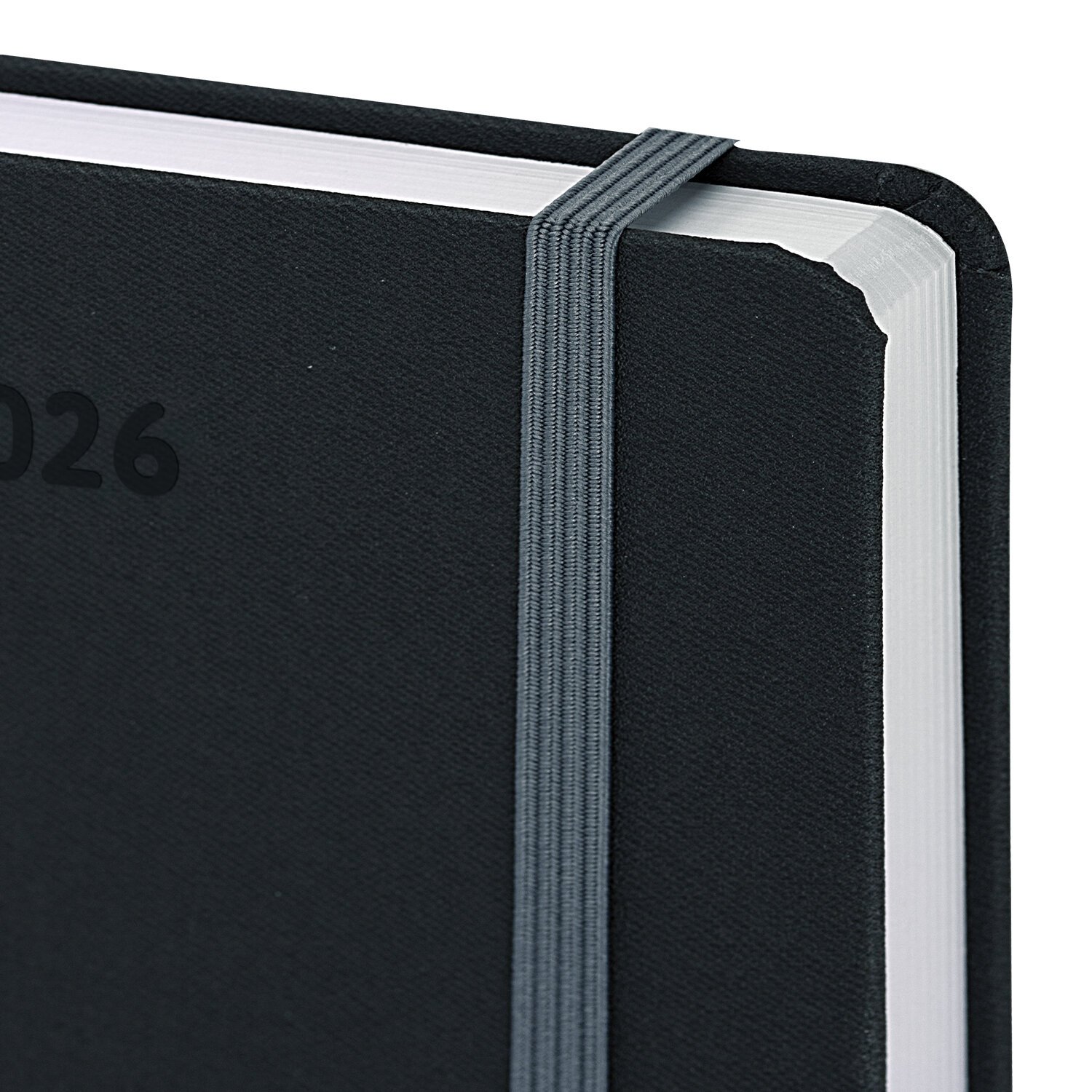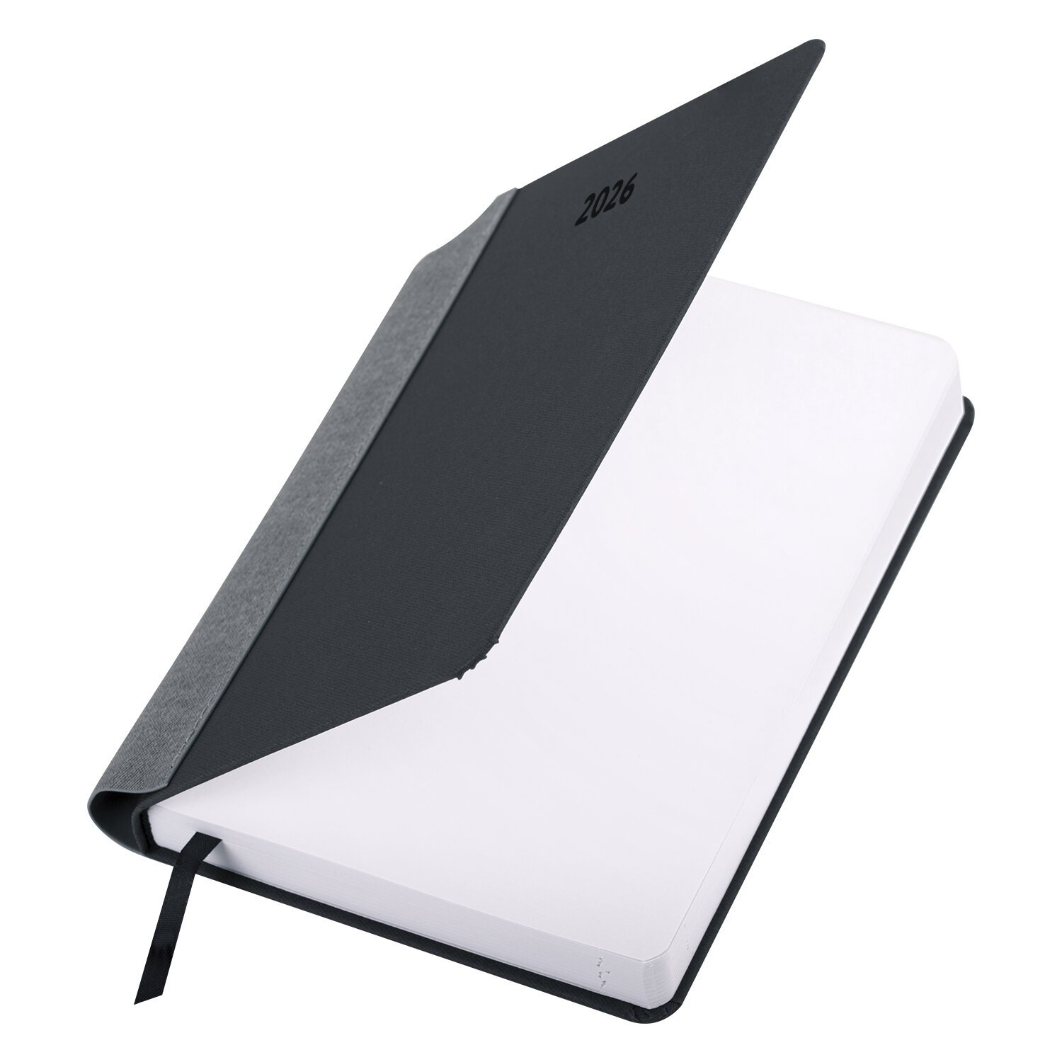 Выполнен в стильном сочетании черного и серого цветов. Жесткая книжная обложка стилизована под искусственную кожу с текстурой льна, фиксируется резинкой, поэтому ежедневник не откроется в сумке или портфеле и страницы не помнутся. Материал обложки подходит для горячего тиснения. Для удобства пользования ежедневник снабжен карманом для фиксации ручки. Дополнением является закладка-ляссе, с помощью которой при необходимости можно быстро открыть ежедневник на нужной странице.