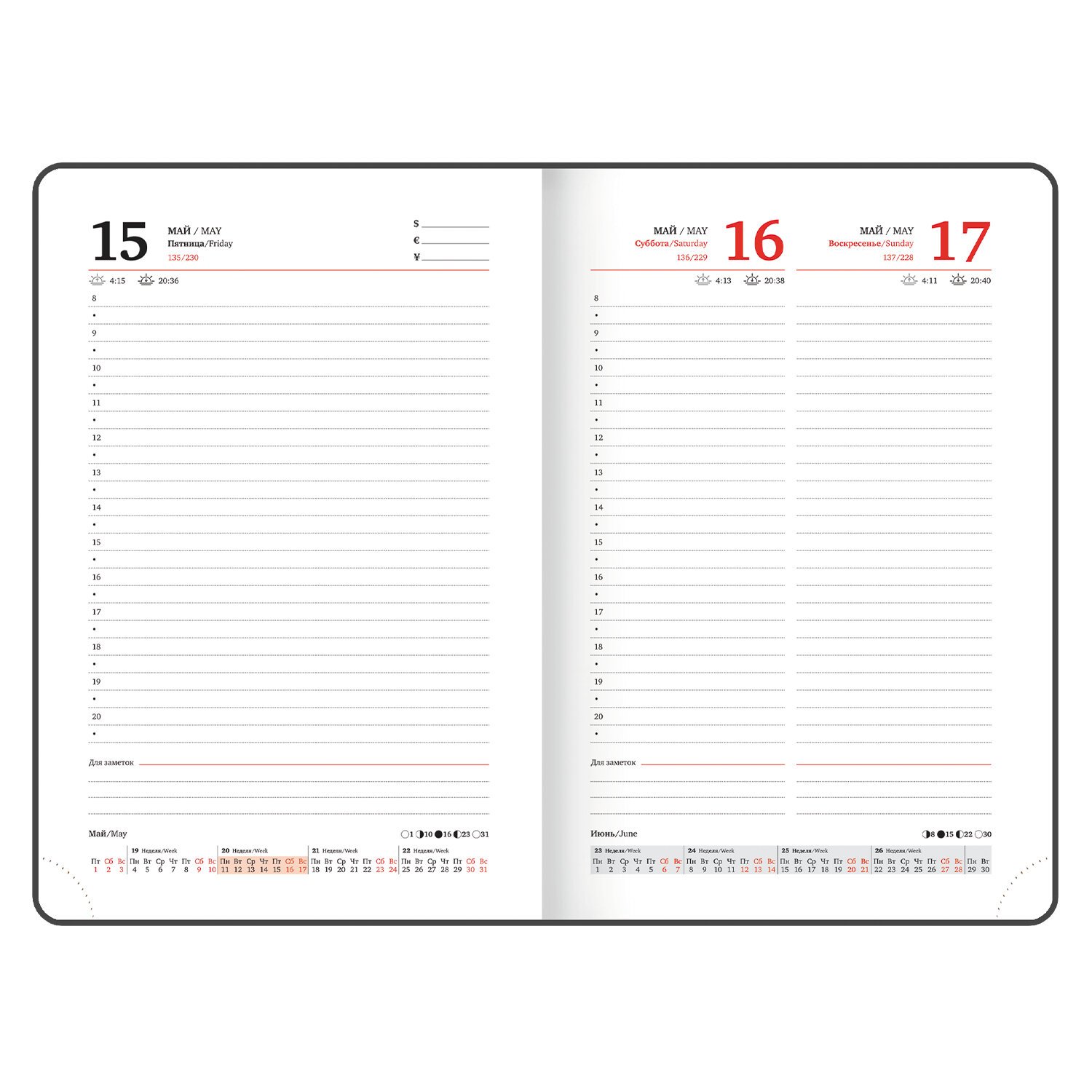 Внутренний блок включает 168 листов белой бумаги плотностью 70 г/м2. Каждая страничка имеет перфорированный угол. Благодаря стандартному формату А5 (138х213 мм) ежедневник удобно использовать как в офисе, так и на выездных деловых встречах.