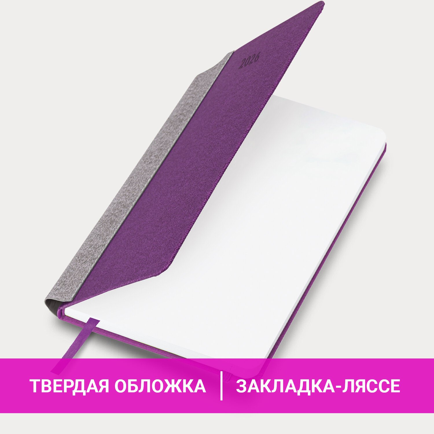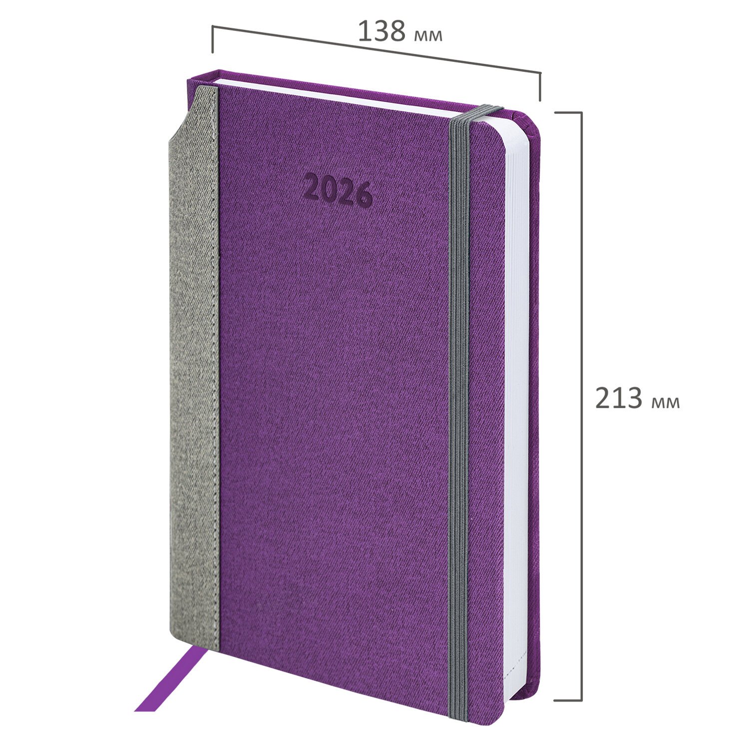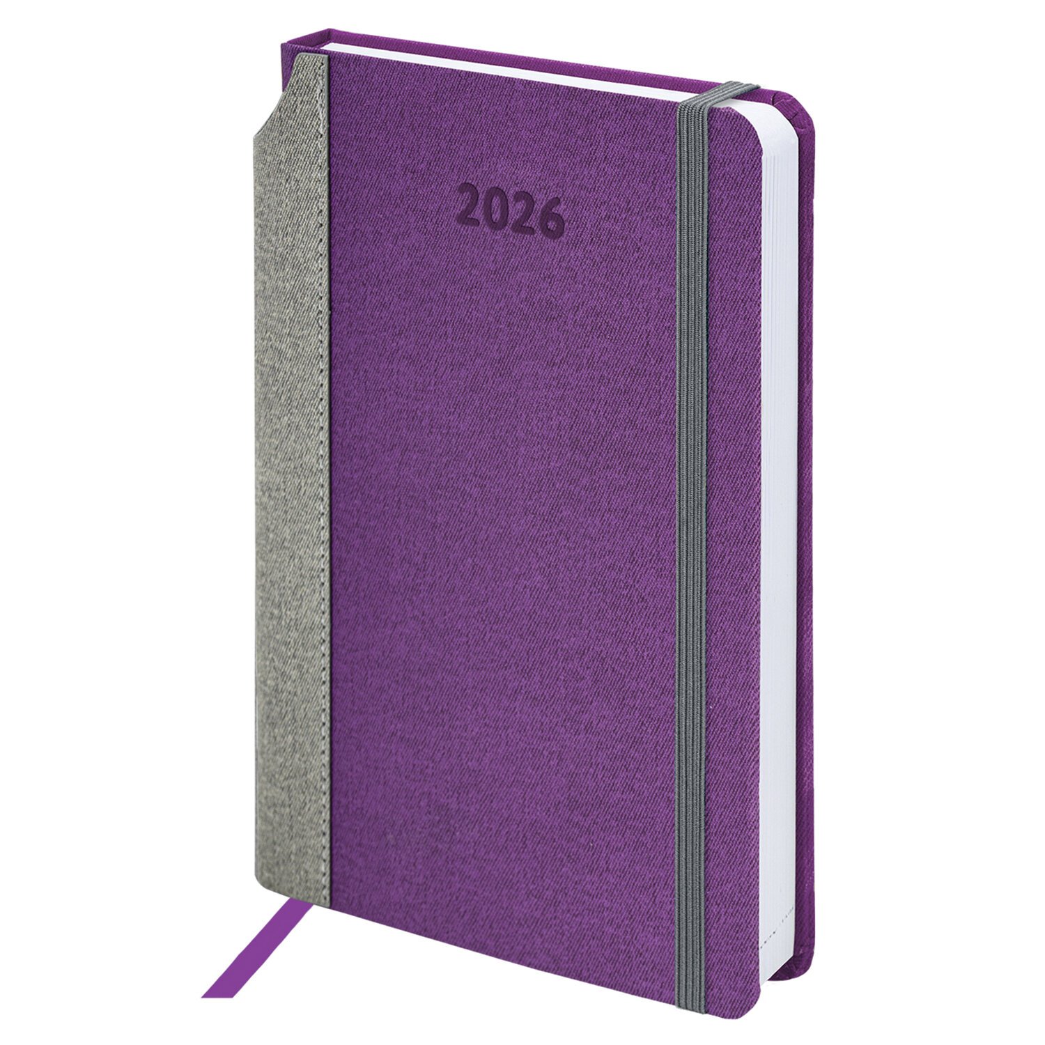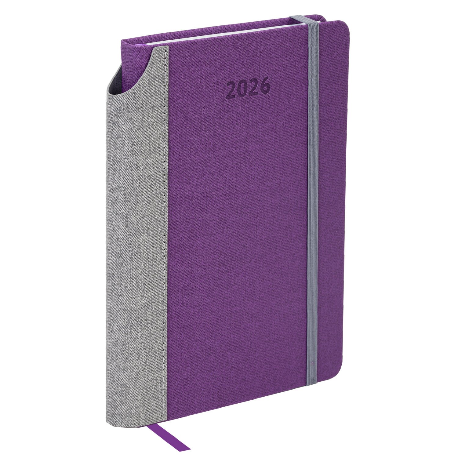 Выполнен в стильном сочетании фиолетового и серого цветов. Жесткая книжная обложка стилизована под искусственную кожу с текстурой льна, фиксируется резинкой, поэтому ежедневник не откроется в сумке или портфеле и страницы не помнутся. Материал обложки подходит для горячего тиснения. Для удобства пользования ежедневник снабжен карманом для фиксации ручки. Дополнением является закладка-ляссе, с помощью которой при необходимости можно быстро открыть ежедневник на нужной странице.