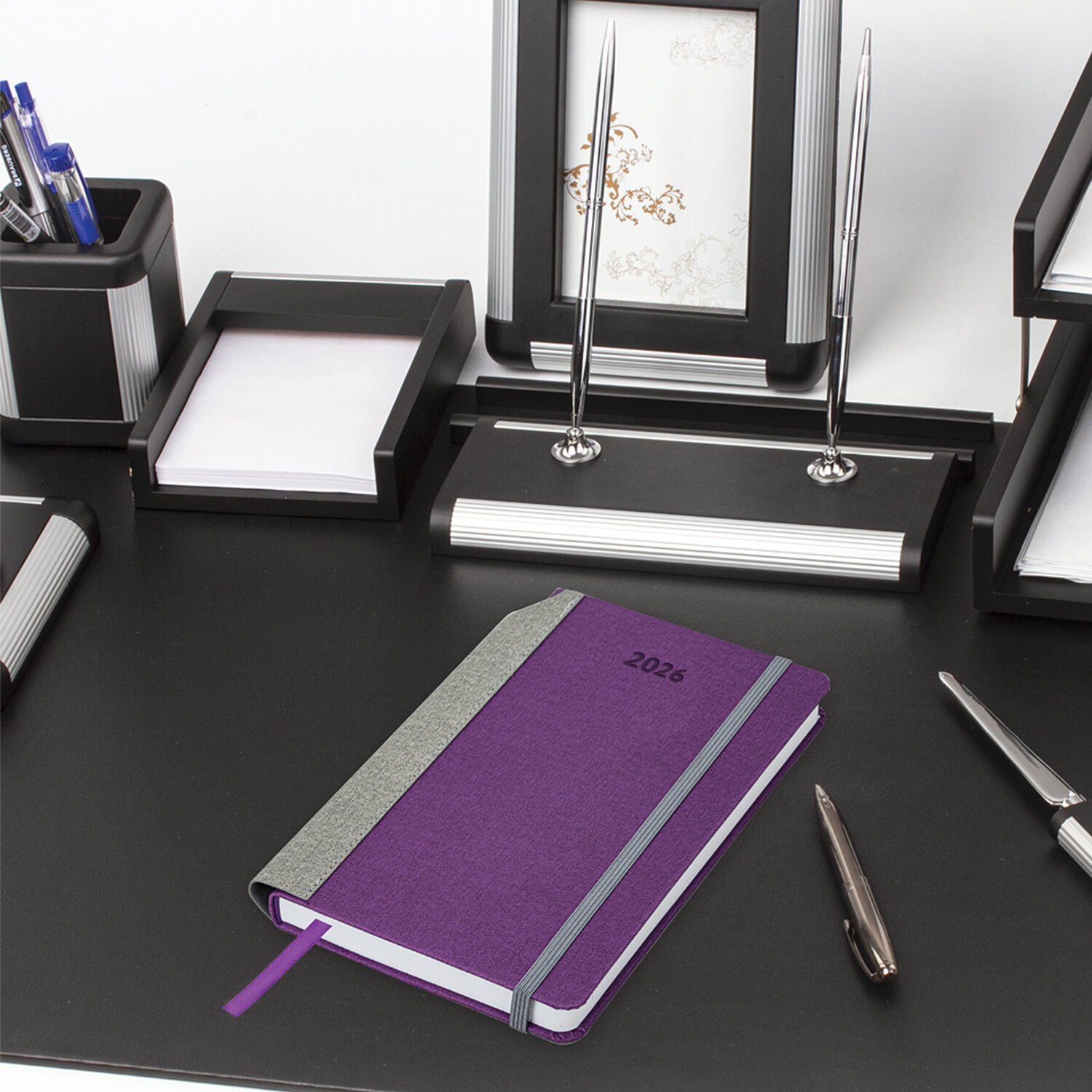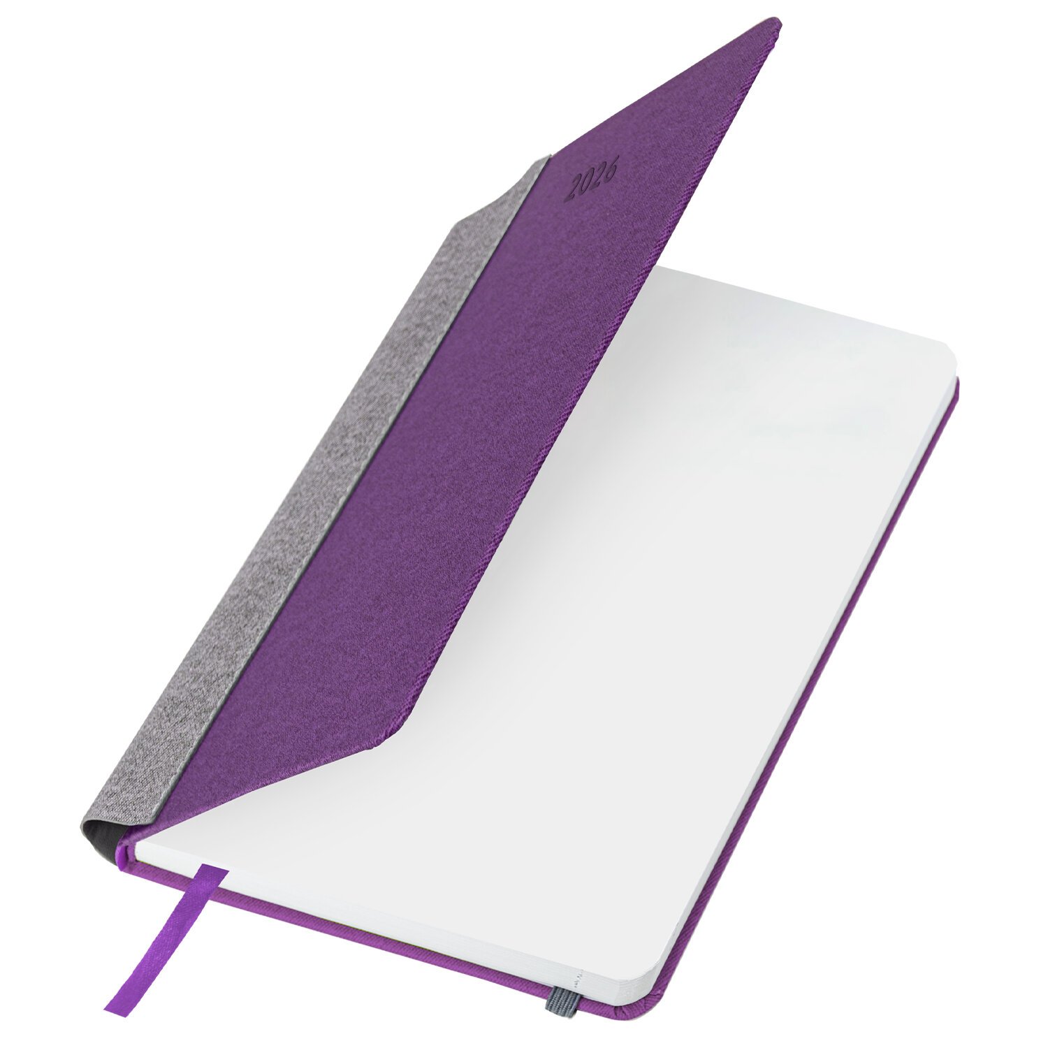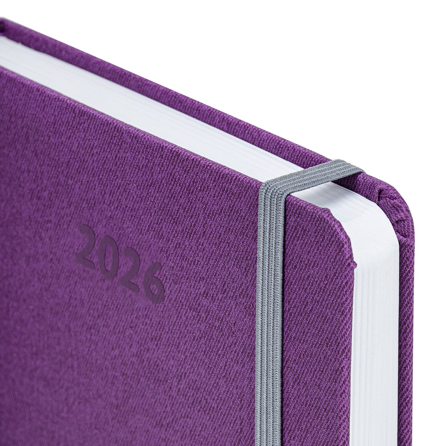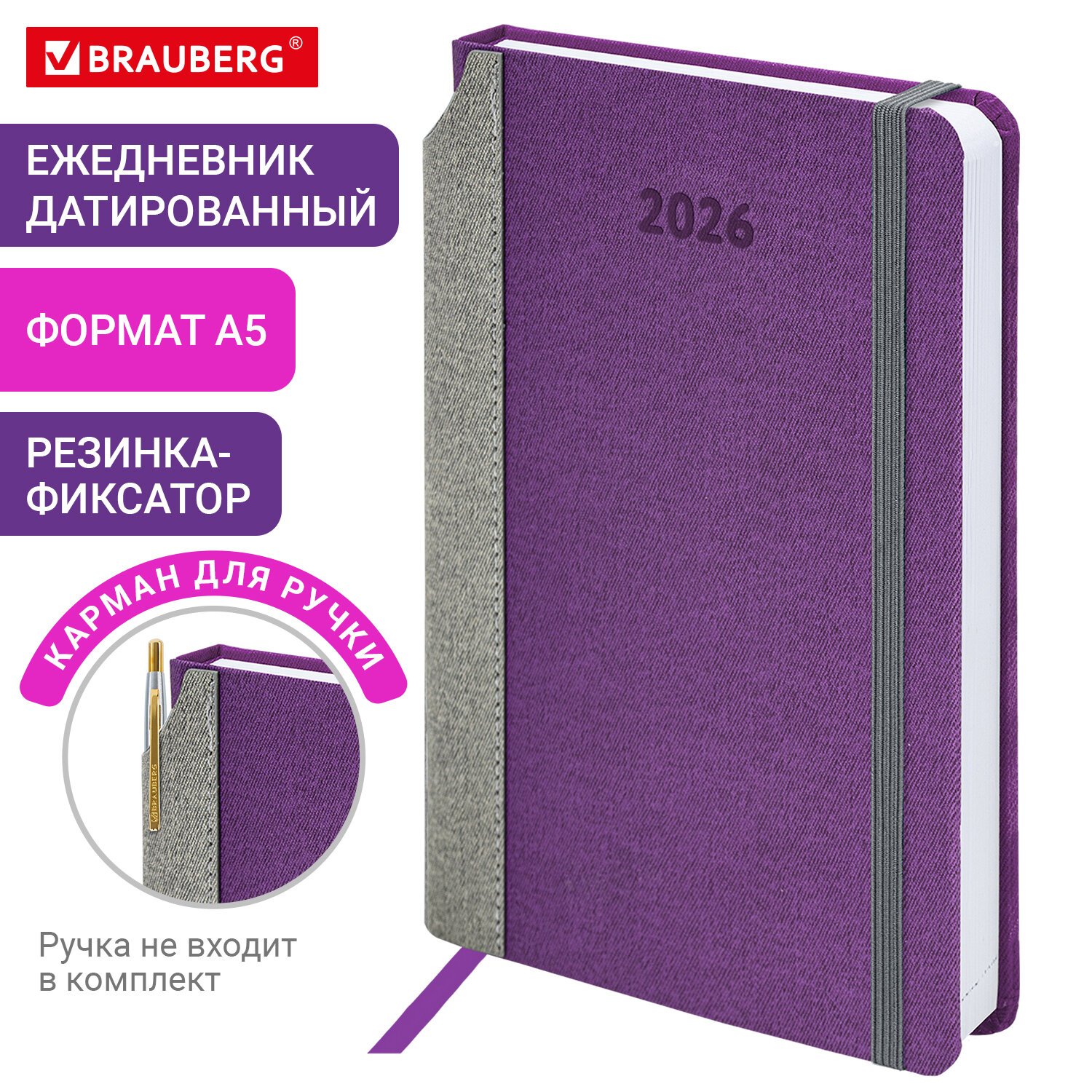 Выполнен в стильном сочетании фиолетового и серого цветов. Жесткая книжная обложка стилизована под искусственную кожу с текстурой льна, фиксируется резинкой, поэтому ежедневник не откроется в сумке или портфеле и страницы не помнутся. Материал обложки подходит для горячего тиснения. Для удобства пользования ежедневник снабжен карманом для фиксации ручки. Дополнением является закладка-ляссе, с помощью которой при необходимости можно быстро открыть ежедневник на нужной странице.