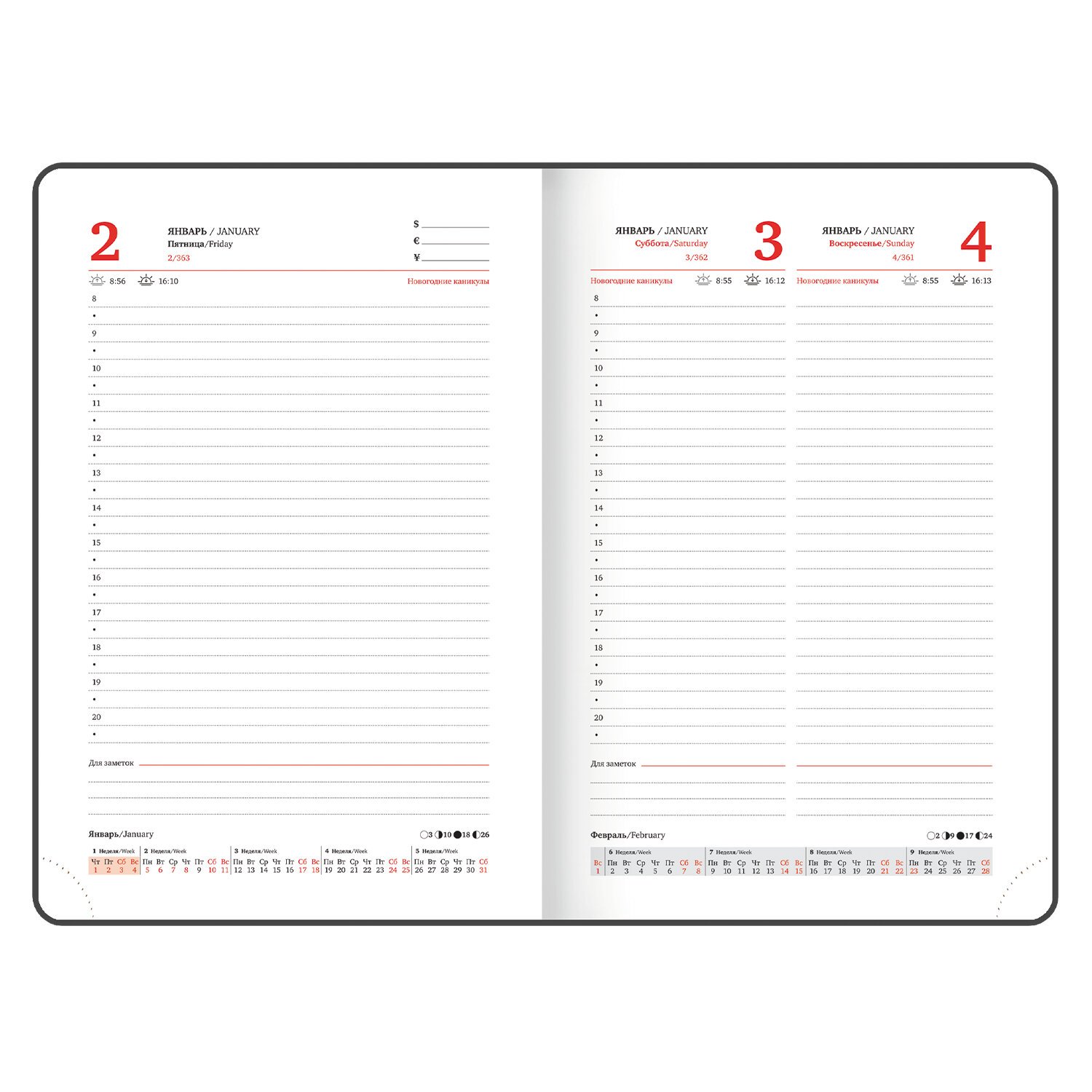 Внутренний блок включает 168 листов белой бумаги плотностью 70 г/м2. Каждая страничка имеет перфорированный угол. Благодаря стандартному формату А5 (138х213 мм) ежедневник удобно использовать как в офисе, так и на выездных деловых встречах.
