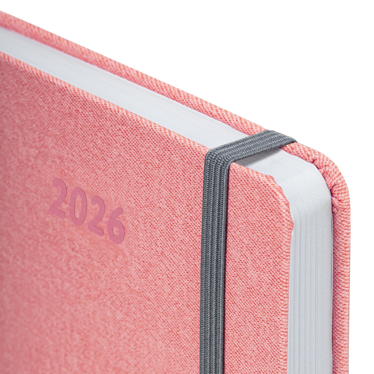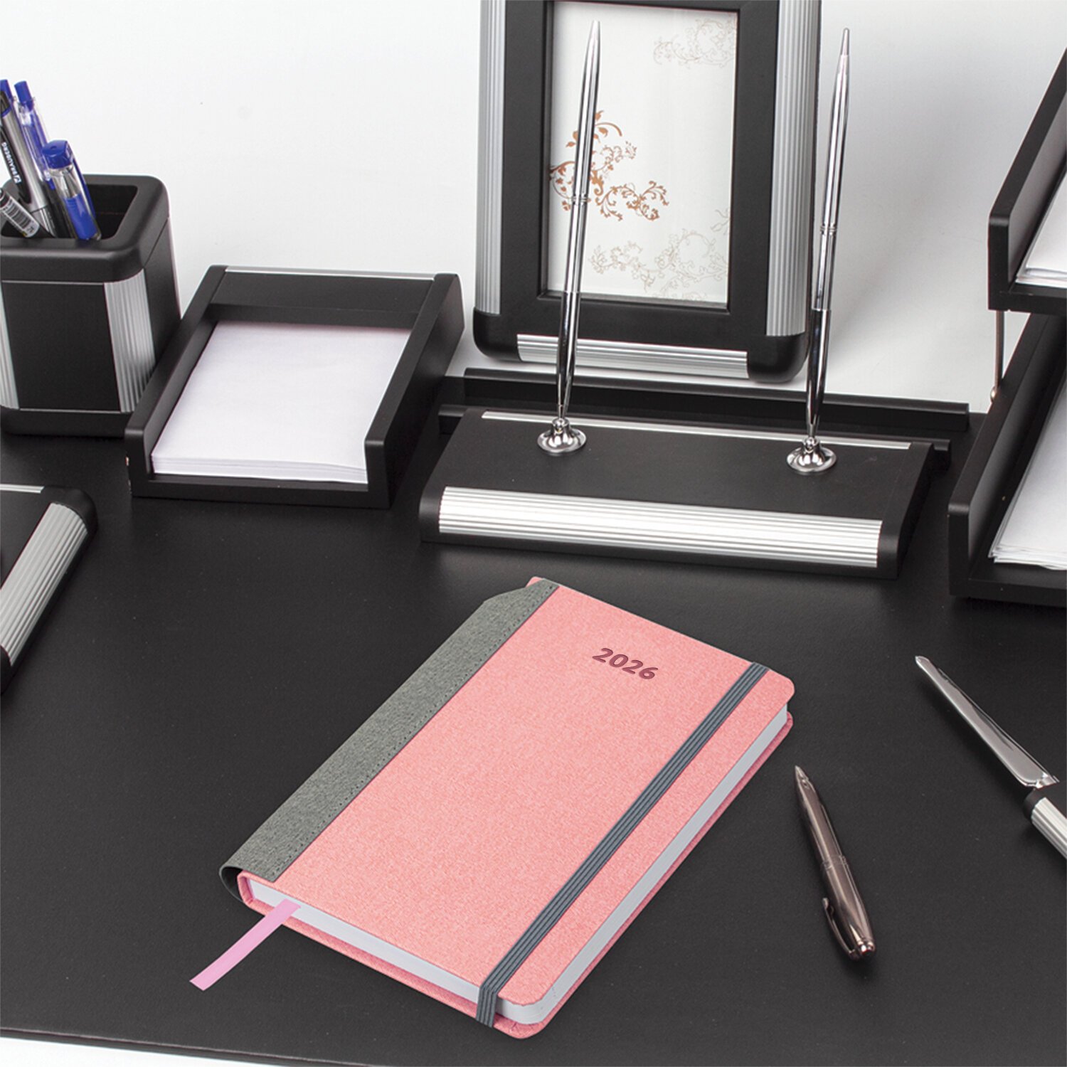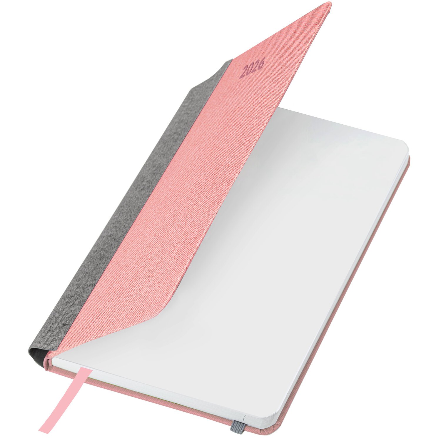 Выполнен в стильном сочетании розового и серого цветов. Жесткая книжная обложка стилизована под искусственную кожу с текстурой льна, фиксируется резинкой, поэтому ежедневник не откроется в сумке или портфеле и страницы не помнутся. Материал обложки подходит для горячего тиснения. Для удобства пользования ежедневник снабжен карманом для фиксации ручки. Дополнением является закладка-ляссе, с помощью которой при необходимости можно быстро открыть ежедневник на нужной странице.