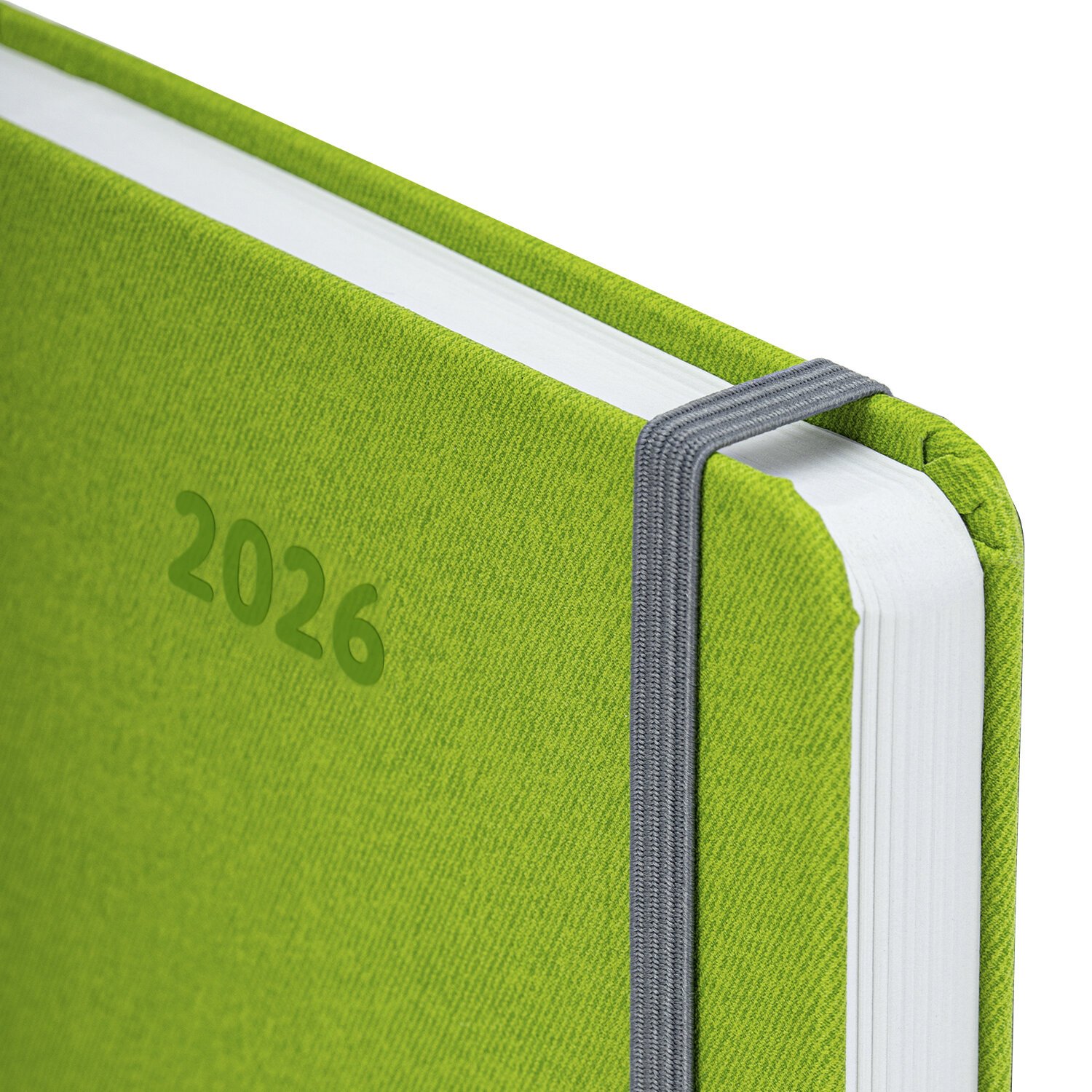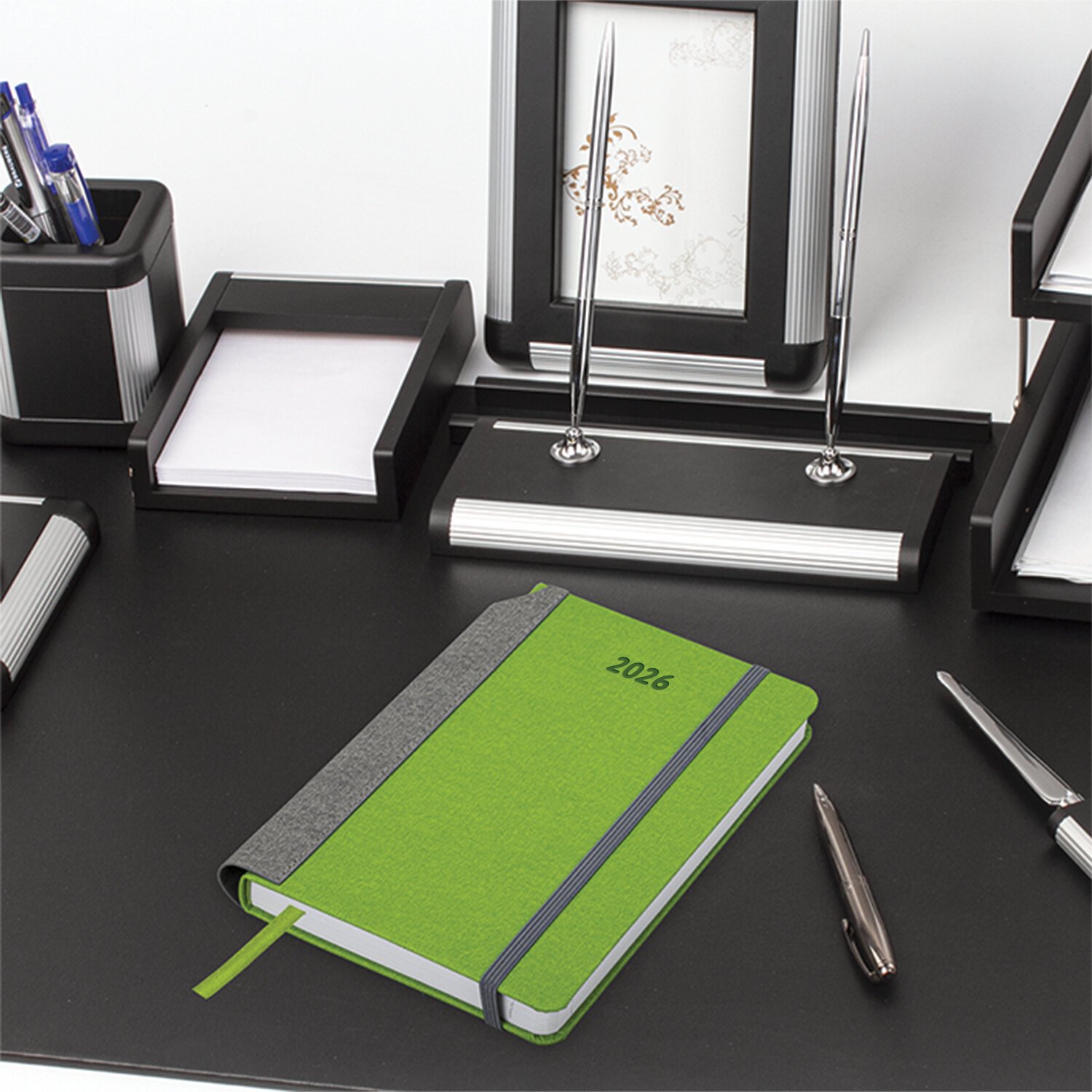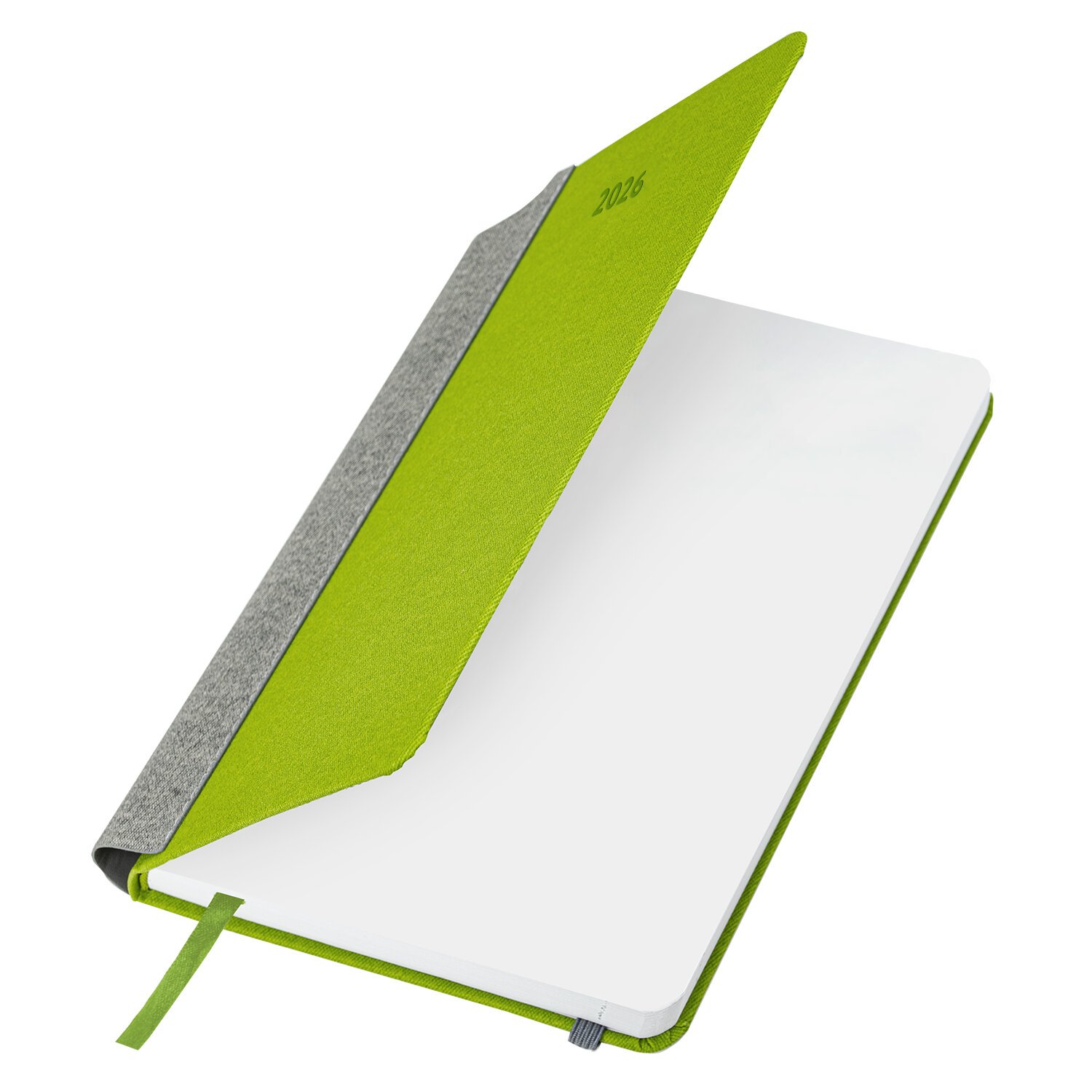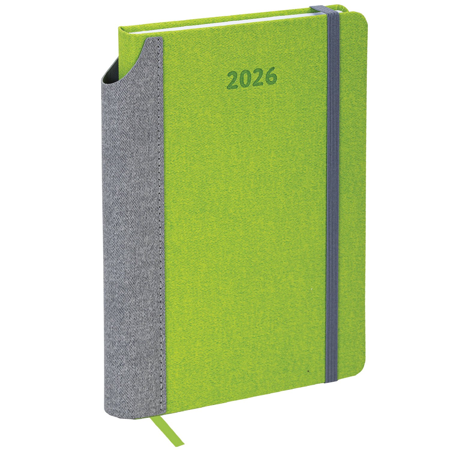 Выполнен в стильном сочетании зеленого и серого цветов. Жесткая книжная обложка стилизована под искусственную кожу с текстурой льна, фиксируется резинкой, поэтому ежедневник не откроется в сумке или портфеле и страницы не помнутся. Материал обложки подходит для горячего тиснения. Для удобства пользования ежедневник снабжен карманом для фиксации ручки. Дополнением является закладка-ляссе, с помощью которой при необходимости можно быстро открыть ежедневник на нужной странице.