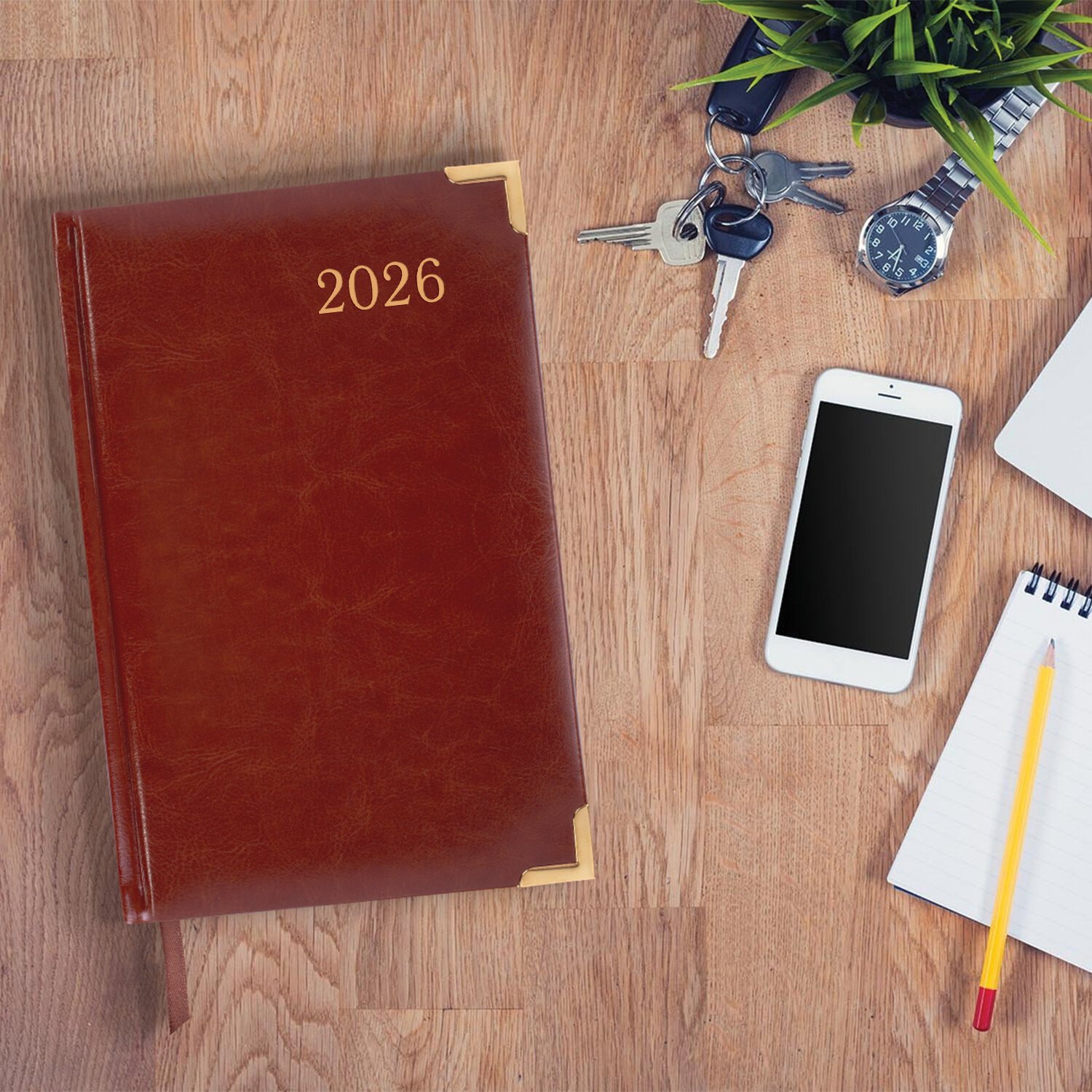 Твердая обложка благородного коричневого цвета стилизована под гладкую кожу. Подходит для горячего тиснения. Ежедневник имеет металлические уголки, что придает ему особый шарм. Дополнением является закладка-ляссе, с помощью которой при необходимости можно быстро открыть ежедневник на нужной странице. Помимо прочего, ежедневник снабжен обширным справочным материалом. В конце имеются 4 страницы для записей и заметок.