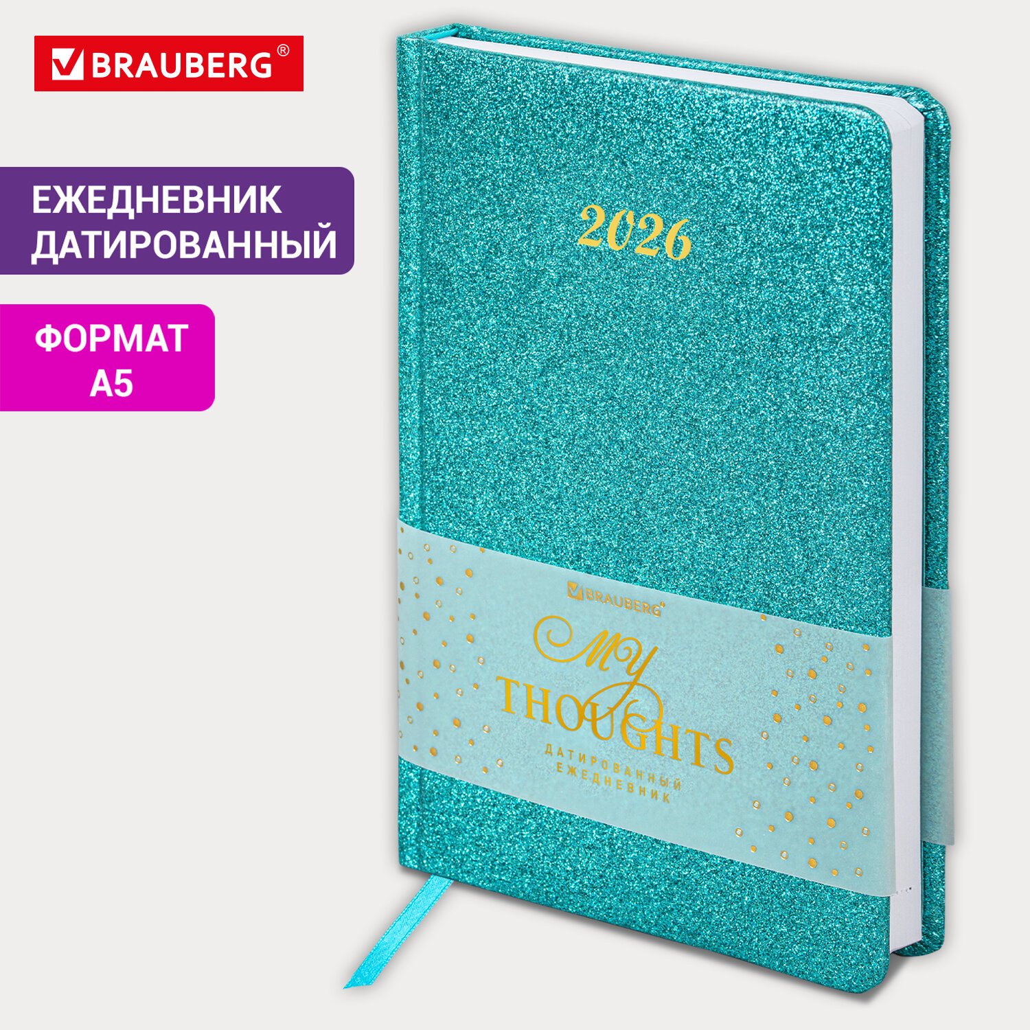 Ежедневник датированный 2026 А5 138x213мм BRAUBERG Sparkle, под кожу, блестки, бирюзовый, 117439