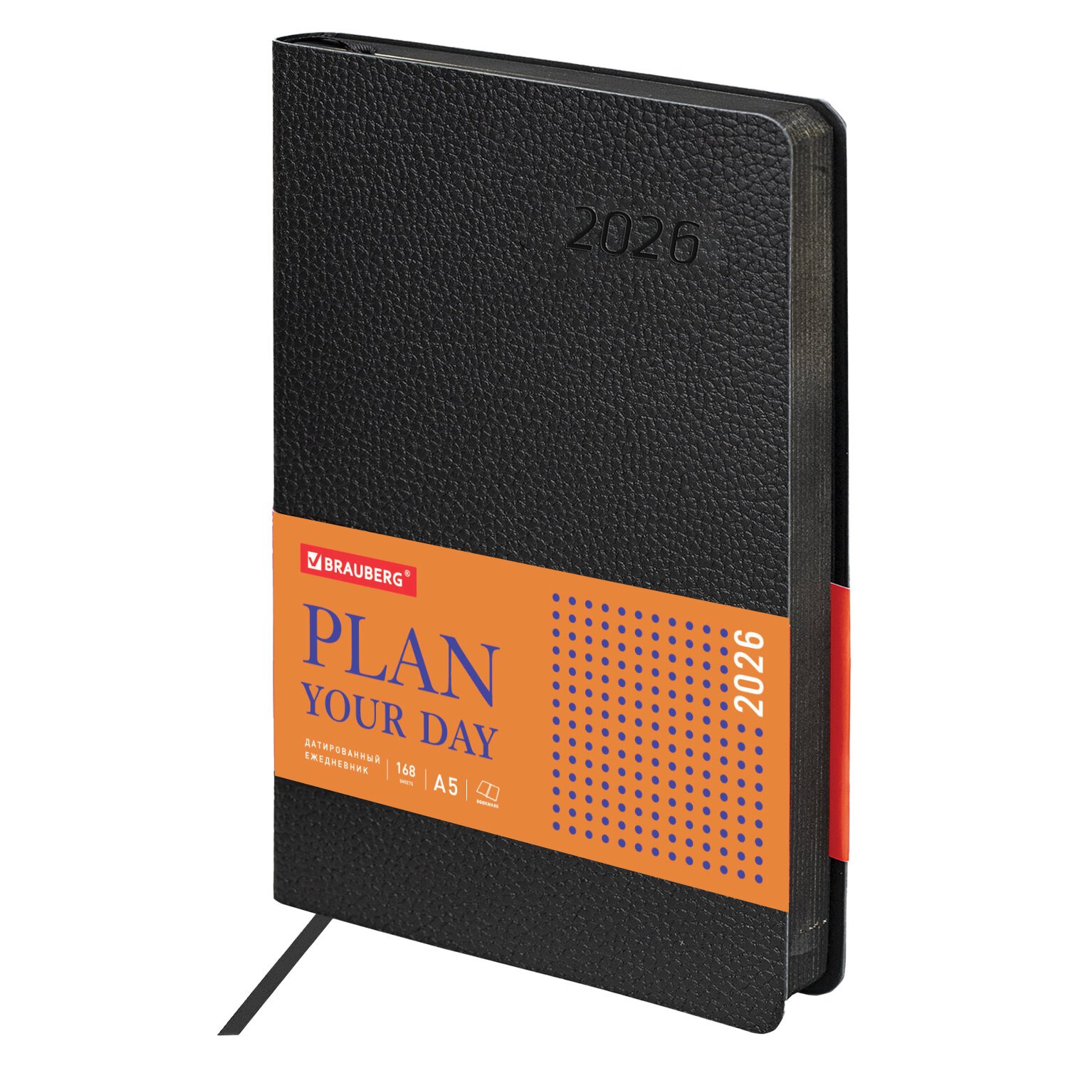 Мягкая (интегральная) обложка стилизована под фактурную кожу строгого черного цвета. Подходит для горячего тиснения. Дополнением является закладка-ляссе, с помощью которой при необходимости можно быстро открыть ежедневник на нужной странице. Ежедневник снабжен справочным материалом. В конце имеются 4 страницы для записей и заметок.