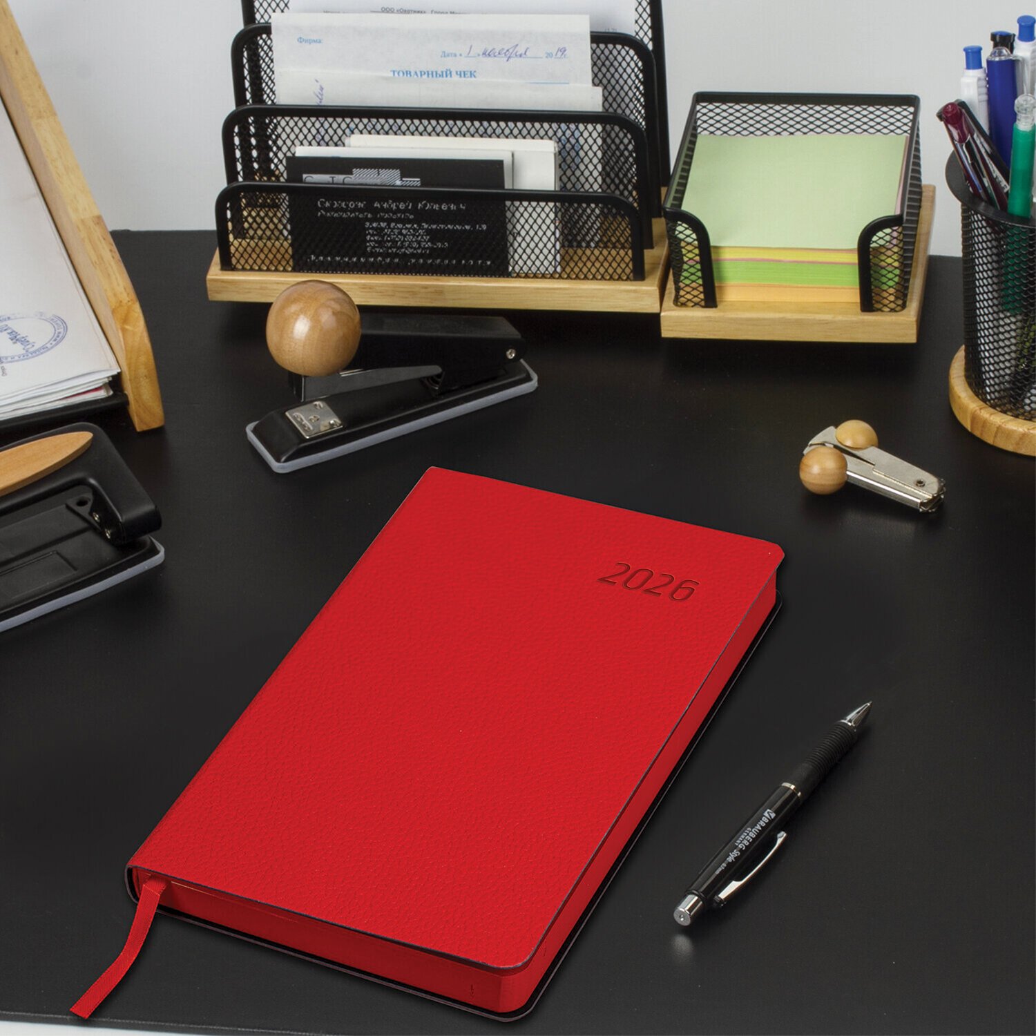 Мягкая (интегральная) обложка стилизована под фактурную кожу насыщенного красного цвета. Подходит для горячего тиснения. Дополнением является закладка-ляссе, с помощью которой при необходимости можно быстро открыть ежедневник на нужной странице. Ежедневник снабжен справочным материалом. В конце имеются 4 страницы для записей и заметок.