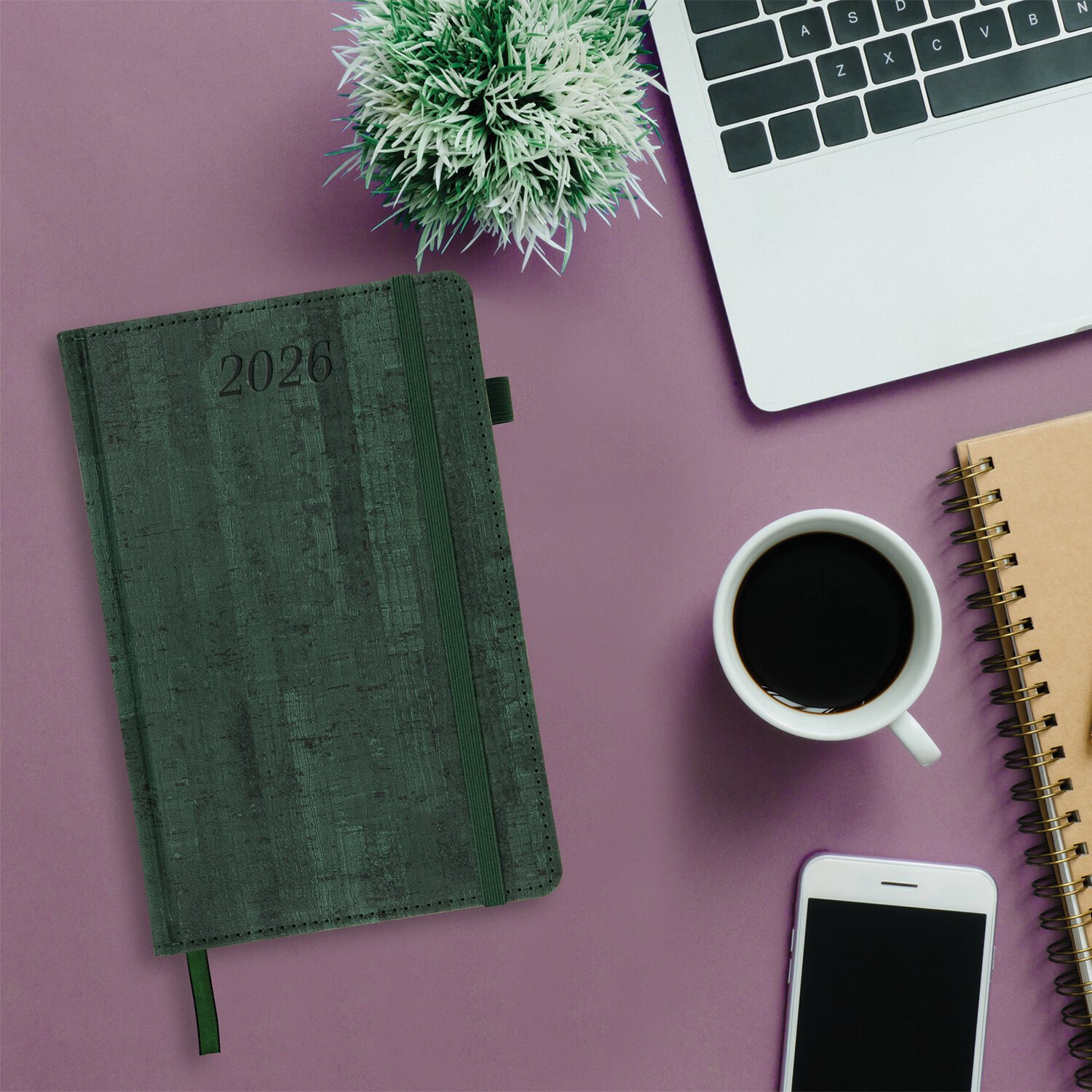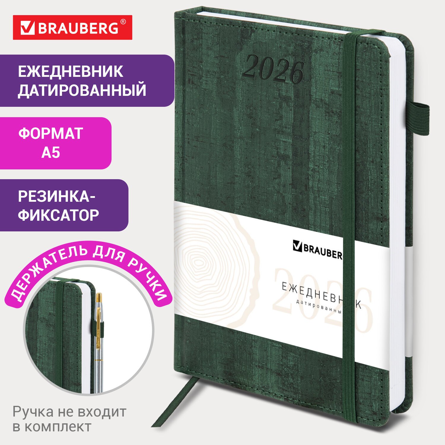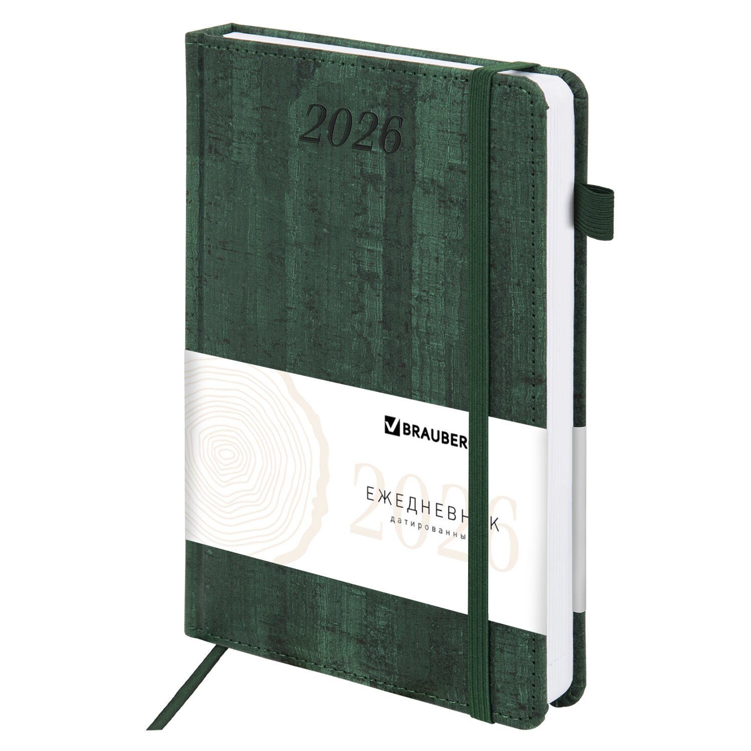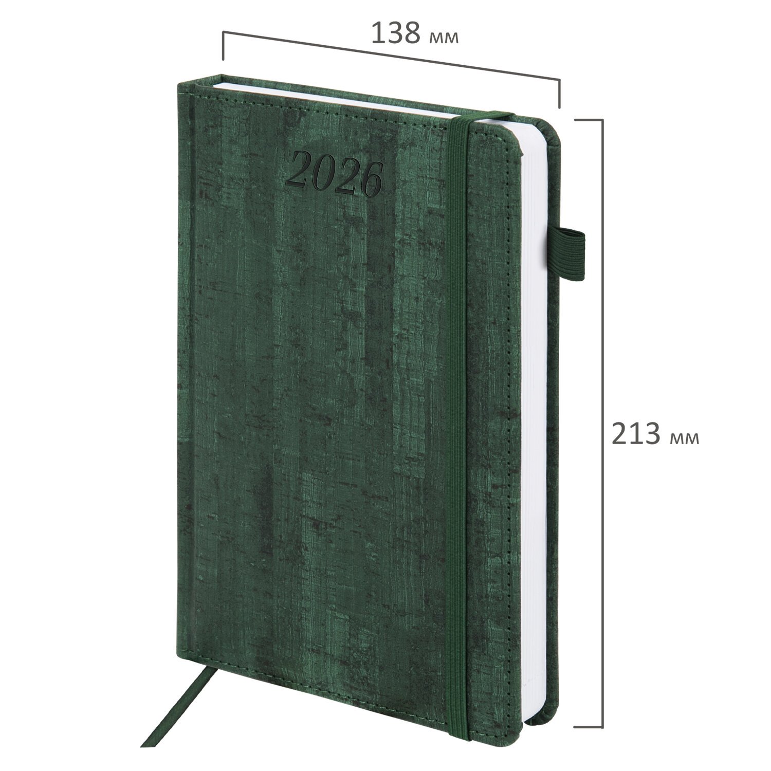 Ежедневник датированный 2026 А5 138x213мм BRAUBERG Wood, под кожу, держатель для ручки, зеленый, 117109
