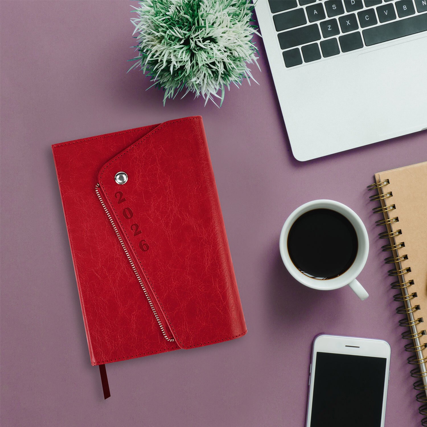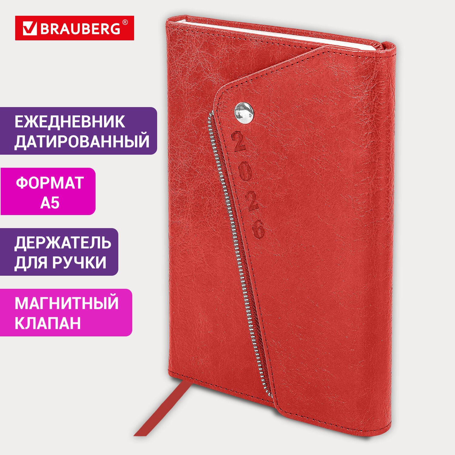 Ежедневник датированный 2026 А5 145х213мм BRAUBERG Jacket под кожу, клапан, держатель, красный, 117401