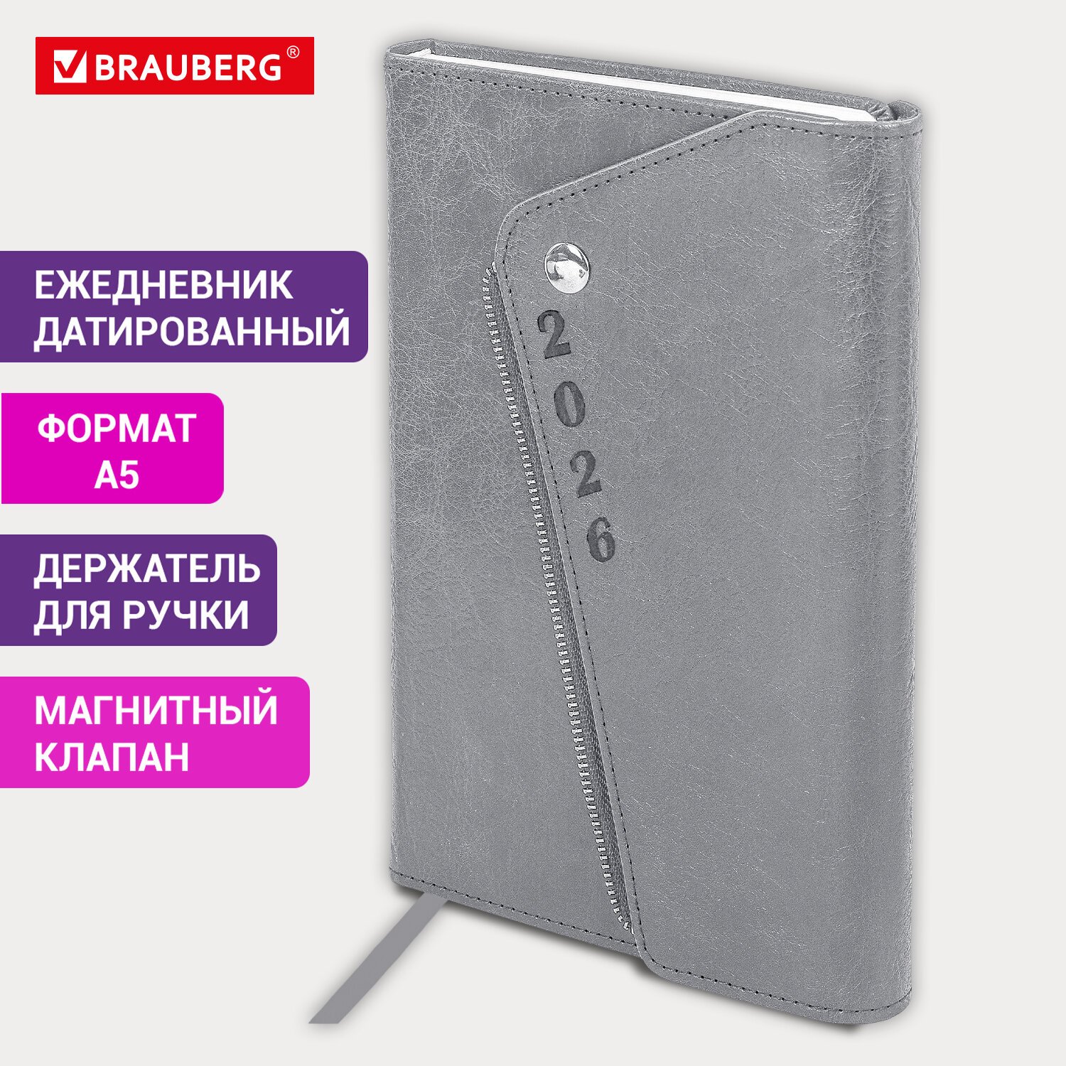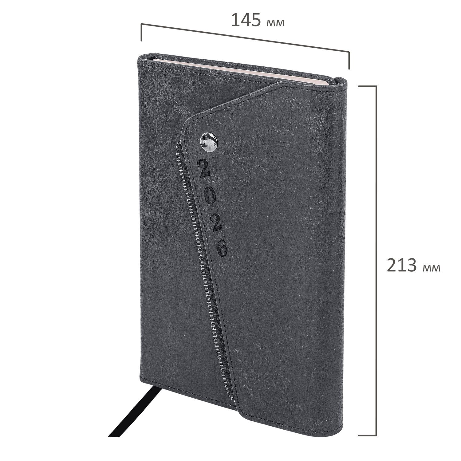 Ежедневник датированный 2026 А5 145х213мм BRAUBERG Jacket под кожу, клапан, держатель, серый, 117403