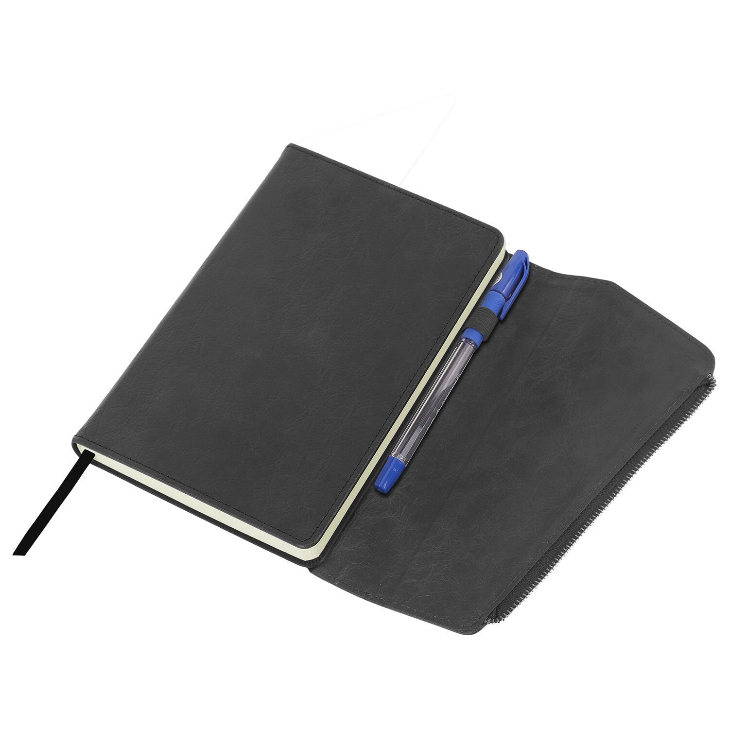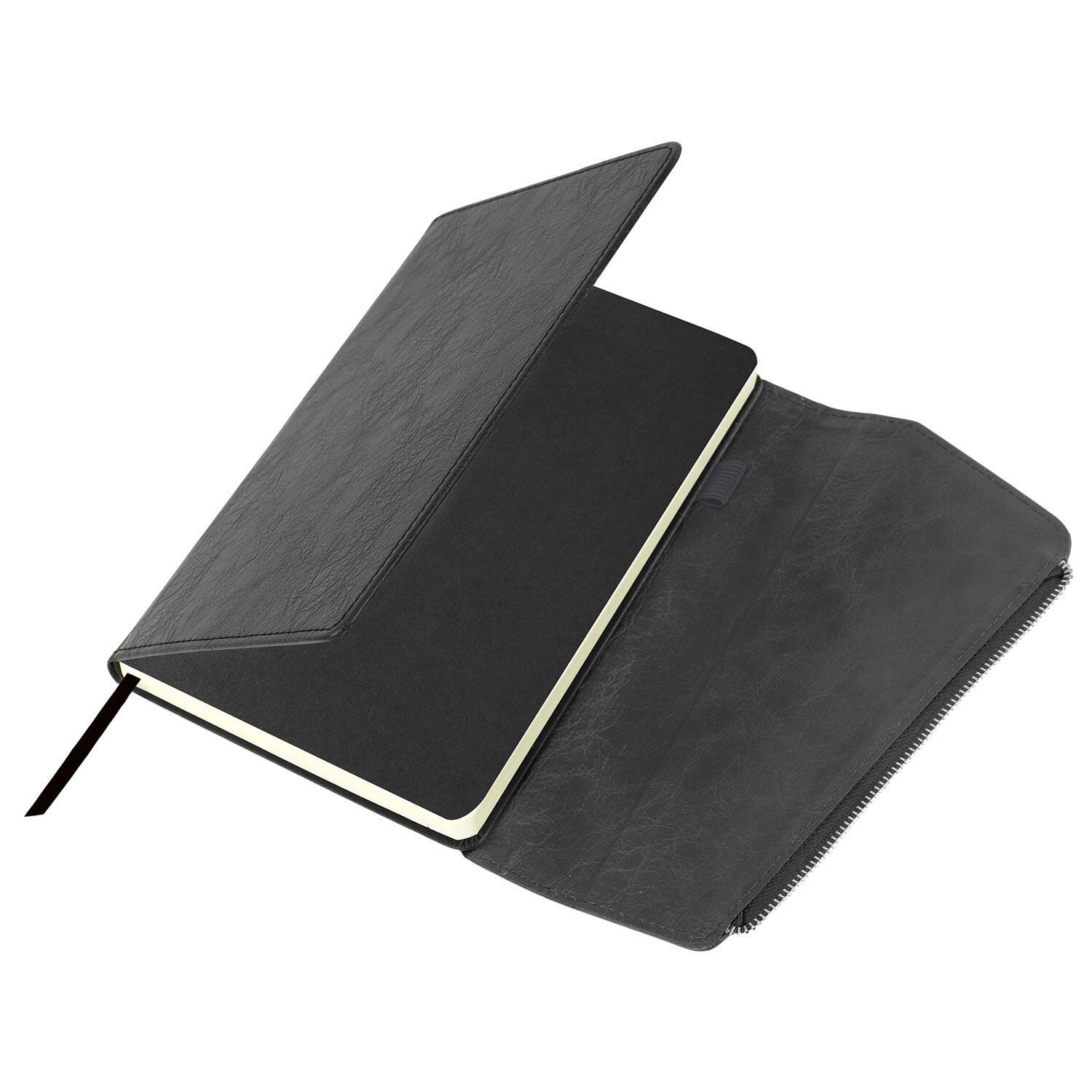 Твердая обложка стилизована под текстурную кожу и имеет интересную деталь в виде магнитного клапана декорированного молнией и кнопкой. Благодаря клапану ежедневник не откроется в сумке или портфеле. Подходит для горячего тиснения. Дополнением является закладка-ляссе, с помощью которой при необходимости можно быстро открыть ежедневник на нужной странице, и держатель для ручки. Ежедневник снабжен справочным материалом. В конце имеются 4 страницы для записей и заметок.