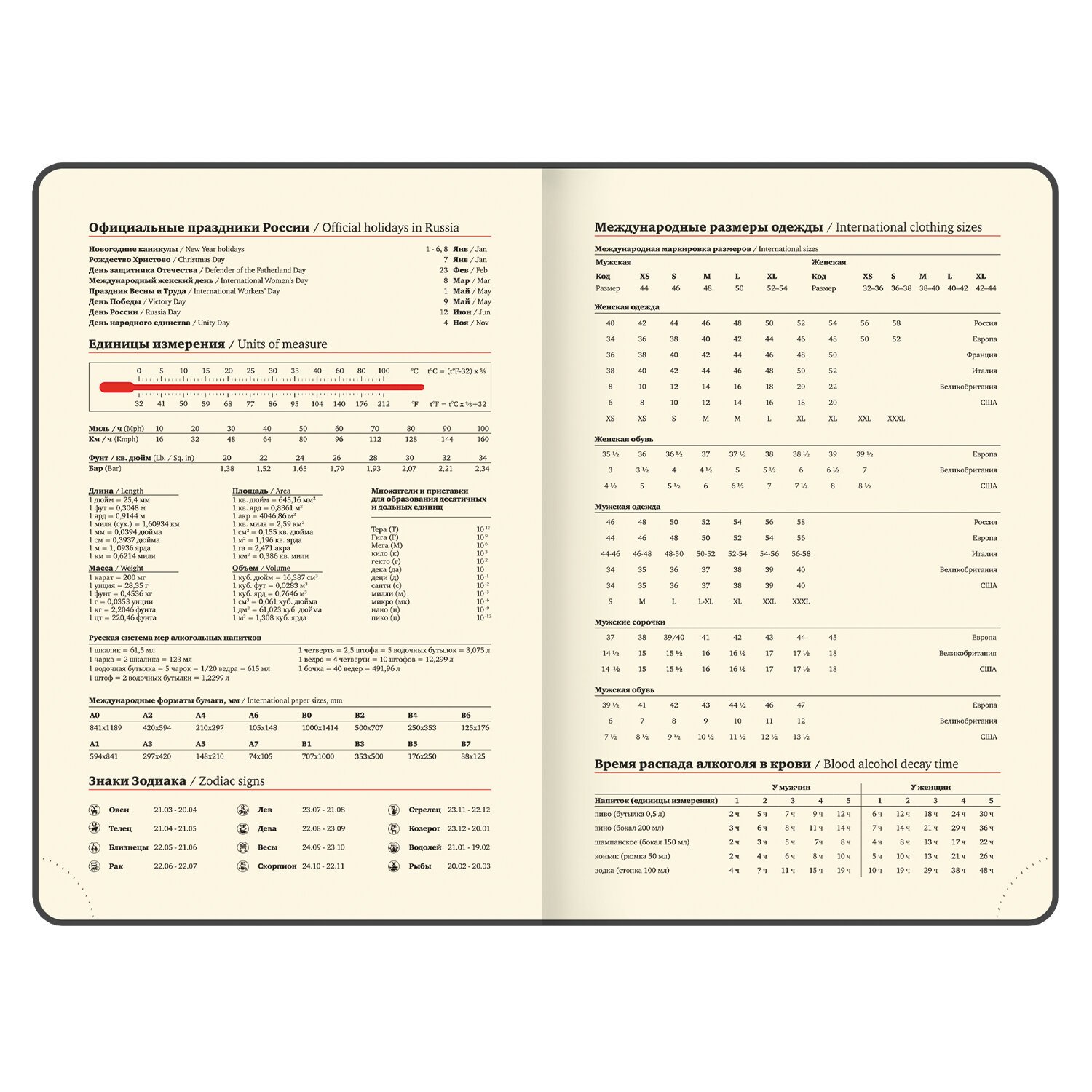 Внутренний блок включает 168 листов кремовой бумаги плотностью 70 г/м2. Каждая страничка имеет перфорированный угол. Благодаря стандартному формату А5 (145х213 мм) датированный ежедневник удобно использовать как в офисе, так и на выездных деловых встречах.