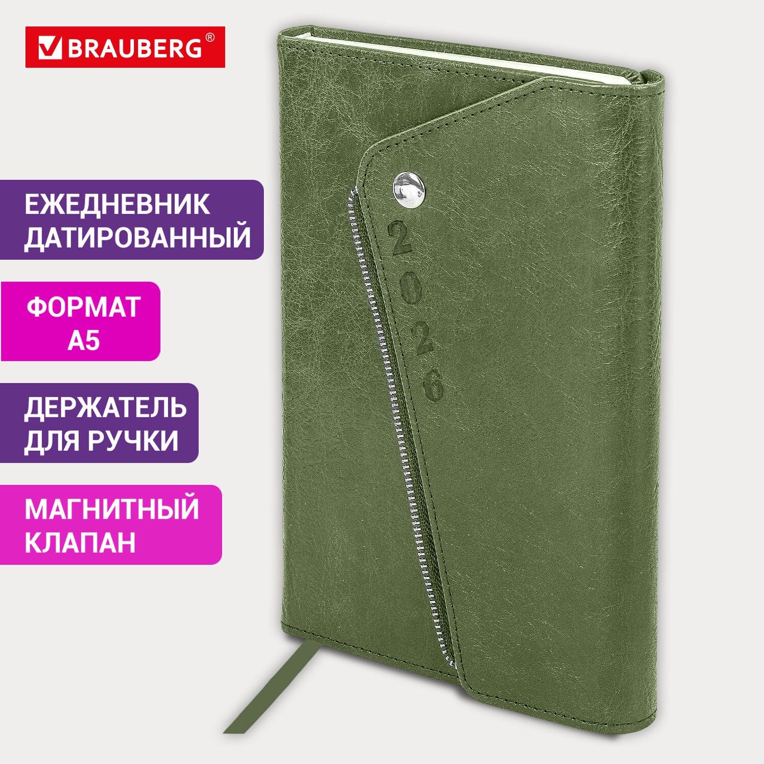 Ежедневник датированный 2026 А5 138х213мм BRAUBERG Essential, под кожу, держатель, зеленый, 117398