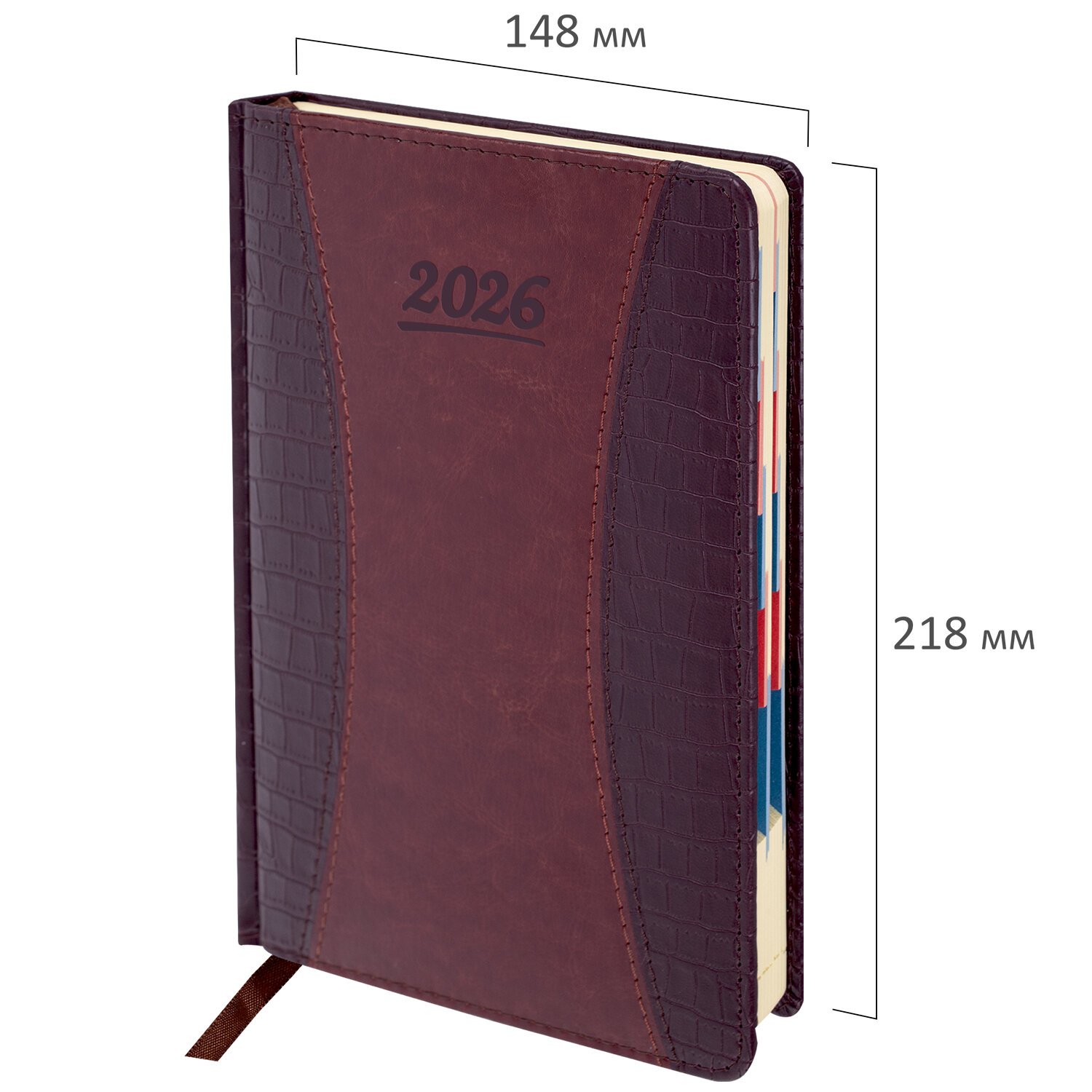 Внутренний блок включает 168 листов тонированной бумаги плотностью 70 г/м2. Каждая страничка имеет перфорированный угол. Благодаря стандартному формату А5 (148х218 мм) ежедневник удобно использовать как в офисе, так и на выездных деловых встречах. Твердая обложка состоит из двух материалов и стилизована под кожу крокодила с вставкой из материала под гладкую кожу. Материал обложки подходит для горячего тиснения.