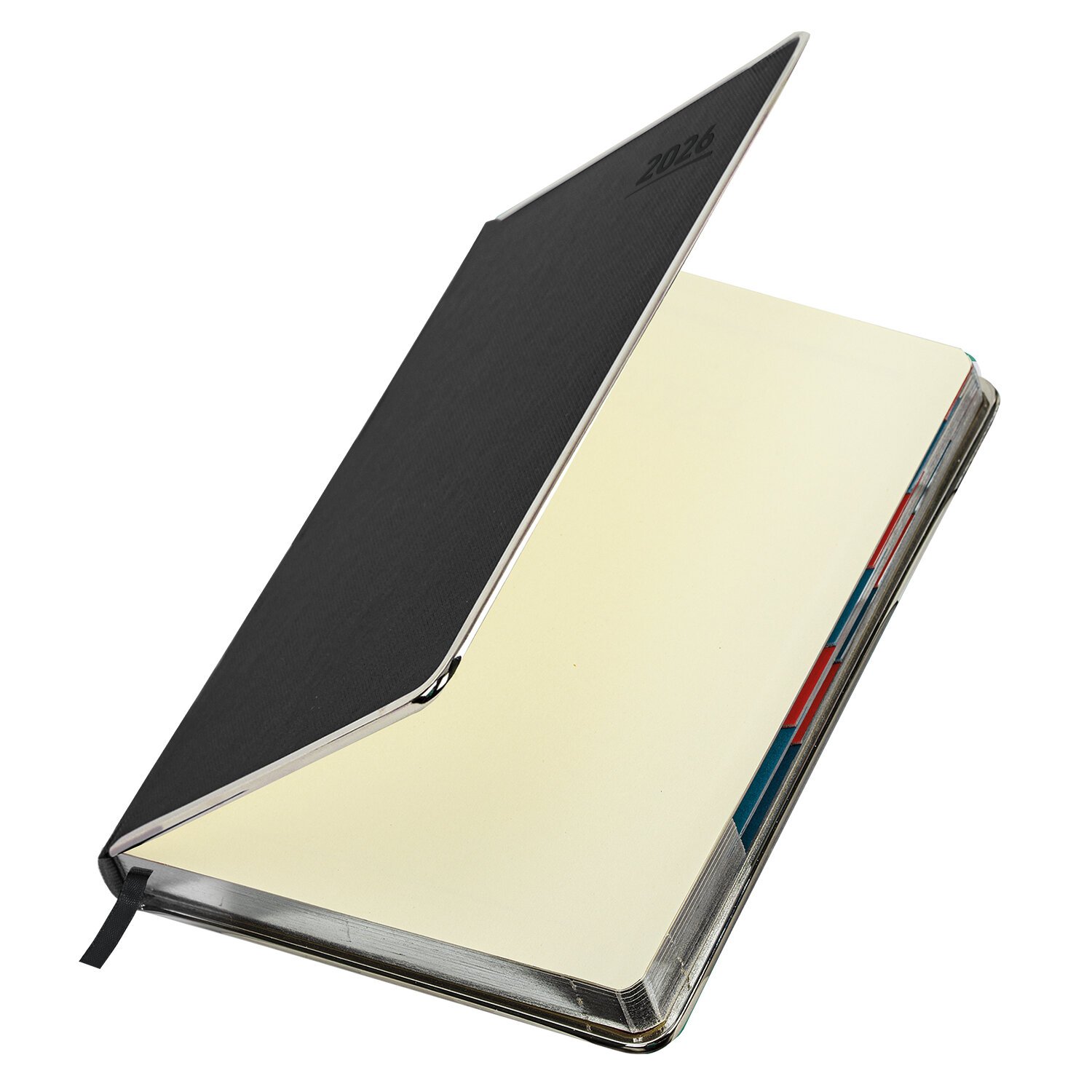Дополнением является закладка-ляссе, с помощью которой при необходимости можно быстро открыть ежедневник на нужной странице, а также вырубка по месяцам. Помимо прочего, ежедневник снабжен обширным справочным материалом. В конце ежедневника есть 6 страниц для записей и заметок. Выполнен в классическом черном цвете.