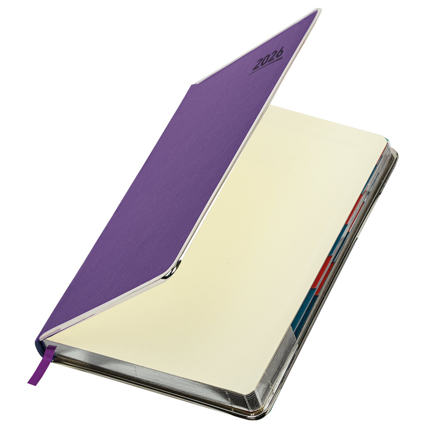 Дополнением является закладка-ляссе, с помощью которой при необходимости можно быстро открыть ежедневник на нужной странице, а также вырубка по месяцам. Помимо прочего, ежедневник снабжен обширным справочным материалом. В конце ежедневника есть 6 страниц для записей и заметок. Выполнен в фиолетовом цвете.