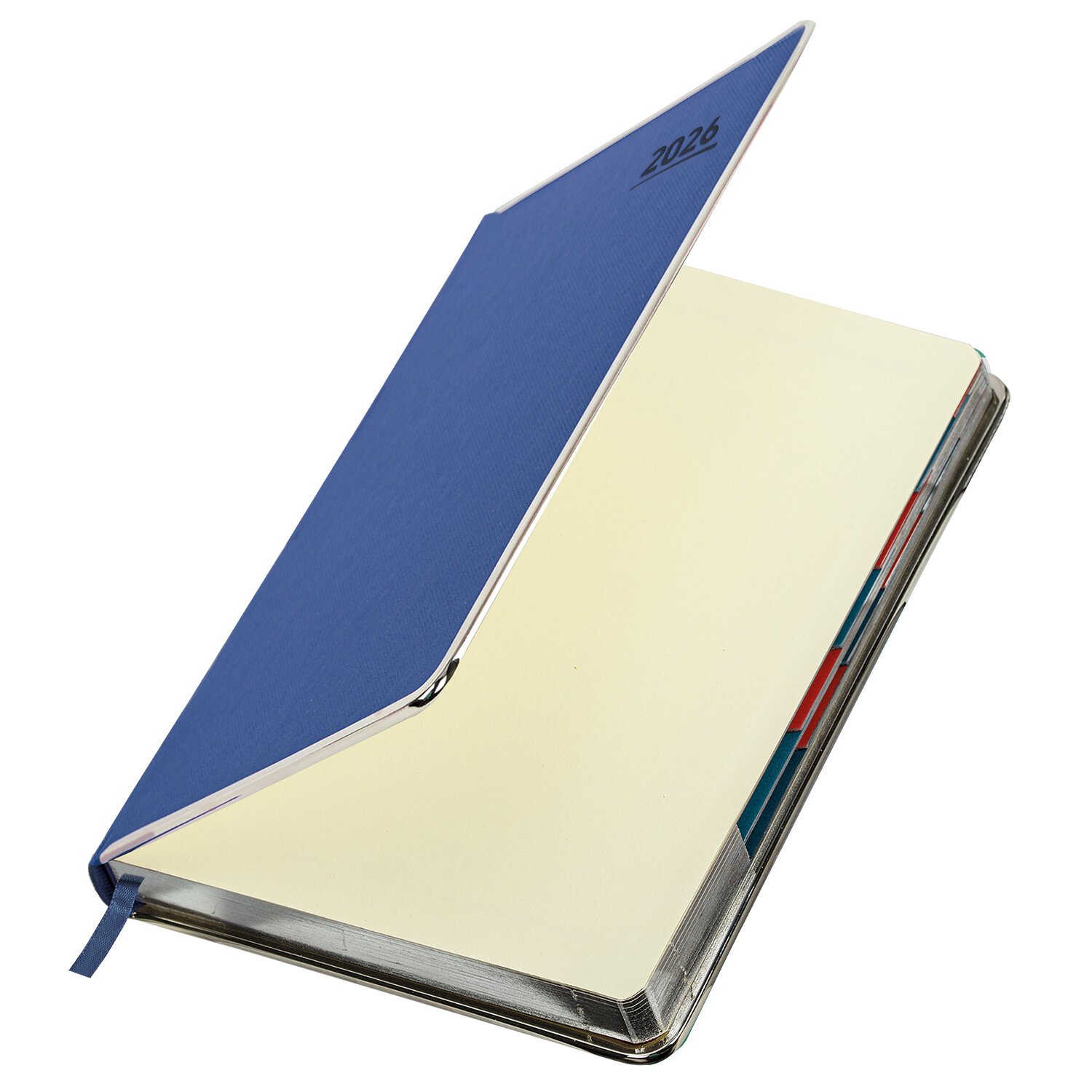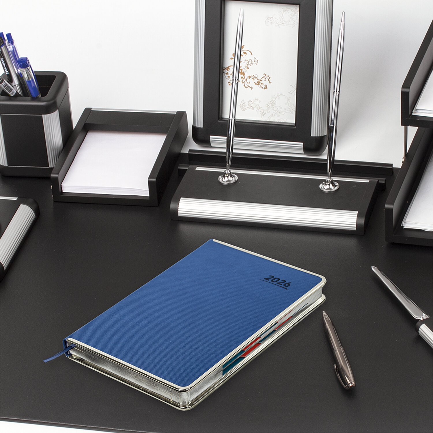 Дополнением является закладка-ляссе, с помощью которой при необходимости можно быстро открыть ежедневник на нужной странице, а также вырубка по месяцам. Помимо прочего, ежедневник снабжен обширным справочным материалом. В конце ежедневника есть 6 страниц для записей и заметок. Выполнен в классическом синем цвете.
