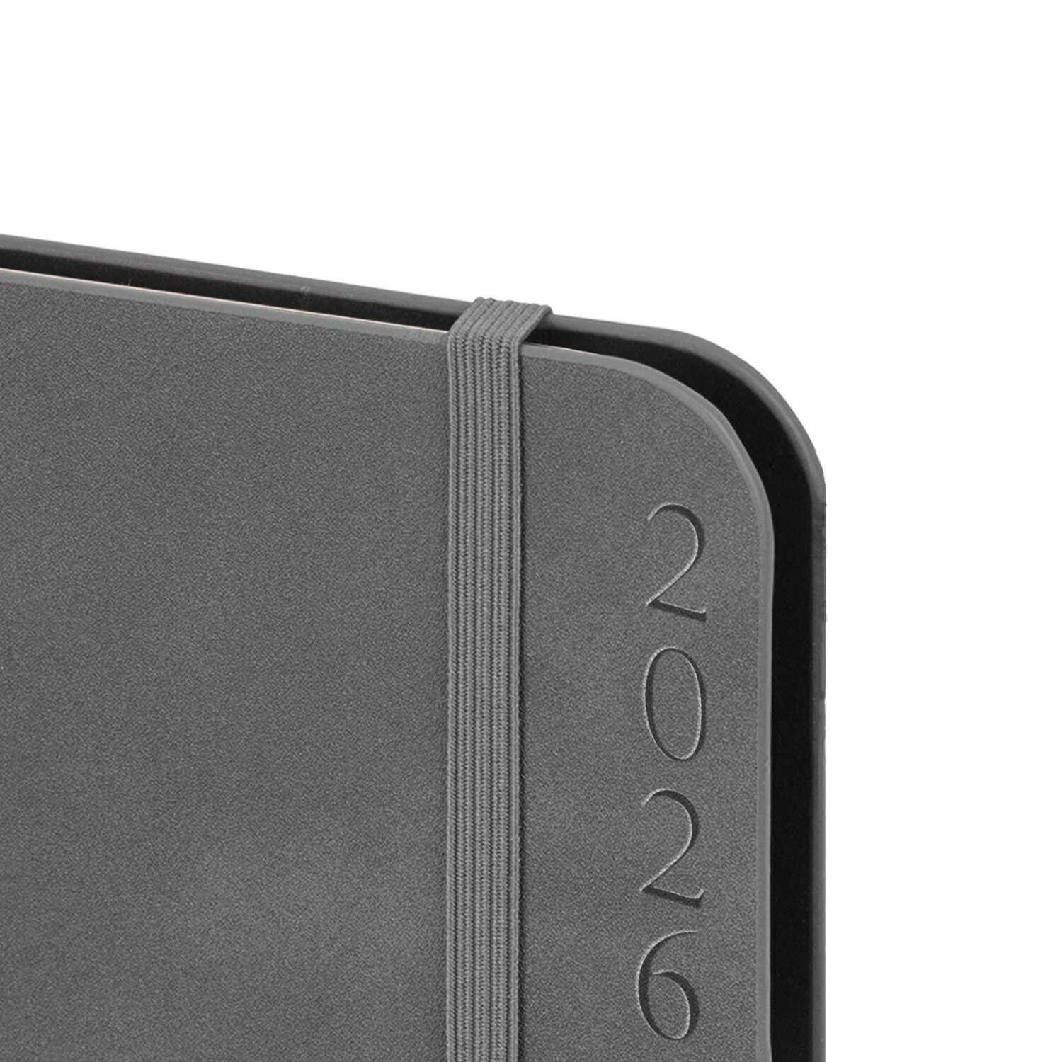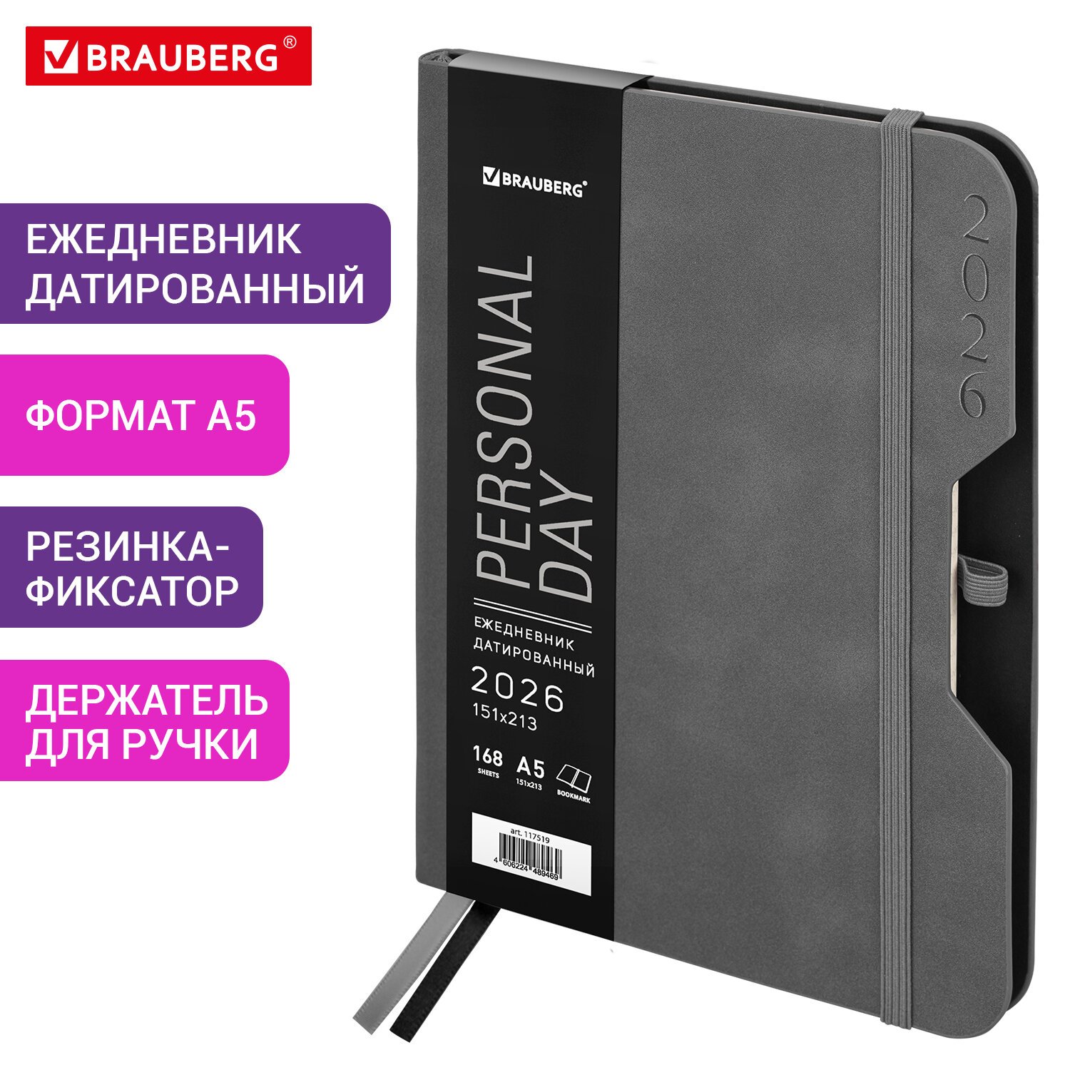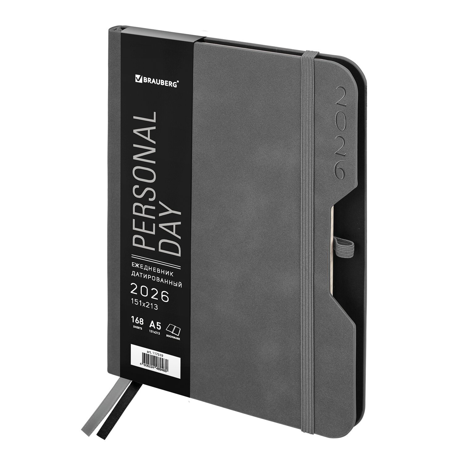 Ежедневник датированный 2026 А5 151х213мм BRAUBERG Note, под кожу, держатель для ручки, серый, 117519