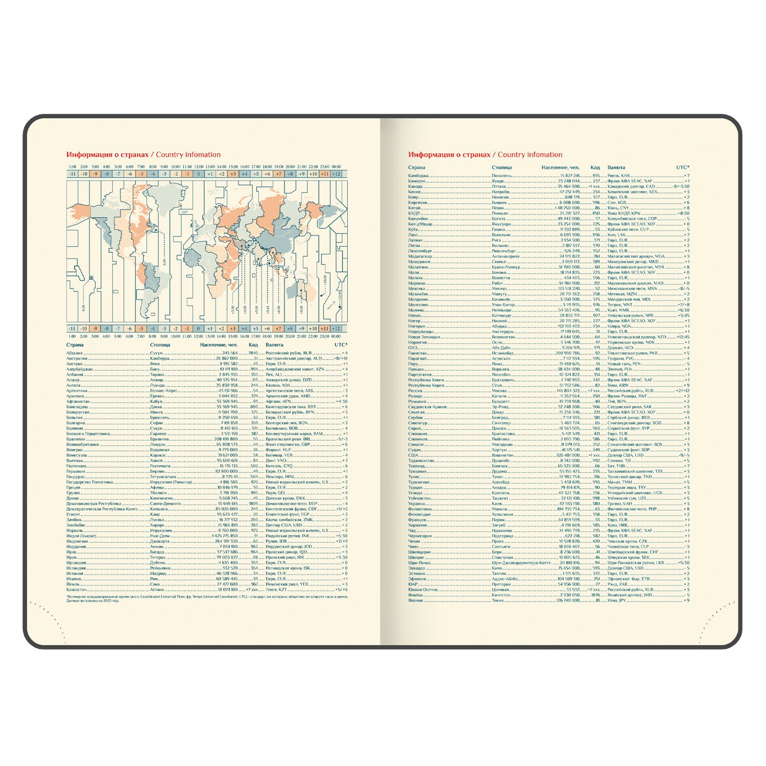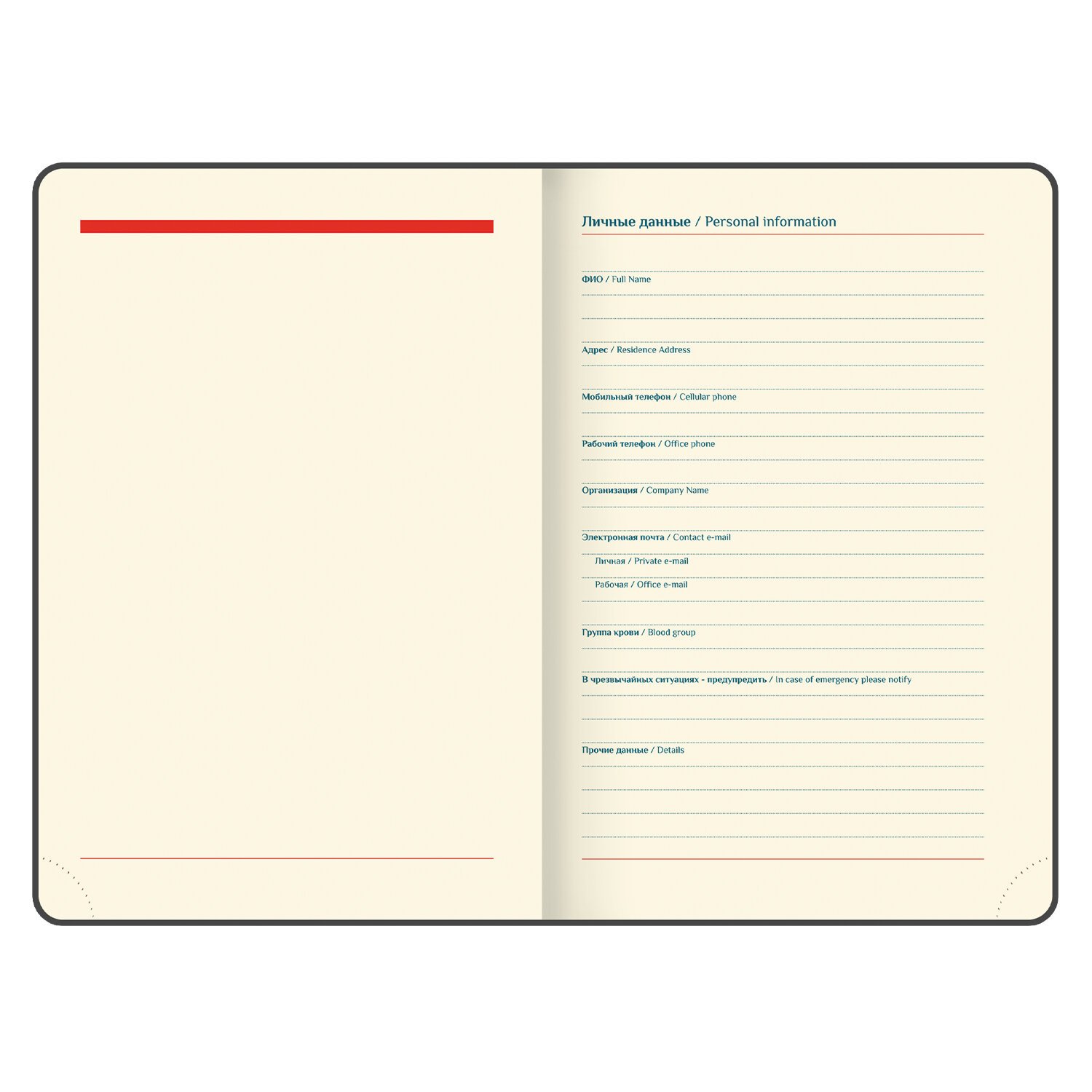 Внутренний блок включает 168 листов кремовой бумаги плотностью 70 г/м2. Каждая страничка имеет перфорированный угол. Благодаря небольшому формату B6 (125х173 мм) ежедневник удобно использовать как в офисе, так и на выездных деловых встречах. Твердая обложка стилизована под текстурную кожу. Материал обложки подходит для горячего тиснения.