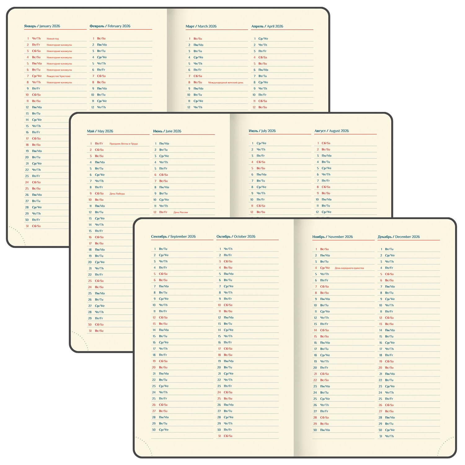 Дополнением является закладка-ляссе, с помощью которой при необходимости можно быстро открыть ежедневник на нужной странице, а также вырубка по месяцам. Помимо прочего, ежедневник снабжен обширным справочным материалом. В конце ежедневника есть 6 страниц для записей и заметок.
