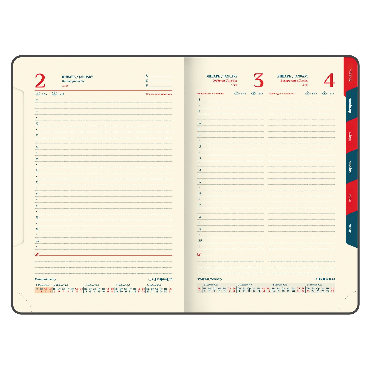 Внутренний блок включает 168 листов кремовой бумаги плотностью 70 г/м2. Каждая страничка имеет перфорированный угол. Благодаря небольшому формату B6 (125х173 мм) ежедневник удобно использовать как в офисе, так и на выездных деловых встречах. Твердая обложка стилизована под текстурную кожу. Материал обложки подходит для горячего тиснения.