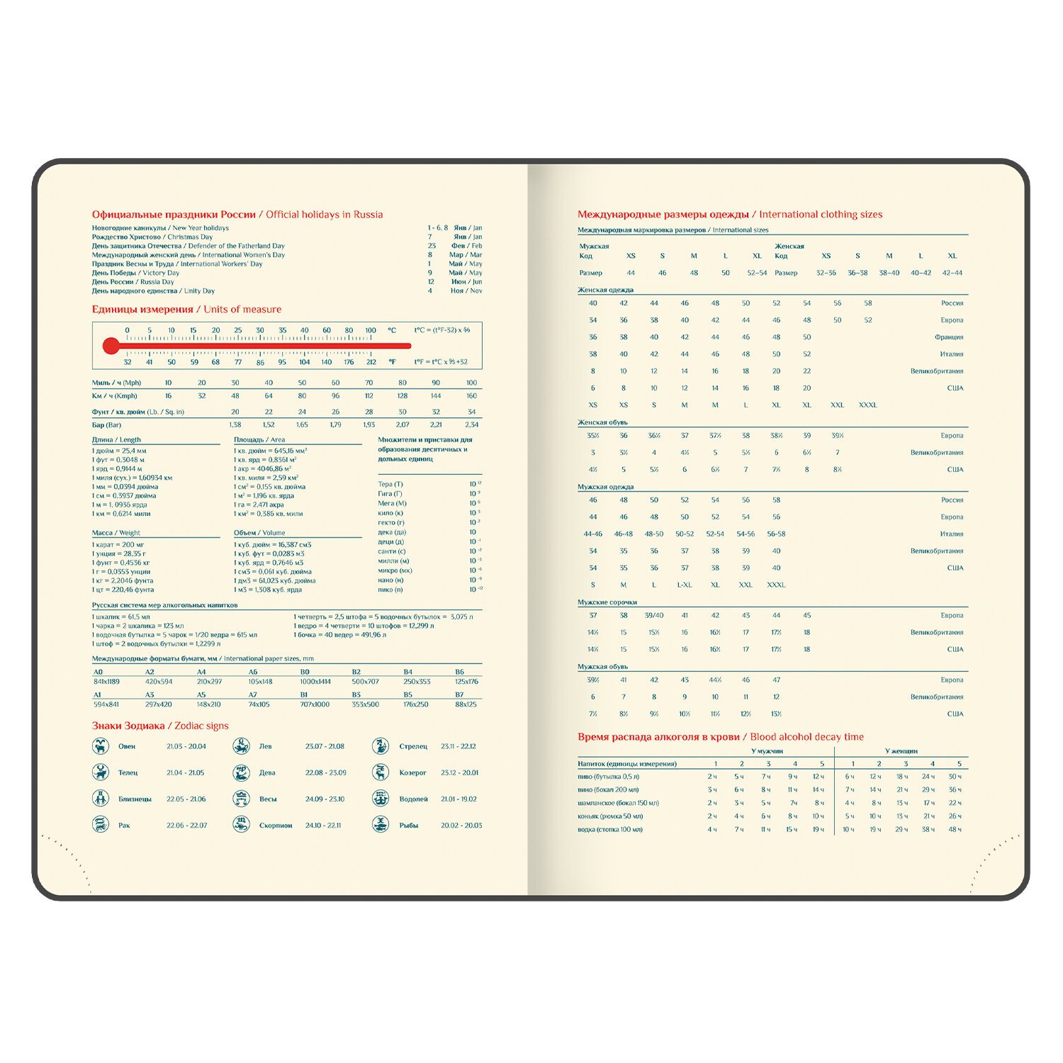 Дополнением является закладка-ляссе, с помощью которой при необходимости можно быстро открыть ежедневник на нужной странице, а также вырубка по месяцам. Помимо прочего, ежедневник снабжен обширным справочным материалом. В конце ежедневника есть 6 страниц для записей и заметок.