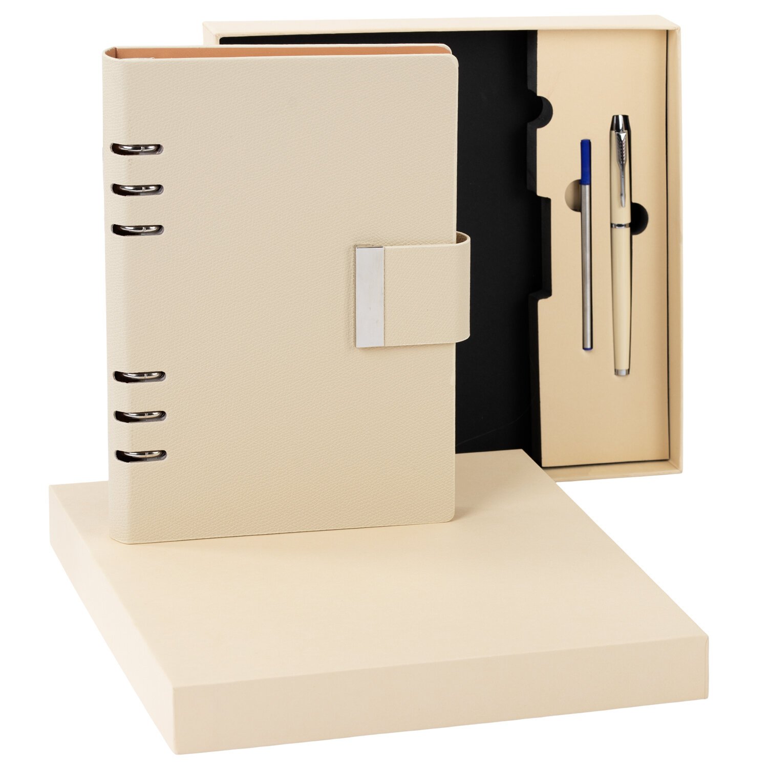 Подарочный набор включает в себя недатированный ежедневник на кольцах с внутренним блоком из 100 листов кремовой бумаги плотностью 70 г/м2. Благодаря классическому формату А5 (165x229 мм) ежедневник удобно использовать как в офисе, так и на выездных деловых встречах. Твердая обложка стилизована под текстурную кожу. Ежедневник фиксируется магнитной застежкой, поэтому не откроется в сумке или портфеле и страницы не помнутся. Также в набор входит ручка со стильным корпусом в тон ежедневника и высококачественными чернилами. Сменный стержень в комплекте позволит дольше наслаждаться мягким письмом. Набор упакован в плотную подарочную картонную коробку. Все элементы набора выполнены в одном цвете.