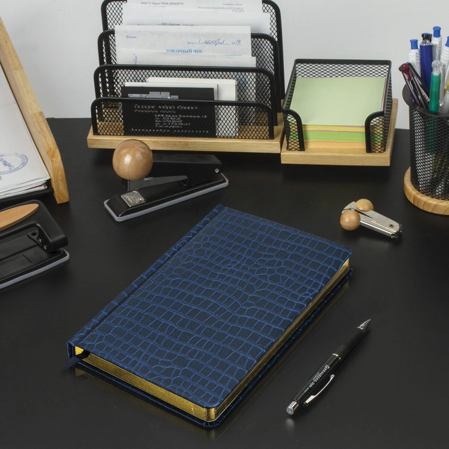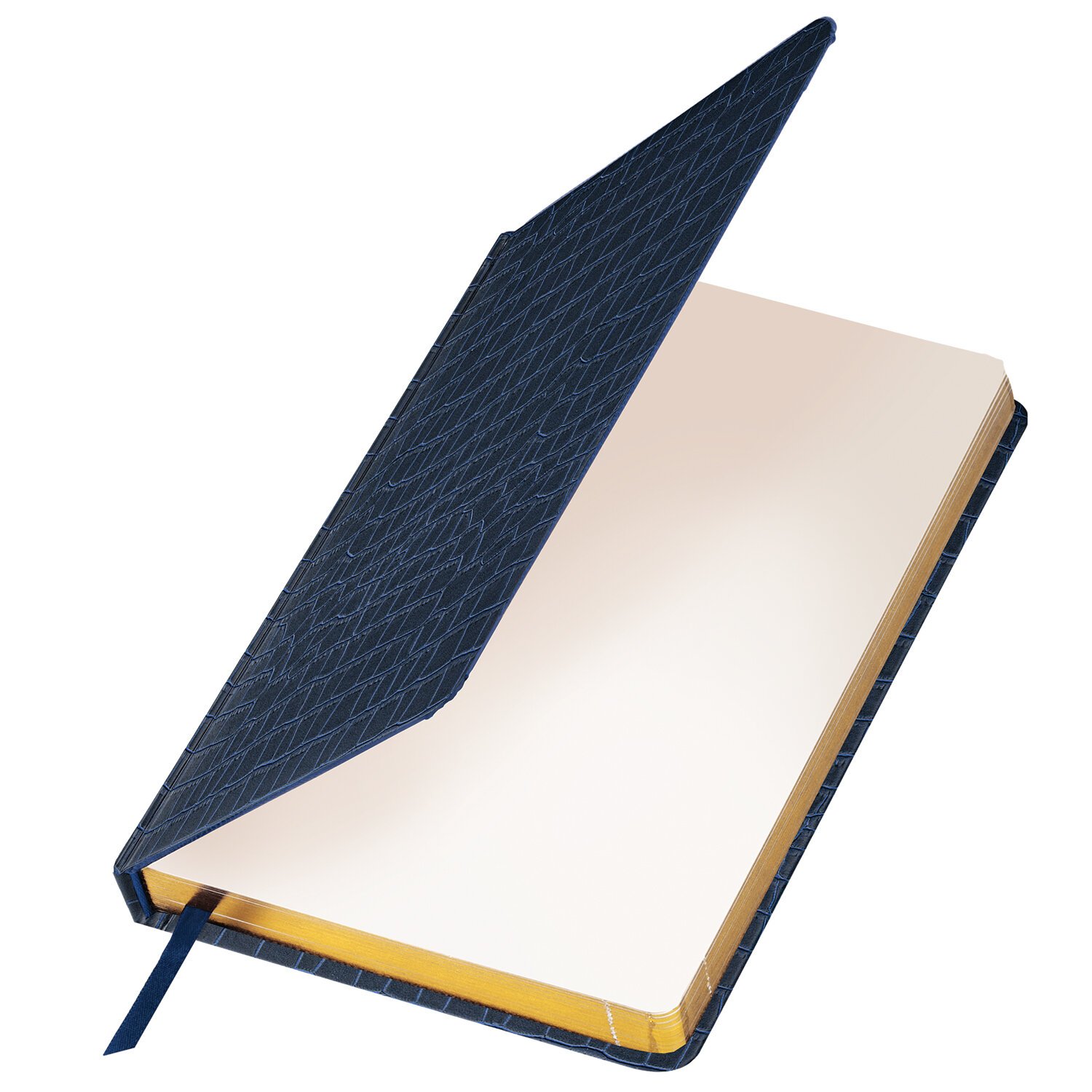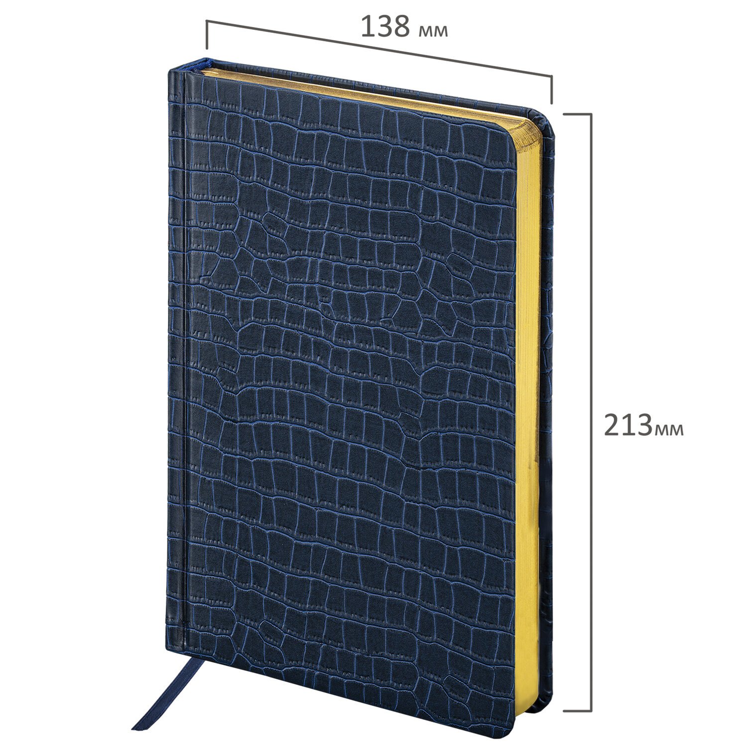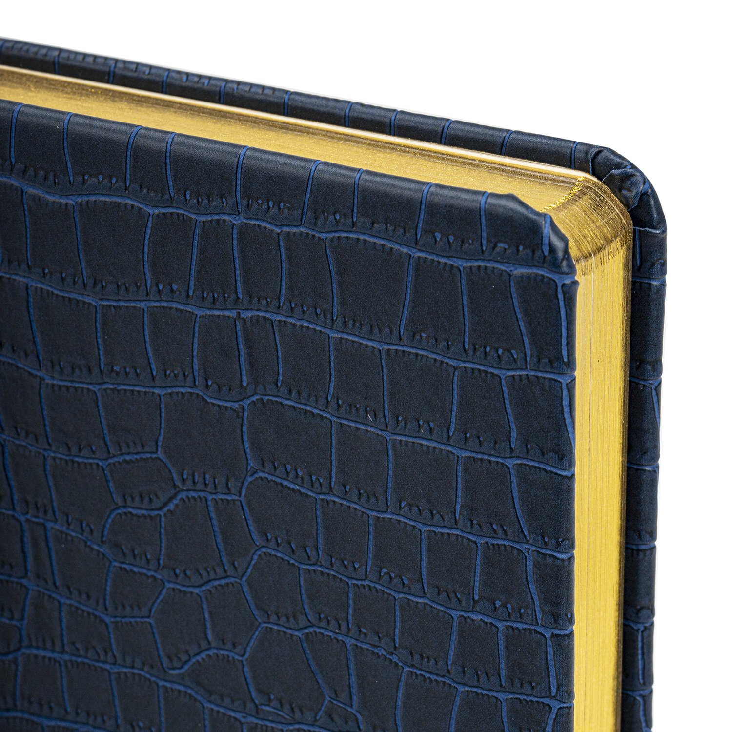 Внутренний блок включает 160 листов тонированной бумаги плотностью 70 г/м2. Каждая страничка имеет перфорированный угол. Благодаря стандартному формату А5 ежедневник удобно использовать как в офисе, так и на выездных деловых встречах. Твердая обложка, стилизованная под кожу крокодила, подходит для горячего тиснения. Срез ежедневника фольгирован под "золото", что придает ему особый шарм.