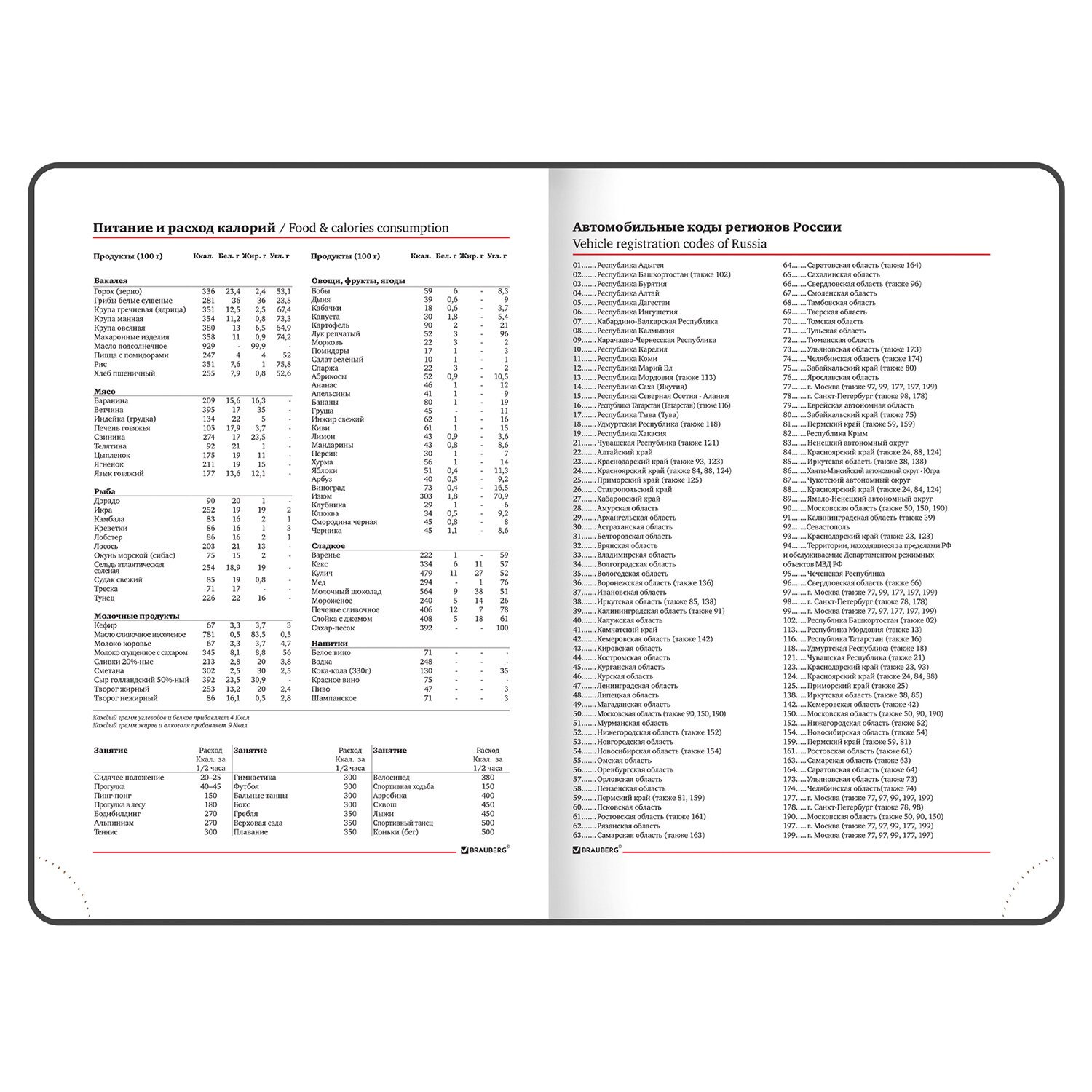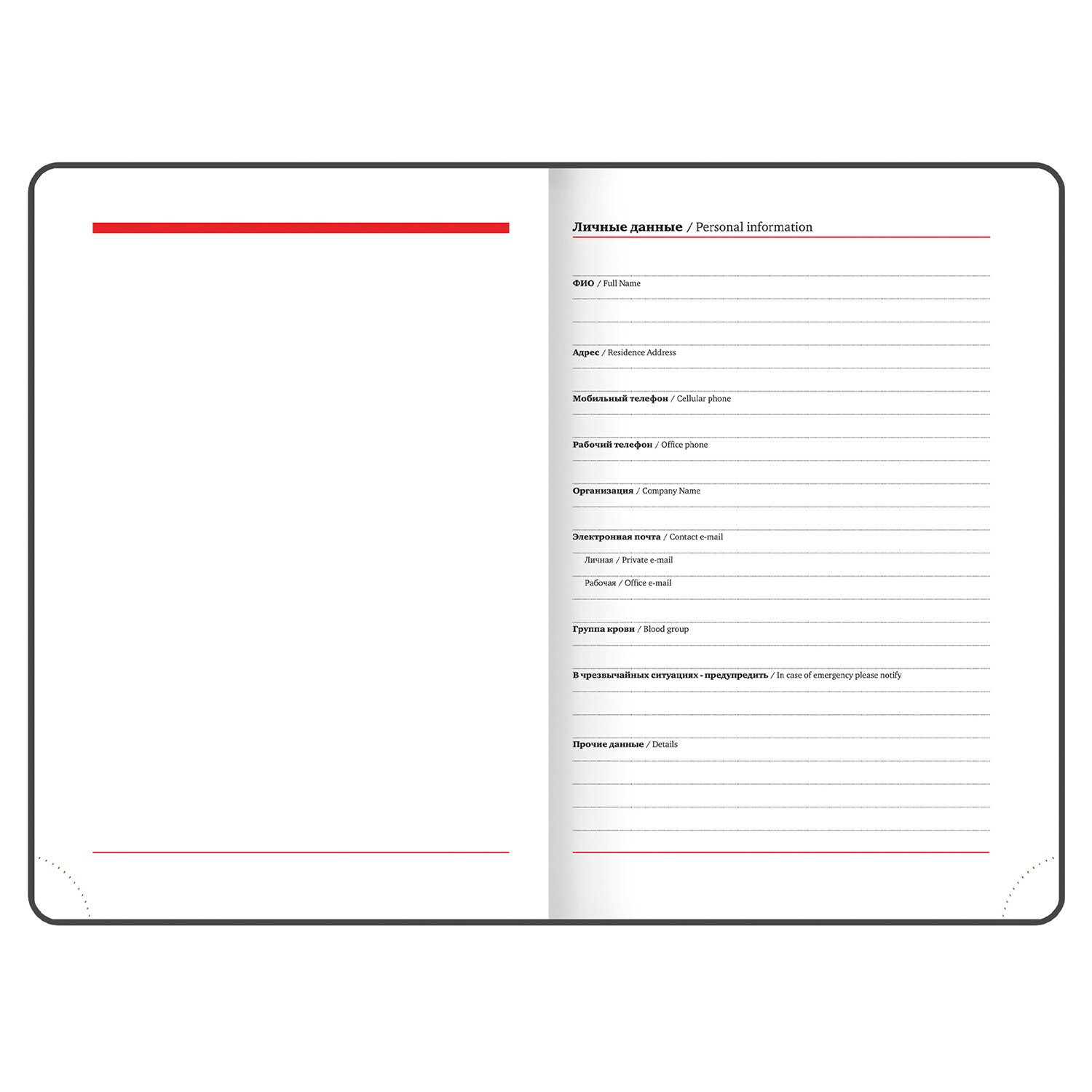 Срез и форзац ежедневника окрашены на контрасте с цветом обложки, что придает ему особый шарм. Дополнением является закладка-ляссе, с помощью которой при необходимости можно быстро открыть ежедневник на нужной странице. Помимо прочего ежедневник снабжен обширным справочным материалом. В конце ежедневника есть 3 страницы для записей и заметок.