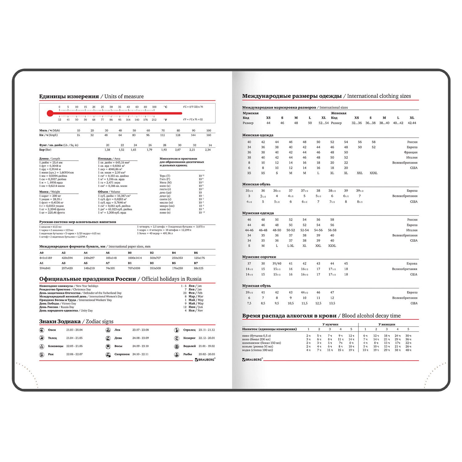 Внутренний блок включает 160 листов белой бумаги плотностью 70 г/м2. Каждая страничка имеет перфорированный угол. Благодаря стандартному формату А5 ежедневник удобно использовать как в офисе, так и на выездных деловых встречах.