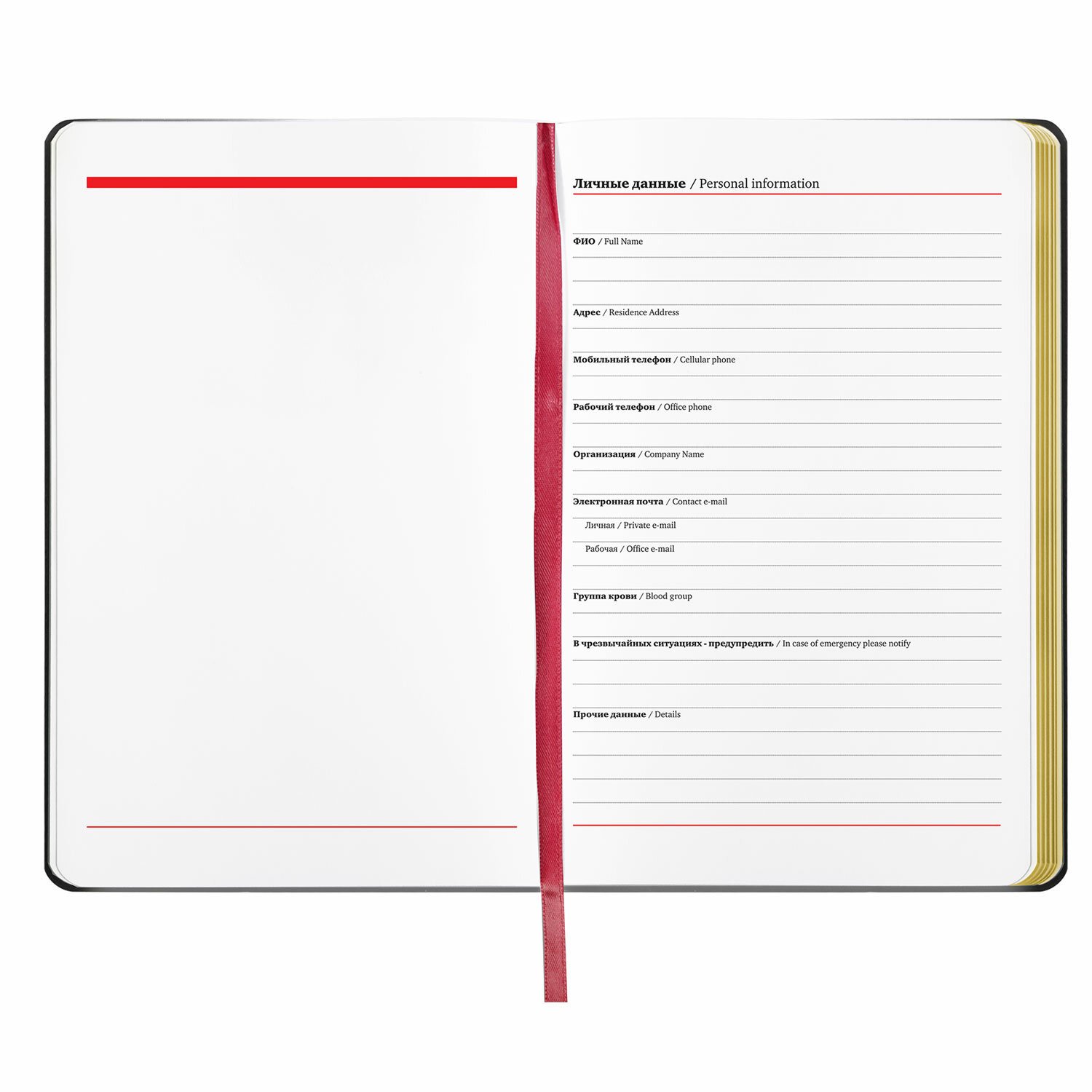 Срез ежедневника прокрашен, что придает ему особый шарм. Дополнением является закладка-ляссе, с помощью которой можно быстро открыть ежедневник на нужной странице. Помимо прочего ежедневник снабжен справочным материалом. В конце ежедневника есть 3 страницы для записей и заметок.