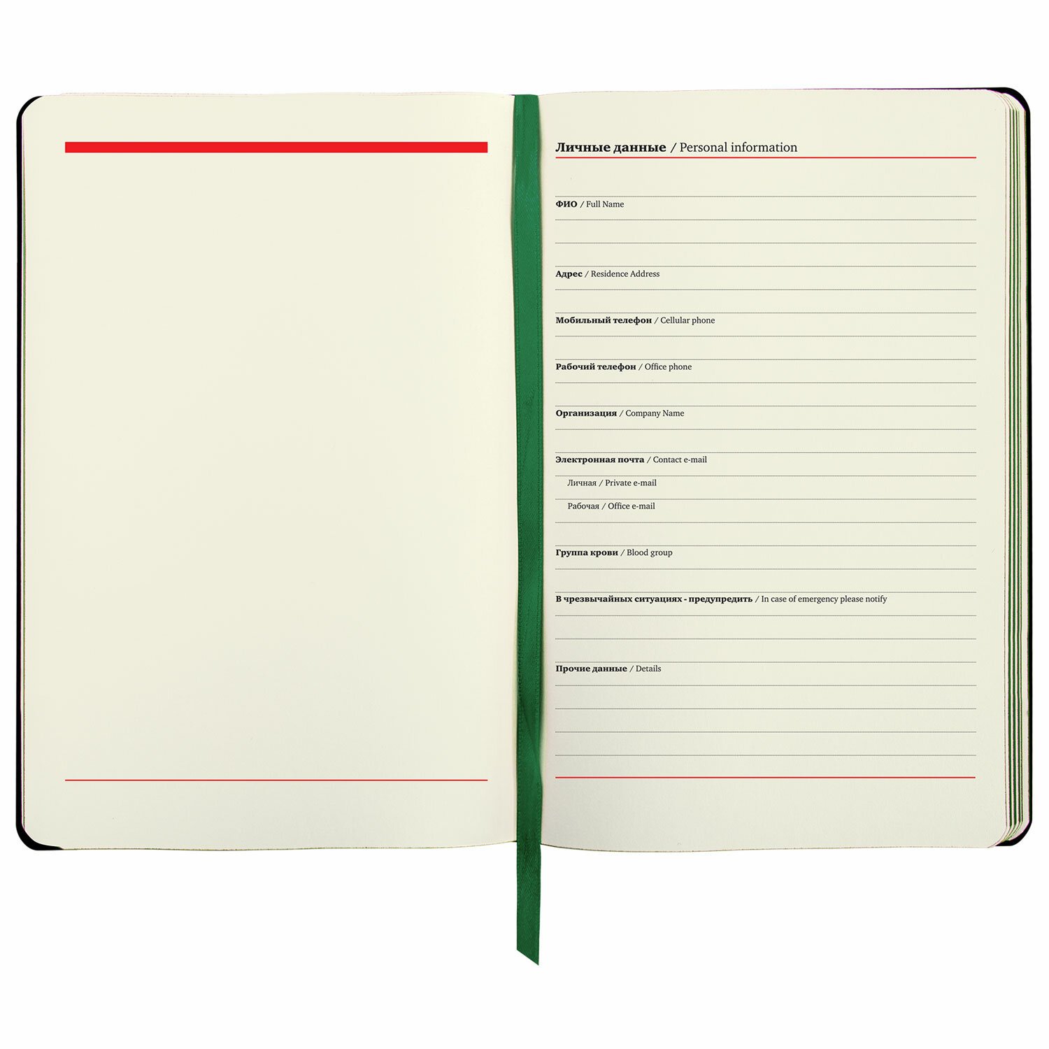Срез ежедневника прокрашен, что придает ему особый шарм. Дополнением является закладка-ляссе, с помощью которой можно быстро открыть ежедневник на нужной странице. Помимо прочего ежедневник снабжен справочным материалом. В конце ежедневника есть 3 страницы для записей и заметок.