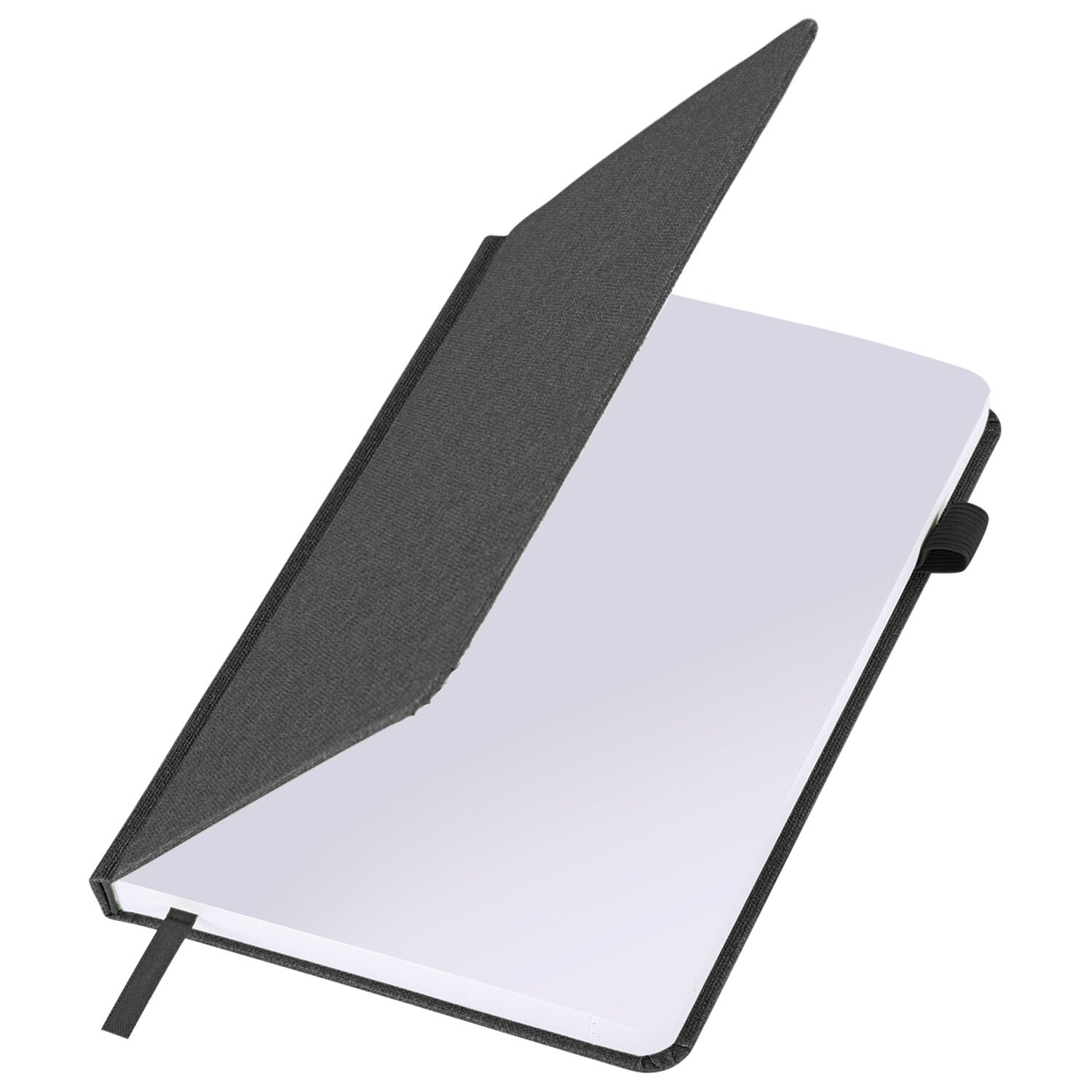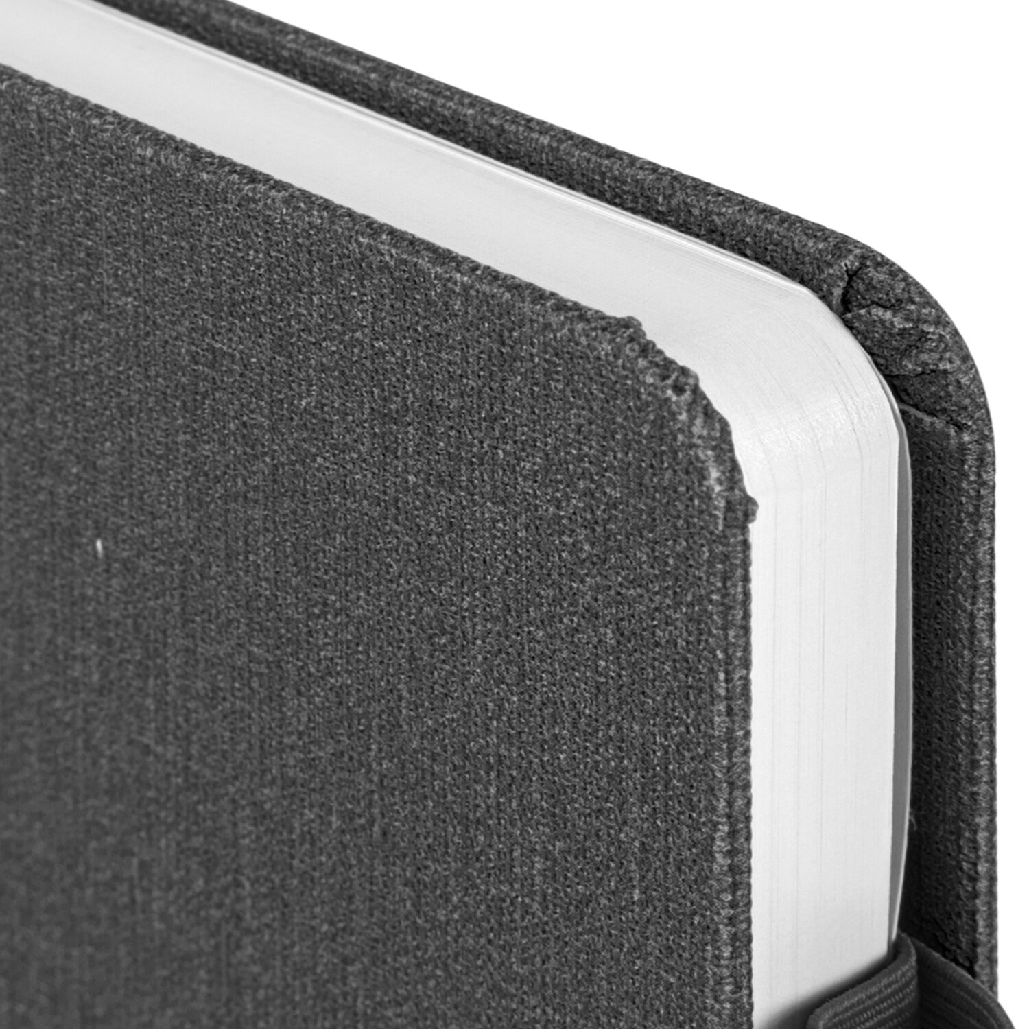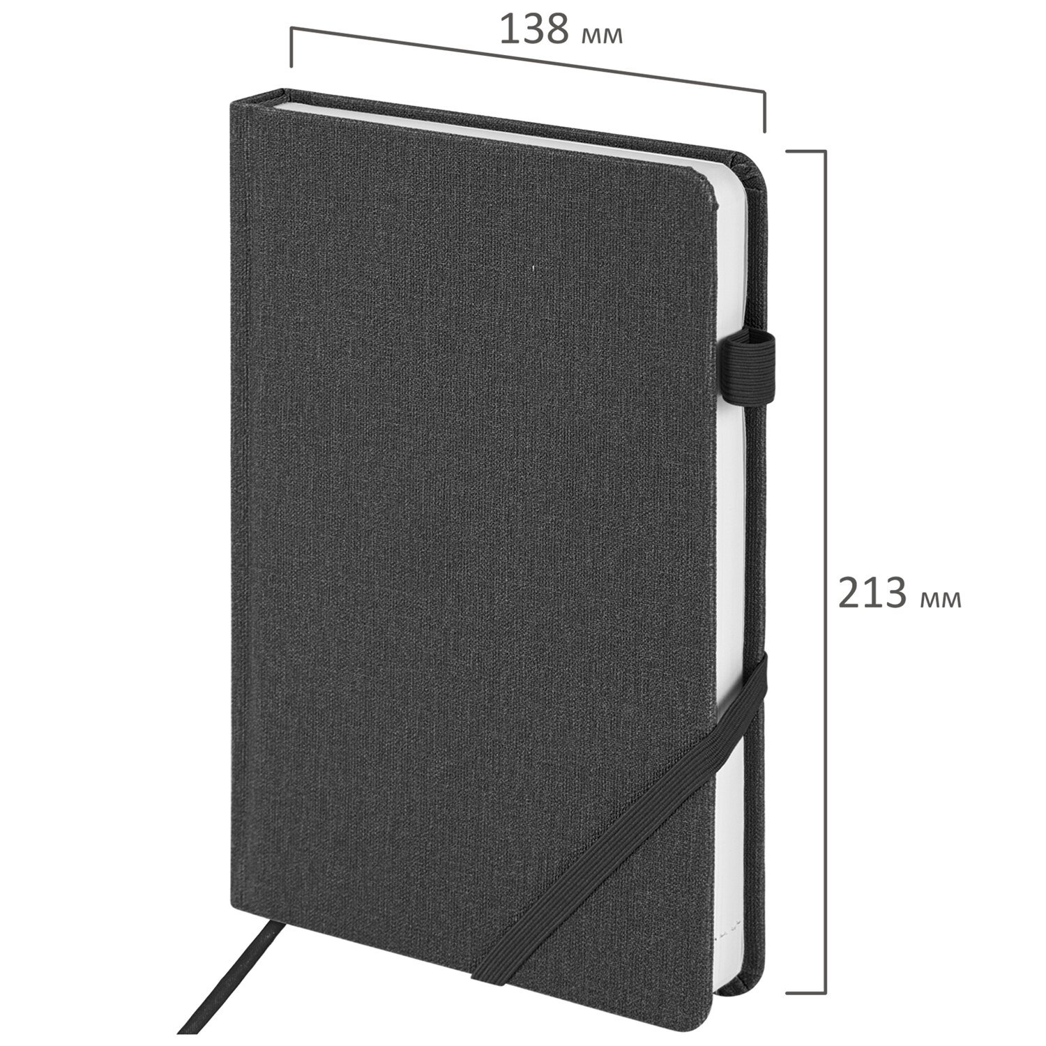 Внутренний блок включает 136 листов белой бумаги плотностью 70 г/м2. Каждая страничка имеет перфорированный угол. Благодаря стандартному формату А5 ежедневник удобно брать с собой. Твердая обложка, стилизованная под ткань, подходит для горячего тиснения. Снабжен резинкой-фиксатором, благодаря чему ежедневник не откроется в сумке или портфеле.