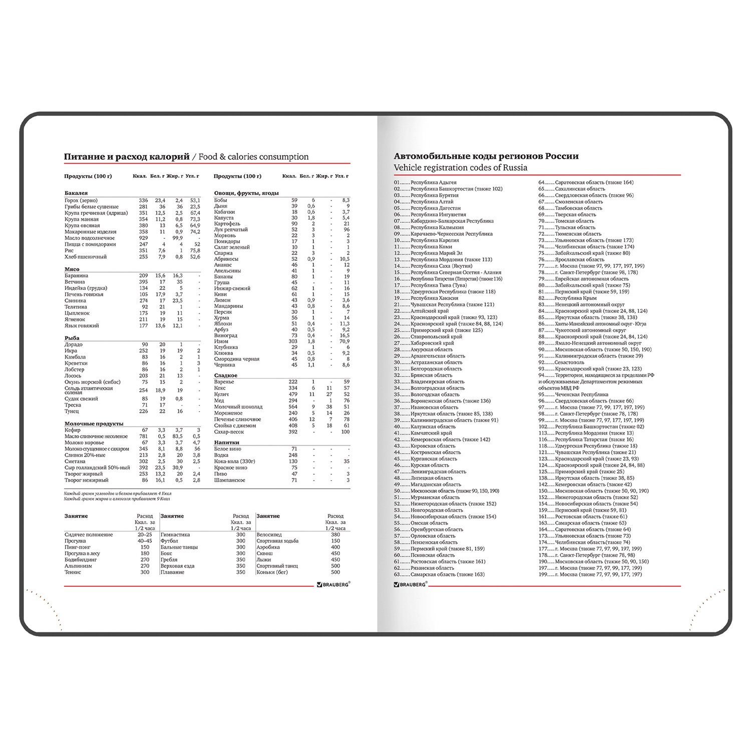 Форзац ежедневника представлен картами мира и России. Дополнением является закладка-ляссе, с помощью которой при необходимости можно быстро открыть ежедневник на нужной странице и держатель для ручки. Помимо прочего ежедневник снабжен справочным материалом. В конце ежедневника есть 3 страницы для записей и заметок.