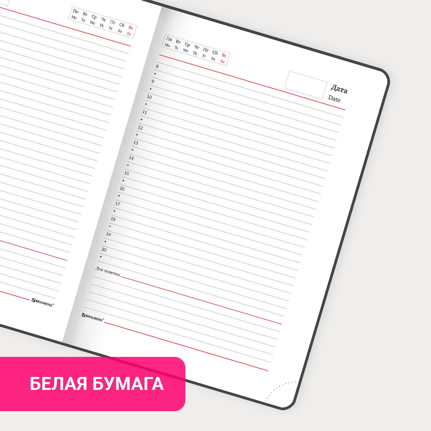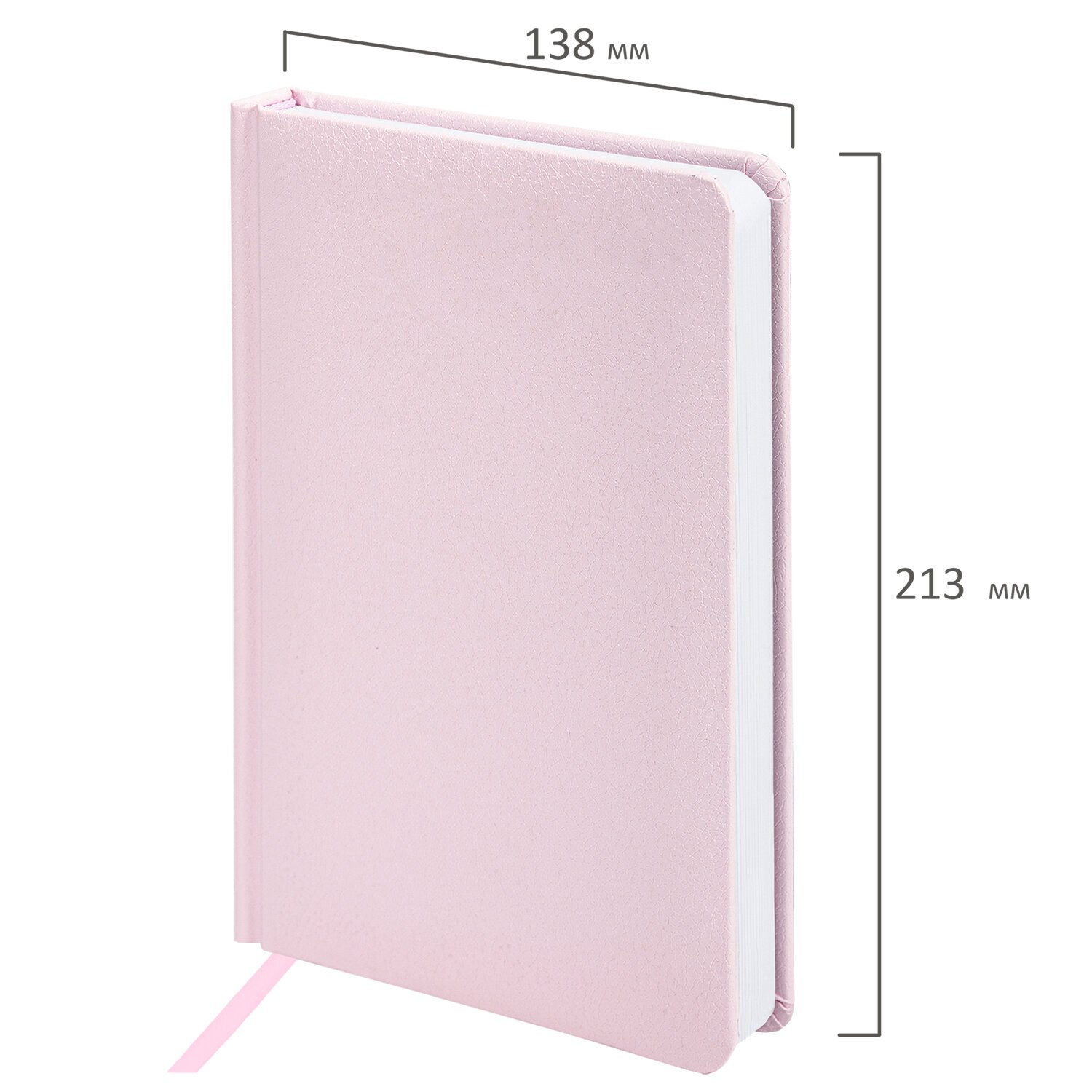 Внутренний блок включает 136 листов белой бумаги плотностью 70 г/м2. Каждая страничка имеет перфорированный угол. Благодаря стандартному формату А5 (138х213 мм) ежедневник удобно использовать как в офисе, так и на выездных деловых встречах. Жесткая книжная обложка с легкой рельефной фактурой напоминает натуральную кожу. Материал обложки, балакрон, подходит для тиснения только фольгой.