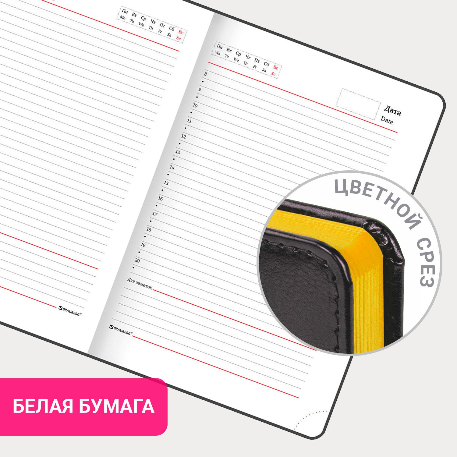 Срез и форзац ежедневника окрашены на контрасте с цветом обложки, что придает ему особый шарм. Дополнением является закладка-ляссе, с помощью которой при необходимости можно быстро открыть ежедневник на нужной странице. Помимо прочего ежедневник снабжен обширным справочным материалом. В конце ежедневника есть 3 страницы для записей и заметок.