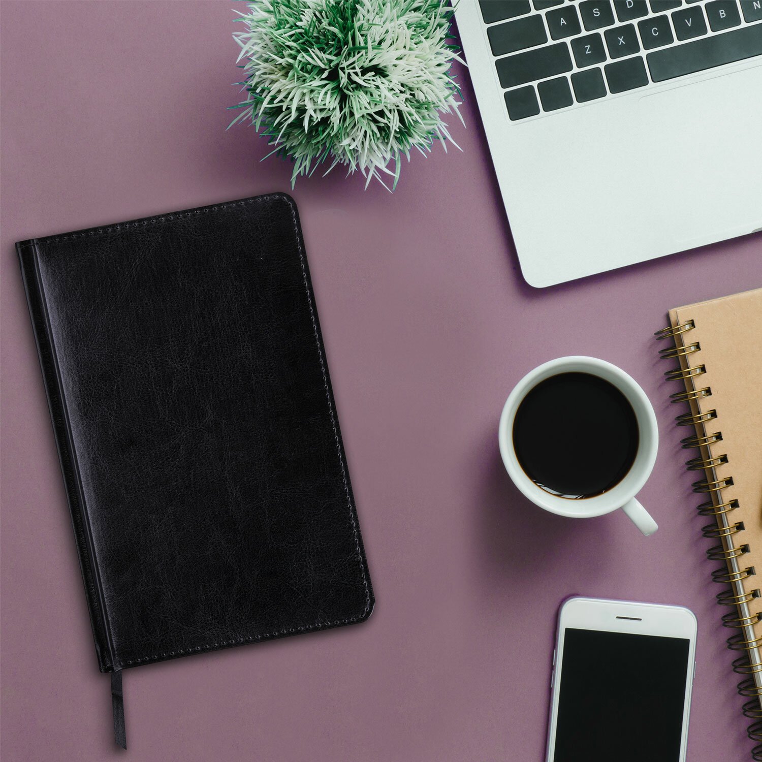 Внутренний блок включает 136 листов белой бумаги плотностью 70 г/м2. Каждая страничка имеет перфорированный угол. Благодаря стандартному формату А5 (138х213 мм) ежедневник удобно использовать как в офисе, так и на выездных деловых встречах. Твердая обложка стилизована под гладкую кожу. Подходит для горячего тиснения.