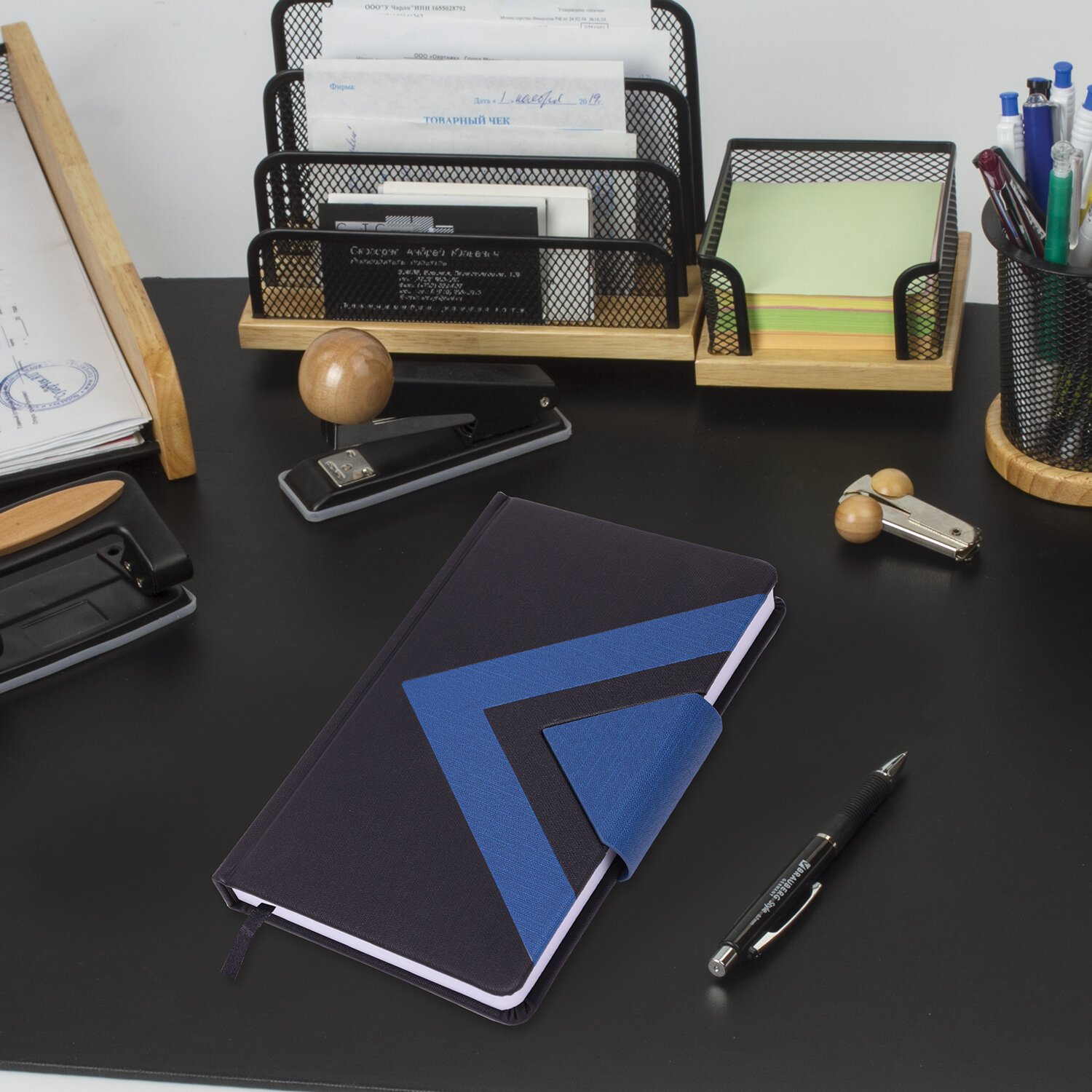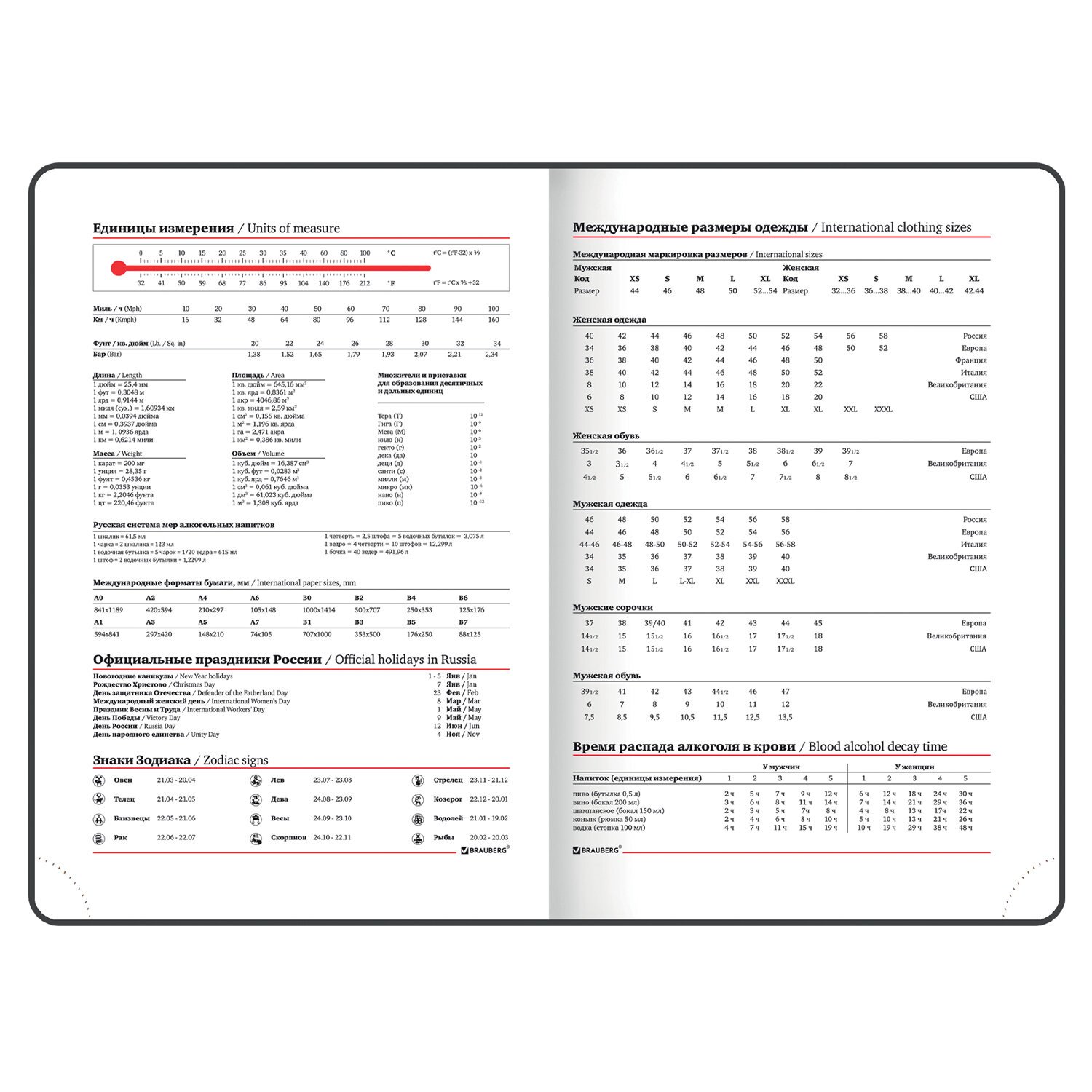 Форзац ежедневника представлен картами мира и России. Дополнением является закладка-ляссе, с помощью которой при необходимости можно быстро открыть ежедневник на нужной странице. Помимо прочего ежедневник снабжен справочным материалом. В конце ежедневника есть 7 страниц для записей и заметок. Выполнен в комбинации из двух цветов - синий и черный.