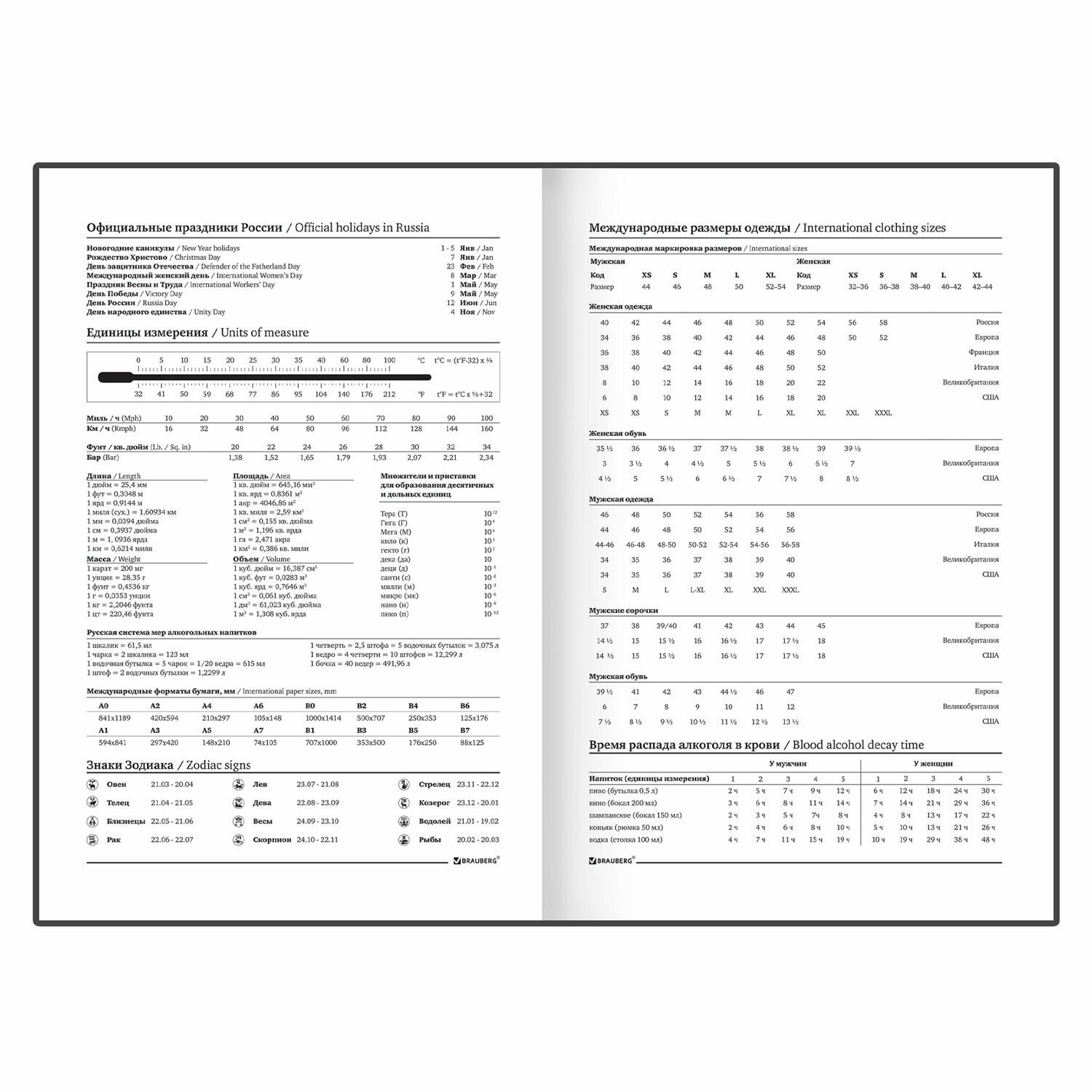 Внутренний блок содержит 160 листов офсетной бумаги плотностью 60 г/м2. Обложка из бумвинила и твердый переплет обеспечивают долгий срок службы. Ежедневник содержит коды городов и телефонную книгу. В конце имеются 8 страниц для записей и заметок.