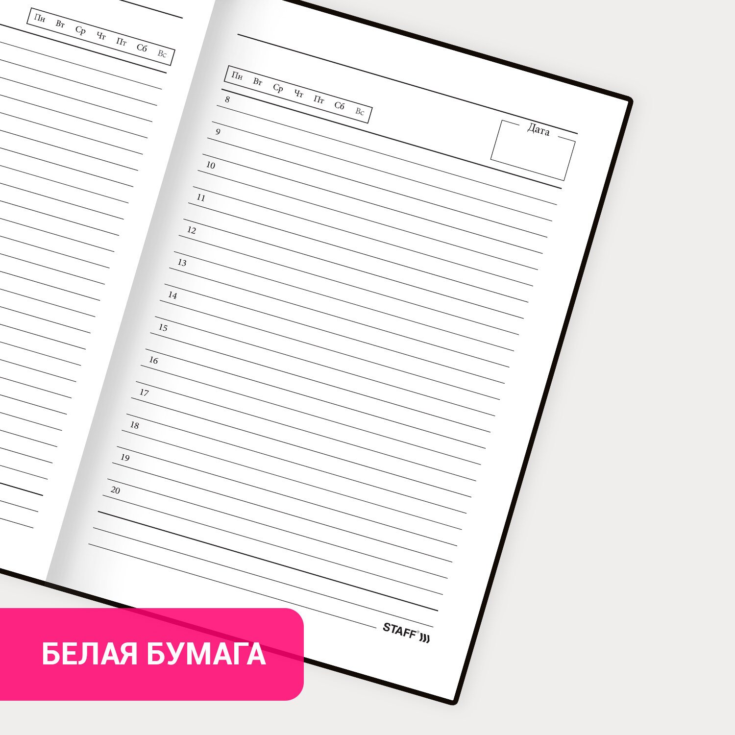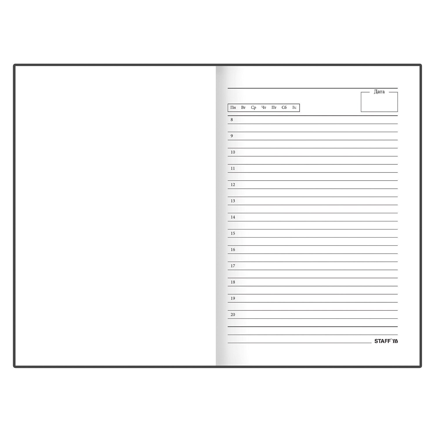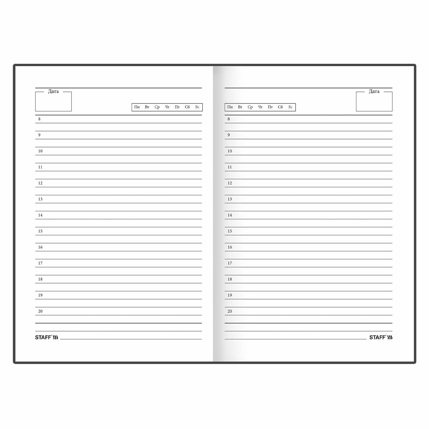 Недатированный ежедневник STAFF предназначен для ведения записей. Отсутствие дат делает его уникальным товаром, которым можно начать пользоваться в любое время года.