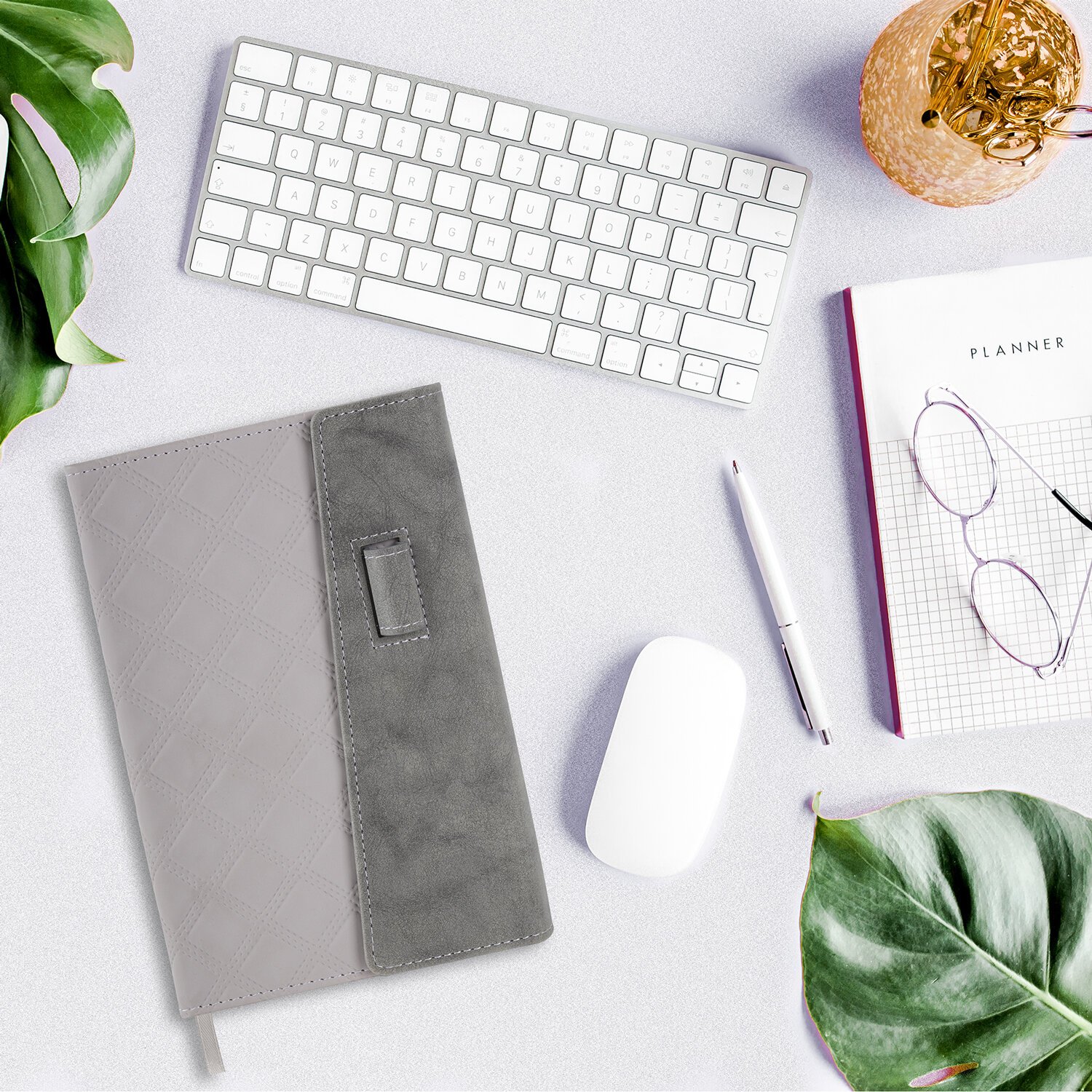 Внутренний блок включает 160 листов белой бумаги плотностью 70 г/м2. Каждая страница имеет перфорированный угол. Благодаря стандартному формату А5 (145х215 мм) ежедневник удобно использовать как в офисе, так и на выездных деловых встречах.