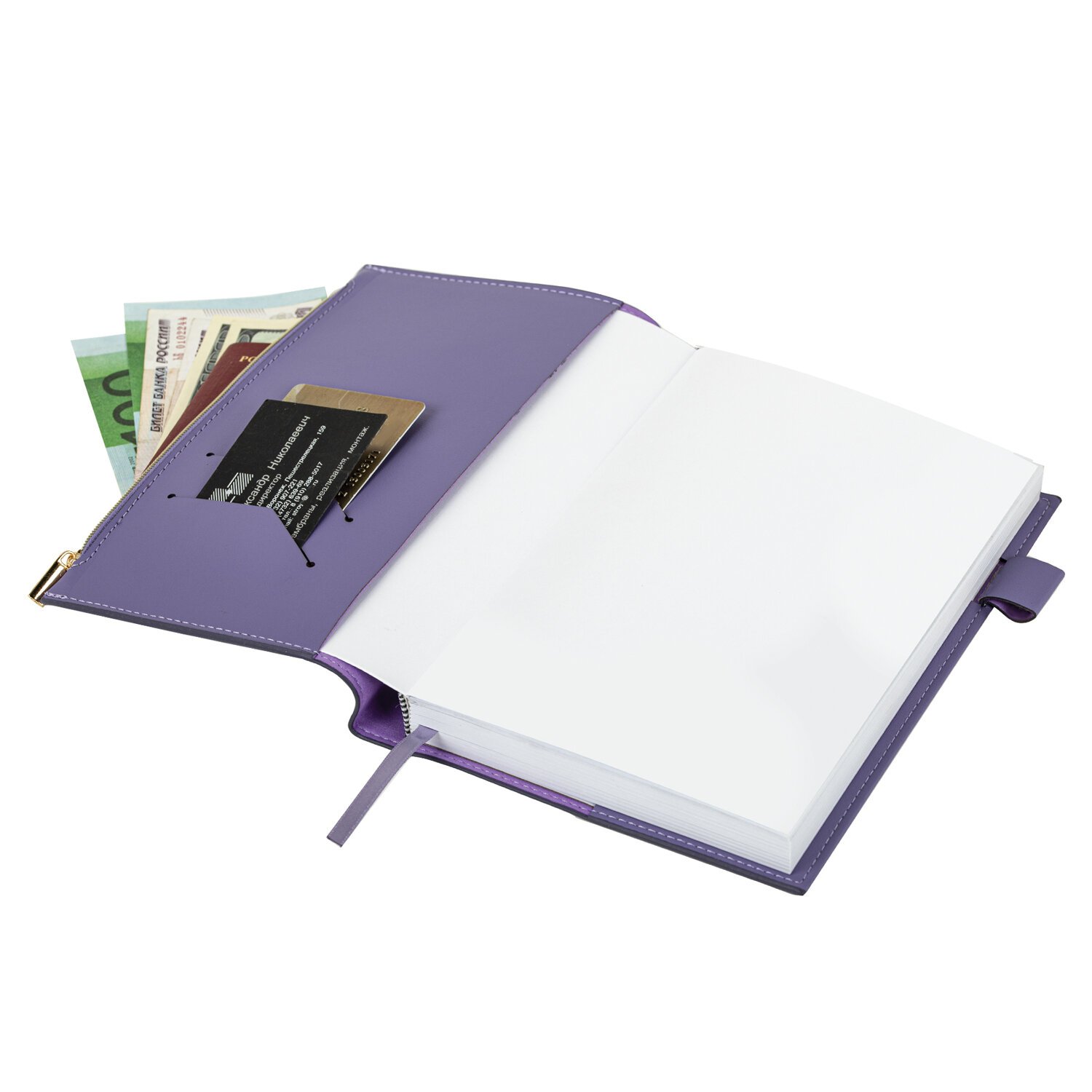 Съемная гибкая обложка стилизована под гладкую кожу. Подходит для горячего тиснения. Особенностью данного ежедневника являются большой карман на молнии и небольшие кармашки для визитных карточек с внутренней стороны обложки. Дополнением являются закладка-ляссе, с помощью которой при необходимости можно быстро открыть нужную страницу, а также держатель для ручки для большего комфорта. Ежедневник снабжен обширным справочным материалом. В конце имеются 7 страниц для записей и заметок.
