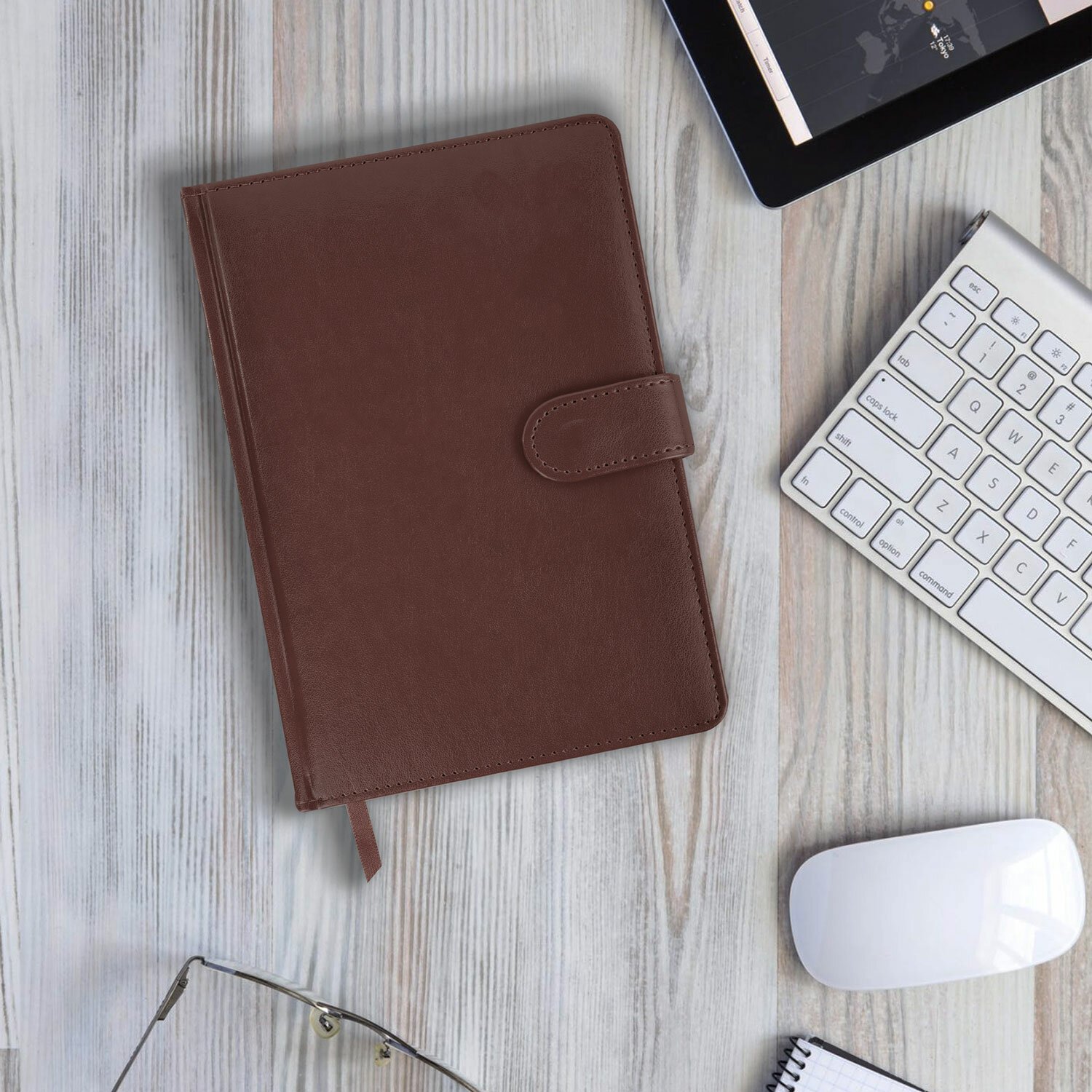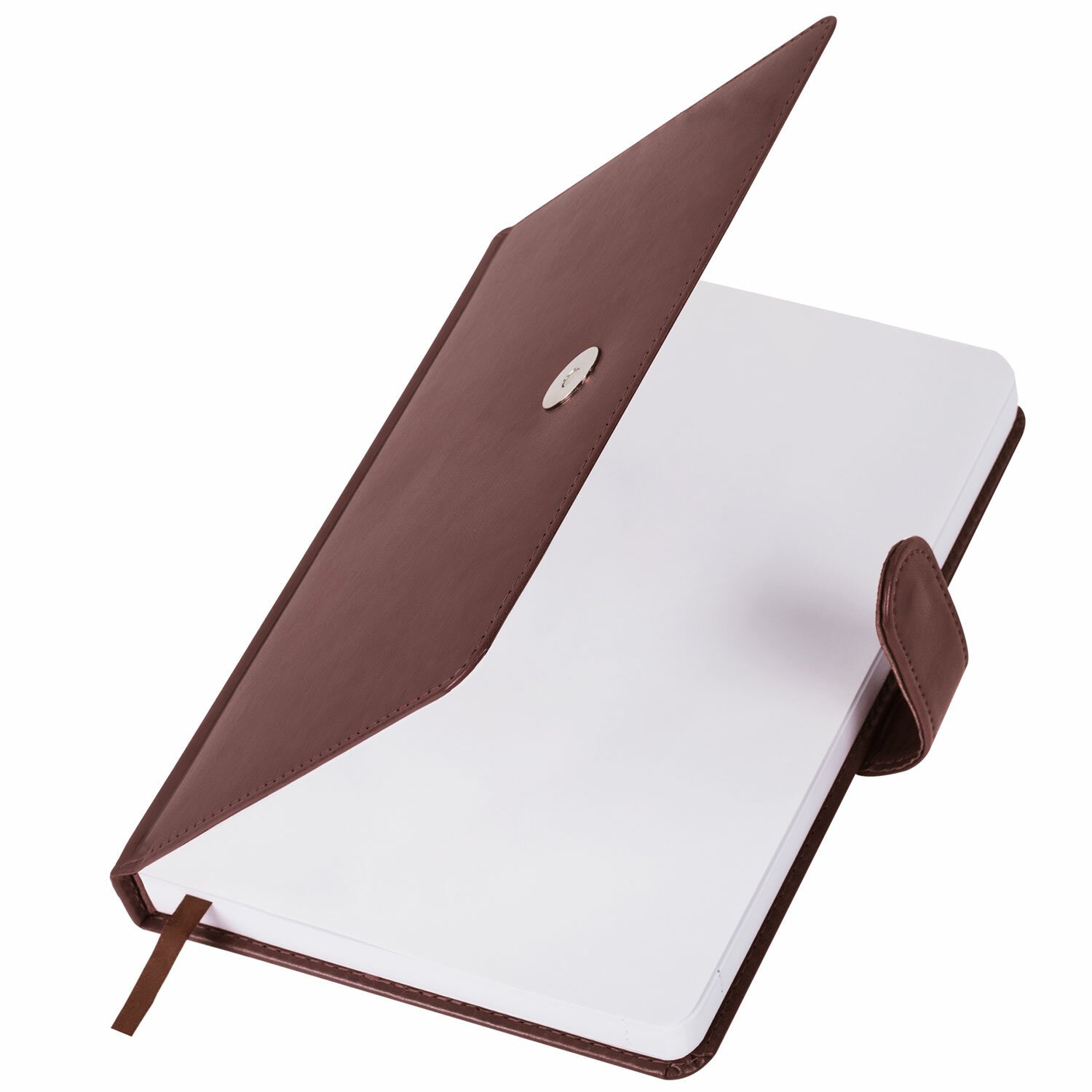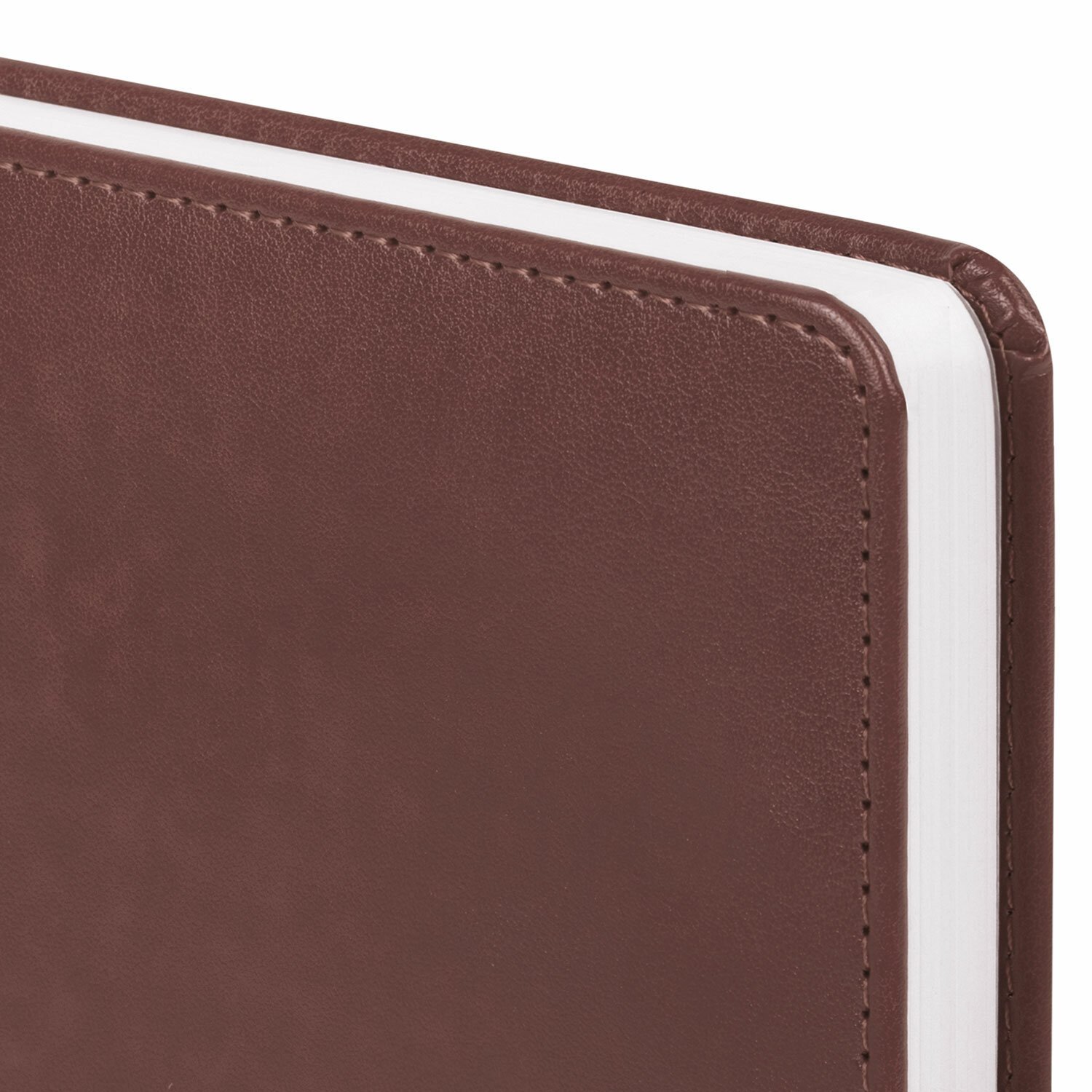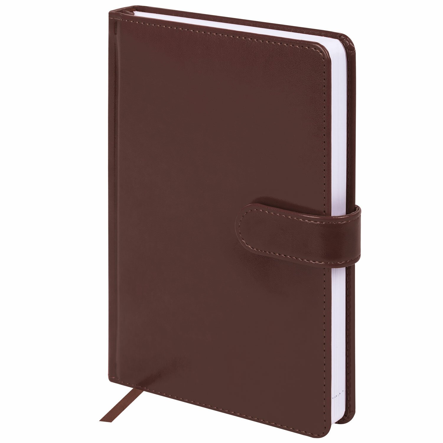 Внутренний блок включает 160 листов белой бумаги плотностью 70 г/м2. Каждая страничка имеет перфорированный угол. Твердая обложка, прошитая по периметру и стилизованная под гладкую кожу фиксируется магнитной застежкой, поэтому ежедневник не откроется в сумке или портфеле и страницы не помнутся.