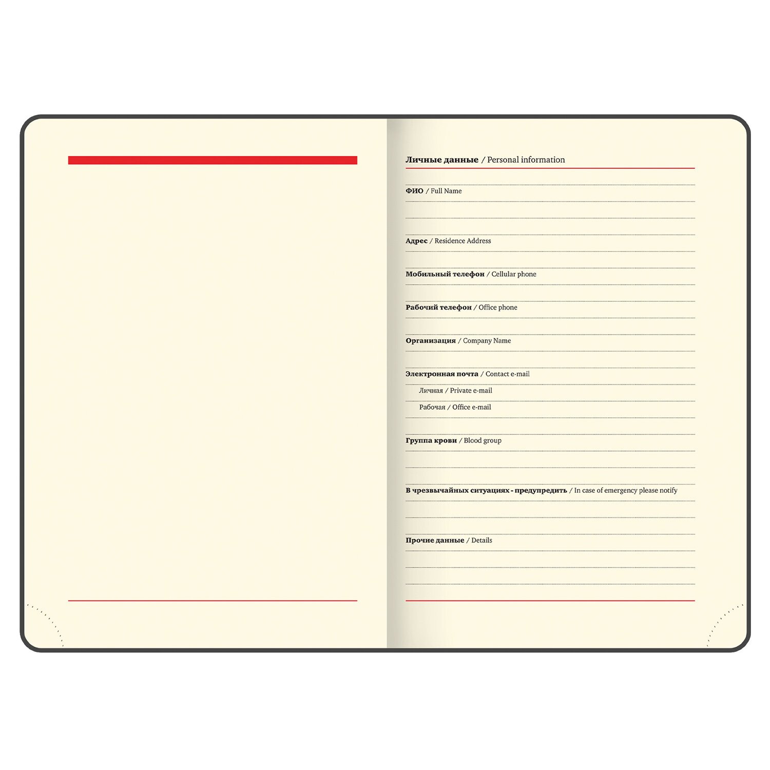 Срез ежедневника окрашен в цвет обложки, что придает ему особый шарм. Дополнением является закладка-ляссе, с помощью которой можно быстро открыть ежедневник на нужной странице. Помимо прочего ежедневник снабжен справочным материалом. В конце ежедневника есть 3 страницы для записей и заметок.