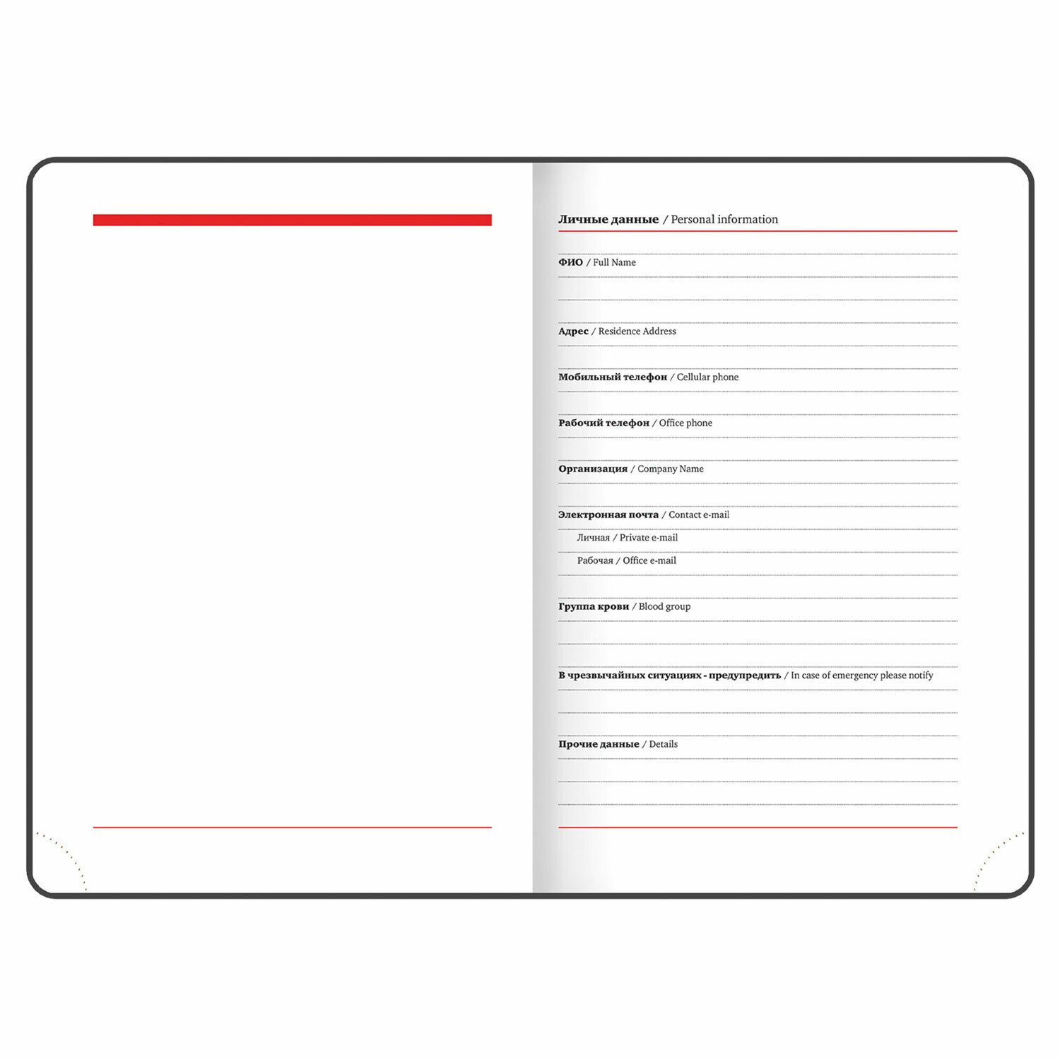 Внутренний блок включает 136 листов белой бумаги плотностью 70 г/м2. Благодаря стандартному формату А5 ежедневник удобно использовать как в офисе, так и на выездных деловых встречах. Твердая (книжная) обложка с полноцветной печатью и тиснением золотой фольгой делает ежедневник неповторимым и запоминающимся.